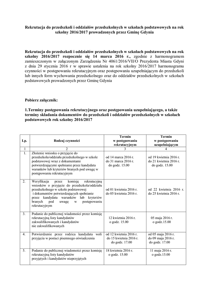 Rekrutacja do przedszkoli i oddziałów przedszkolnych w szkołach podstawowych na rok szkolny 2016/2017 prowadzonych przez Gminę Gdynia Rekrutacja do przedszkoli i oddziałów przedszkolnych w szkołach podstawowych na rok szkolny 2016/2017 rozpocznie się 14 marca 2016 r., zgodnie z harmonogramem zamieszczonym w załączonym Zarządzeniu Nr 4061/2016/VII/O Prezydenta Miasta Gdyni z dnia 29 stycznia 2016 r w sprawie ustalenia na rok szkolny 2016/2017 harmonogramu czynności w postępowaniu rekrutacyjnym oraz postępowaniu uzupełniającym do przedszkoli lub innych form wychowania przedszkolnego oraz do oddziałów przedszkolnych w szkołach podstawowych prowadzonych przez Gminę Gdynia Pobierz załącznik: 1.Terminy postępowania rekrutacyjnego oraz postępowania uzupełniającego, a także terminy składania dokumentów do przedszkoli i oddziałów przedszkolnych w szkołach podstawowych rok szkolny 2016/2017 Lp. 1 1. 2. 3. Rodzaj czynności Termin w postępowaniu rekrutacyjnym 3 Termin w postępowaniu uzupełniającym 4 2 Złożenie wniosku o przyjęcie do przedszkola/oddziału przedszkolnego w szkole podstawowej wraz z dokumentami potwierdzającymi spełnianie przez kandydata warunków lub kryteriów branych pod uwagę w postępowaniu rekrutacyjnym od 14 marca 2016 r. do 31 marca 2016 r. do godz. 15.00 od 19 kwietnia 2016 r. do 21 kwietnia 2016 r. do godz. 15.00 Weryfikacja przez komisję rekrutacyjną wniosków o przyjęcie do przedszkola/oddziału przedszkolnego w szkole podstawowej i dokumentów potwierdzających spełnianie przez kandydata warunków lub kryteriów branych pod uwagę w postępowaniu rekrutacyjnym od 01 kwietnia 2016 r. do 05 kwietnia 2016 r. od 22 kwietnia 2016 r. do 25 kwietnia 2016 r. Podanie do publicznej wiadomości przez komisję rekrutacyjną listy kandydatów zakwalifikowanych i kandydatów nie zakwalifikowanych 12 kwietnia 2016 r. o godz. 15.00 05 maja 2016 r. o godz.15.00 od 05 maja 2016 r. do 09 maja 2016 r. do godz. 17.00 4. Potwierdzenie przez rodzica kandydata woli przyjęcia w postaci pisemnego oświadczenia od 12 kwietnia 2016 r. do 15 kwietnia 2016 r. do godz. 17.00 5. Podanie do publicznej wiadomości przez komisję rekrutacyjną listy kandydatów przyjętych i kandydatów nieprzyjętych 18 kwietnia 2016 r. o godz. 15.00 11 maja 2016 r. o godz.15.00 2. Ustala się następujące kryteria i ich wartość punktową w postępowaniu rekrutacyjnym drugiego etapu do przedszkoli i oddziałów przedszkolnych zorganizowanych w szkołach podstawowych prowadzonych przez Gminę Miasta Gdynia : 1) dziecko zamieszkujące w obwodzie szkoły podstawowej z oddziałami przedszkolnymi, do której o przyjęcie ubiega się - 55 pkt. - kryterium dotyczy tylko oddziałów przedszkolnych w szkole podstawowej; 2) dziecko obojga rodziców (opiekunów prawnych) pracujących bądź studiujących w trybie stacjonarnym lub uczących się w systemie dziennym - 20 pkt.; 3) dziecko, którego rodzeństwo będzie rozpoczynało lub kontynuowało edukację w przedszkolu/oddziale przedszkolnym pierwszego wyboru, do którego o przyjęcie ubiega się w roku szkolnym, na który prowadzona jest rekrutacja – 10 pkt.; 4) dziecko, które ze względu na organizację pracy zawodowej lub nauki rodziców (opiekunów prawnych) będzie korzystało z oferty programowej wychowania przedszkolnego powyżej 5 godzin dziennie - 8 pkt.; - kryterium dotyczy tylko przedszkoli; 5) dziecko, którego przynajmniej jeden rodzic (opiekun prawny) rozlicza podatek dochodowy od osób fizycznych w Urzędzie Skarbowym na terenie Miasta Gdynia – 5 pkt.; 6) przedszkole/oddział przedszkolny, do którego o przyjęcie ubiega się dziecko jest najbliżej położonym przedszkolem/oddziałem przedszkolnym od jego miejsca zamieszkania lub najbliżej położonym od miejsca pracy/nauki jednego z rodziców (opiekunów prawnych) - 2 pkt. Dokumentami potwierdzającymi spełnianie kryteriów: 1) oświadczenie o zamieszkaniu dziecka w obwodzie szkoły podstawowej z oddziałami przedszkolnymi, do której o przyjęcie dziecko ubiega się; 2) oświadczenie rodziców (opiekunów prawnych) o zatrudnieniu lub o prowadzeniu działalności gospodarczej z uwzględnieniem nr NIP i REGON bądź o odbywaniu stacjonarnych studiów lub pobieraniu nauki w systemie dziennym; 3) oświadczenie o zgłoszeniu do przedszkola/oddziału przedszkolnego pierwszego wyboru co najmniej dwojga dzieci lub oświadczenie o kontynuowaniu edukacji w kolejnym roku szkolnym przez rodzeństwo zgłoszonego dziecka w przedszkolu/oddziale przedszkolnym pierwszego wyboru, do którego o przyjęcie dziecko ubiega się; 4) oświadczenie o deklarowanej liczbie godzin korzystania z opieki przedszkolnej; 5) oświadczenie o rozliczaniu podatku dochodowego od osób fizycznych w Urzędzie Skarbowym na terenie Miasta Gdynia; 6) oświadczenie, że przedszkole/oddział przedszkolny, do którego o przyjęcie ubiega się dziecko jest przedszkolem/oddziałem przedszkolnym położonym najbliżej od jego miejsca zamieszkania lub położonym najbliżej od miejsca pracy/nauki jednego z rodziców (opiekunów prawnych).
