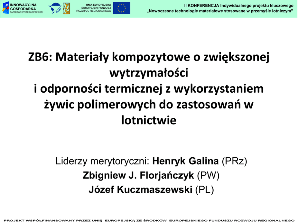 INNOWACYJNA GOSPODARKA NARODOWA STRATEGIA SPÓJNOŚCI UNIA EUROPEJSKA EUROPEJSKI FUNDUSZ ROZWPJU REGIONALNEGO II KONFERENCJA Indywidualnego projektu kluczowego „Nowoczesne technologie materiałowe stosowane w przemyśle lotniczym” ZB6: Materiały kompozytowe o zwiększonej wytrzymałości i odporności termicznej z wykorzystaniem żywic polimerowych do zastosowao w lotnictwie Liderzy merytoryczni: Henryk Galina (PRz) Zbigniew J. Florjańczyk (PW) Józef Kuczmaszewski (PL) PROJEKT WSPÓŁFINANSOWANY PRZEZ UNIĘ EUROPEJSKĄ ZE ŚRODKÓW EUROPEJSKIEGO FUNDUSZU ROZWOJU REGIONAL NEGO INNOWACYJNA GOSPODARKA NARODOWA STRATEGIA SPÓJNOŚCI UNIA EUROPEJSKA EUROPEJSKI FUNDUSZ ROZWPJU REGIONALNEGO Główne wnioski z dotychczas wykonanych prac badawczych: PRz • Na podstawie analizy literatury wytypowano typy/rodzaje żywic do prac badawczych: – chemiczna modyfikacja struktury żywic epoksydowych, w tym żywic o właściwościach anizotropowych – dobór środków utwardzających wspomagających uniepalnianie – wytypowanie i dobór napełniaczy wspomagających uniepalnianie i zwiększających odporność cieplną. • Wytypowane techniki badawcze: – badanie reaktywności żywic: DSC, żelpenetrator WB2 – charakterystyka termomechaniczna procesów utwardzania: DMTA – właściwości użytkowe kompozycji żywicznych: wytrzymałość statyczna, udarność wg Charpy’ego i Izoda, twardość wg Brinella – badanie stopnia uniepalnienia: indeks tlenowy, UL-94 – odporność cieplna: temperatura mięknienia wg Vicata, temperatura ugięcia HDT, TGA. INNOWACYJNA GOSPODARKA NARODOWA STRATEGIA SPÓJNOŚCI UNIA EUROPEJSKA EUROPEJSKI FUNDUSZ ROZWPJU REGIONALNEGO Główne wnioski z dotychczas wykonanych prac badawczych: PW • Badania kompatybilności polimerów przewodzących z żywicami bazowymi kompozytów dla lotnictwa: – polianilina, oligomery aniliny i polipirol – metody charakteryzacji: FT-IR, UV-Vis, masy molowe, skład chemiczny, przewodnictwo elektronowe mieszanin polimerów przewodzących z żywicą epoksydową. • Synteza i określenie przydatności nowych glinoorganicznych napełniaczy uniepalniających: – synteza warstw organicznych fosforanów glinu na powierzchni bemitu i wodorotlenku glinu – metody badawcze: badania właściwości reologicznych napełnionych żywic i ich reaktywności : DSC, FT-IR, Raman, SEM. INNOWACYJNA GOSPODARKA NARODOWA STRATEGIA SPÓJNOŚCI UNIA EUROPEJSKA EUROPEJSKI FUNDUSZ ROZWPJU REGIONALNEGO Główne wnioski z dotychczas wykonanych prac badawczych: PL • Wytypowanie metod badania adhezji modyfikowanych żywic ‒ badania zostaną rozpoczęte po dostarczeniu z PRz próbek modyfikowanych żywic. Realizacja kamieni milowych • VI miesiąc: KM00 Opracowanie szczegółowego programu prac badawczych – osiągnięty. • Pozostałe kamienie milowe – po 24 miesiącach. INNOWACYJNA GOSPODARKA NARODOWA STRATEGIA SPÓJNOŚCI UNIA EUROPEJSKA EUROPEJSKI FUNDUSZ ROZWPJU REGIONALNEGO Wizyty studyjne • PZL Świdnik S.A.: zapoznanie się z procesem produkcji elementów kadłubów śmigłowców i z wybranymi problemami technologicznymi wymagającymi podjęcia (przewodzące kleje do montażu systemu odlodzenia, rozszerzenie asortymentu żywic, stosowanych do laminowania) • PZL Mielec: zapoznanie się z technologiami formowania kompozytów i z wybranymi problemami technologicznymi (rozszerzenie asortymentu żywic, stosowanych do laminowania) • ZCh Ciech-Organika Sarzyna: zapoznanie się z technologiami produkcji żywic epoksydowych. INNOWACYJNA GOSPODARKA NARODOWA STRATEGIA SPÓJNOŚCI UNIA EUROPEJSKA EUROPEJSKI FUNDUSZ ROZWPJU REGIONALNEGO Wskaźniki realizacji celów Wskaźnik Prace habilitacyjne Prace doktorskie Wartość 0 Otwarte przewody: 1 Prace magisterskie 4 Publikacje naukowe 3 Wystąpienia konferencyjne Zgłoszenia patentowe Wykłady: 3 Plakaty: 2 0 INNOWACYJNA GOSPODARKA UNIA EUROPEJSKA EUROPEJSKI FUNDUSZ ROZWPJU REGIONALNEGO NARODOWA STRATEGIA SPÓJNOŚCI Realizacja zakupów ZB 6 Aparatura: Aparat do dynamicznej mechanicznej analizy termicznej (DMTA) Aparaty stanowią wyposażenie Laboratorium Badania Reaktywności Żywic Aparat do pomiaru indeksu tlenowego tworzyw (pom. H-25a) INNOWACYJNA GOSPODARKA NARODOWA STRATEGIA SPÓJNOŚCI UNIA EUROPEJSKA EUROPEJSKI FUNDUSZ ROZWPJU REGIONALNEGO Realizacja zakupów ZB 6 Materiały i sprzęt laboratoryjny: kupowany sukcesywnie, zgodnie z harmonogramem Usługi obce: brak (nie planowano) Rozbieżności w stosunku do szczegółowego planu: Brak INNOWACYJNA GOSPODARKA NARODOWA STRATEGIA SPÓJNOŚCI UNIA EUROPEJSKA EUROPEJSKI FUNDUSZ ROZWPJU REGIONALNEGO Zadania na 2010 rok • Zadania 6.2-6.4 oraz 6.11 (cały rok) – 6.2. Synteza nowych typów żywic epoksydowych i reaktywnych rozcieńczalników: aromatycznych, alifatycznych, siloksanowych, w tym ciekłokrystalicznych (termotropowych) (PRz). – 6.3. Synteza polimerów przewodzących i próby ich formowania/ wbudowania w struktury kompozytów (PW). – 6.4. Badania reaktywności żywic epoksydowych (PRz). – 6.11. Integracja krajowych środowisk naukowych i przemysłowych w dziedzinie nowych technologii polimerowych wykorzystywanych w przemyśle lotniczym. (PRz, PW, PL). INNOWACYJNA GOSPODARKA NARODOWA STRATEGIA SPÓJNOŚCI UNIA EUROPEJSKA EUROPEJSKI FUNDUSZ ROZWPJU REGIONALNEGO Zadania na 2010 rok • Zadanie 6.5 (I i II kw.) – 6.5. Badanie warunków utwardzania wytypowanych żywic z dodatkami uniepalniającymi i nanonapełniaczami – dobór lepkości i parametrów utwardzania (PRz). • Zadanie 6.6 (IV kw.) – 6.6. Ocena stopnia wzmocnienia i wytrzymałości żywic uniepalnionych, zawierających nanonapełniacze i włókna (PRz). • Zadanie 6.7 (III i IV kw.) – 6.7. Opracowanie metod przesycania żywicami rowingu, tkanin o różnym splocie i włókniny (maty) z włókna aramidowego i węglowego, względnie innych napełniaczy włóknistych (PRz).