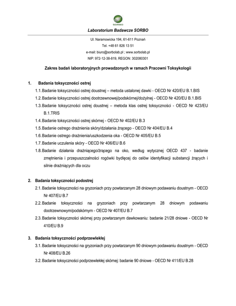 Laboratorium Badawcze SORBO Ul. Naramowicka 194, 61-611 Poznań Tel. +48 61 826 13 51 e-mail: [email protected] ; www.sorbolab.pl NIP: 972-12-38-819, REGON: 302080301 Zakres badań laboratoryjnych prowadzonych w ramach Pracowni Toksykologii 1. Badania toksyczności ostrej 1.1. Badanie toksyczności ostrej doustnej – metoda ustalonej dawki - OECD Nr 420/EU B.1.BIS 1.2. Badanie toksyczności ostrej dootrzewnowej/podskórnej/dożylnej - OECD Nr 420/EU B.1.BIS 1.3. Badanie toksyczności ostrej doustnej – metoda klas ostrej toksyczności - OECD Nr 423/EU B.1.TRIS 1.4. Badanie toksyczności ostrej skórnej - OECD Nr 402/EU B.3 1.5. Badanie ostrego drażnienia skóry/działania żrącego - OECD Nr 404/EU B.4 1.6. Badanie ostrego drażnienia/uszkodzenia oka - OECD Nr 405/EU B.5 1.7. Badanie uczulenia skóry - OECD Nr 406/EU B.6 1.8. Badanie działania drażniącego/żrącego na oko, według wytycznej OECD 437 - badanie zmętnienia i przepuszczalności rogówki bydlęcej do celów identyfikacji substancji żrących i silnie drażniących dla oczu 2. Badania toksyczności podostrej 2.1. Badanie toksyczności na gryzoniach przy powtarzanym 28 dniowym podawaniu doustnym - OECD Nr 407/EU B.7 2.2. Badanie toksyczności na gryzoniach przy powtarzanym 28 dniowym podawaniu dootrzewnowym/podskórnym - OECD Nr 407/EU B.7 2.3. Badanie toksyczności skórnej przy powtarzanym dawkowaniu: badanie 21/28 dniowe - OECD Nr 410/EU B.9 3. Badania toksyczności podprzewlekłej 3.1. Badanie toksyczności na gryzoniach przy powtarzanym 90 dniowym podawaniu doustnym - OECD Nr 408/EU B.26 3.2. Badanie toksyczności podprzewlekłej skórnej: badanie 90 dniowe - OECD Nr 411/EU B.28 Laboratorium Badawcze SORBO Ul. Naramowicka 194, 61-611 Poznań Tel. +48 61 826 13 51 e-mail: [email protected] ; www.sorbolab.pl NIP: 972-12-38-819, REGON: 302080301 4. Badania toksyczności przewlekłej i rakotwórczej 4.1. Badanie toksyczności przewlekłej - OECD Nr 452/EU B.30 4.2. Badanie rakotwórczości - OECD Nr 451/EU B.32 4.3. Badanie łączne toksyczności przewlekłej/rakotwórczości - OECD Nr 453/EU B.33 5. Badania toksyczności rozrodu 5.1. Badanie rozwoju przedporodowego - OECD Nr 414/EU B.31 5.2. Badanie przesiewowe rozrodu/rozwoju - OECD Nr 421 5.3. Badanie toksycznego wpływu na rozród w teście jednopokoleniowym - OECD Nr 415/EU B.34 5.4. Badanie toksycznego wpływu na rozród w rozszerzonym teście jednopokoleniowym - OECD 443 5.5. Badanie toksycznego wpływu na rozród w teście dwupokoleniowym - OECD Nr 416/EU B.35 Informujemy, że istnieje możliwość wykonania również innych badań na indywidualne życzenie Zleceniodawcy.