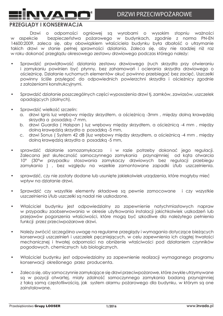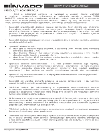 DRZWI PRZECIWPOŻAROWE PRZEGLĄDY I KONSERWACJA Drzwi o odporności ogniowej są wyrobami o wysokim stopniu ważności w aspekcie bezpieczeństwa pożarowego w budynkach, zgodnie z norma PN-EN 14600:2009, zaleca się, aby obowiązkiem właściciela budynku była dbałość o utrzymanie takich drzwi w stanie pełnej sprawności działania. Zaleca się, aby nie rzadziej niż raz w roku dokonać przeglądu okresowego zestawu drzwiowego podczas którego należy: • Sprawdzić prawidłowość działania zestawu drzwiowego (ruch skrzydła przy otwieraniu i zamykaniu powinien być płynny, bez zahamowań i ocierania skrzydła drzwiowego o ościeżnicę. Działanie ruchomych elementów okuć powinno przebiegać bez zacięć. Uszczelki powinny ściśle przylegać do odpowiednich powierzchni skrzydła i ościeżnicy zgodnie z założeniami konstrukcyjnymi. • Sprawdzić działanie poszczególnych części wyposażenia drzwi tj. zamków, zawiasów, uszczelek opadających (dolnych). • Sprawdzić wielkość szczelin: a. drzwi Ignis luz wrębowy między skrzydłem, a ościeżnicą -3mm , między dolną krawędzią skrzydła a posadzką -7 mm, b. drzwi Guardia ( Halspan ) luz wrębowy między skrzydłem, a ościeżnicą -4 mm , między dolną krawędzią skrzydła a posadzką -5 mm, c. drzwi Sonus ( System 42 dB )luz wrębowy między skrzydłem, a ościeżnicą -4 mm , między dolną krawędzią skrzydła a posadzką -5 mm, • sprawdzić działanie samozamykacza i w razie potrzeby dokonać jego regulacji. Zalecana jest skuteczność samoczynnego zamykania przynajmniej od kąta otwarcia 10° (30°w przypadku stosowania zamykaczy drzwiowych bez regulacji przebiegu zamykania ) , bez względu na wszelkie zamontowane zapadki i/lub uszczelnienia. • sprawdzić, czy nie zostały dodane lub usunięte jakiekolwiek urządzenia, które mogłyby mieć wpływ na działanie drzwi. • Sprawdzić czy wszystkie elementy składowe są pewnie zamocowane i czy wszystkie uszczelnienia i/lub uszczelki są nadal nie uszkodzone. • Właściciel budynku jest odpowiedzialny za zapewnienie natychmiastowych napraw w przypadku zaobserwowania w okresie użytkowania instalacji jakichkolwiek uszkodzeń lub przejawów pogorszenia właściwości, które mogą być szkodliwe dla należytego pełnienia funkcji przez przeciwpożarowe drzwi. • Należy zwrócić szczególna uwagę na regularne przeglądy i wymagania dotyczące bieżących konserwacji uszczelnień i uszczelek pęczniejących, w celu zapewnienia ich ciągłej trwałości mechanicznej i trwałej odporności na obniżenie właściwości pod działaniem czynników pogodowych, chemicznych lub biologicznych. • Właściciel budynku jest odpowiedzialny za zapewnienie realizacji wymaganego programu konserwacji określonego przez producenta. • Zaleca się, aby samoczynnie zamykające się drzwi przeciwpożarowe, które zwykle utrzymywane są w pozycji otwartej, miały zdolność samoczynnego zamykania badaną przynajmniej z taką samą częstotliwością, jak system alarmu pożarowego dla budynku, w którym są one zainstalowane. Przedsiębiorstwo Grupy LOOSER 1/2016 www.invado.pl