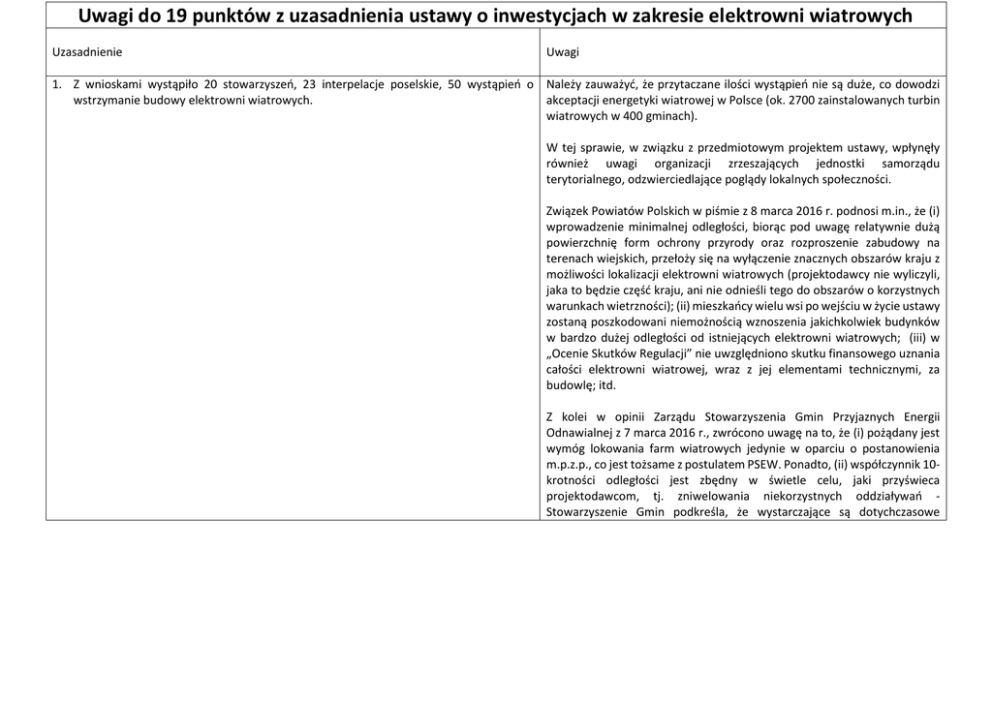 Uwagi do 19 punktów z uzasadnienia ustawy o inwestycjach w zakresie elektrowni wiatrowych Uzasadnienie Uwagi 1. Z wnioskami wystąpiło 20 stowarzyszeń, 23 interpelacje poselskie, 50 wystąpień o Należy zauważyć, że przytaczane ilości wystąpień nie są duże, co dowodzi wstrzymanie budowy elektrowni wiatrowych. akceptacji energetyki wiatrowej w Polsce (ok. 2700 zainstalowanych turbin wiatrowych w 400 gminach). W tej sprawie, w związku z przedmiotowym projektem ustawy, wpłynęły również uwagi organizacji zrzeszających jednostki samorządu terytorialnego, odzwierciedlające poglądy lokalnych społeczności. Związek Powiatów Polskich w piśmie z 8 marca 2016 r. podnosi m.in., że (i) wprowadzenie minimalnej odległości, biorąc pod uwagę relatywnie dużą powierzchnię form ochrony przyrody oraz rozproszenie zabudowy na terenach wiejskich, przełoży się na wyłączenie znacznych obszarów kraju z możliwości lokalizacji elektrowni wiatrowych (projektodawcy nie wyliczyli, jaka to będzie część kraju, ani nie odnieśli tego do obszarów o korzystnych warunkach wietrzności); (ii) mieszkańcy wielu wsi po wejściu w życie ustawy zostaną poszkodowani niemożnością wznoszenia jakichkolwiek budynków w bardzo dużej odległości od istniejących elektrowni wiatrowych; (iii) w „Ocenie Skutków Regulacji” nie uwzględniono skutku finansowego uznania całości elektrowni wiatrowej, wraz z jej elementami technicznymi, za budowlę; itd. Z kolei w opinii Zarządu Stowarzyszenia Gmin Przyjaznych Energii Odnawialnej z 7 marca 2016 r., zwrócono uwagę na to, że (i) pożądany jest wymóg lokowania farm wiatrowych jedynie w oparciu o postanowienia m.p.z.p., co jest tożsame z postulatem PSEW. Ponadto, (ii) współczynnik 10krotności odległości jest zbędny w świetle celu, jaki przyświeca projektodawcom, tj. zniwelowania niekorzystnych oddziaływań Stowarzyszenie Gmin podkreśla, że wystarczające są dotychczasowe przepisy. Dalej, (iii) wprowadzenie projektowanych rozwiązań w proponowanym brzmieniu praktycznie wyłączy z możliwości racjonalnego zagospodarowania obszary gmin, które potencjalnie mogą służyć lokalnej wspólnocie. Wreszcie, (iv) z przedłożonego projektu ustawy wynika konieczność zwiększenia zatrudnienia w administracji. Z kolei apel w obronie miejsc pracy w sektorze energetyki wiatrowej uzyskał ponad 7,3 tys. własnoręcznych podpisów. 2. Argumenty z raportu NIK. Pracownia „Ekoraporty” podjęła się weryfikacji szczegółowych tez zawartych w raporcie NIK (opracowanie w załączeniu). Wnioski z tego opracowania są następujące: (i) NIK ocenił negatywnie proces planowania i powstawania lądowych farm wiatrowych, pomimo że poszczególna ocena kontrolowanych jednostek przedstawiała się zasadniczo pozytywnie: 6 gmin - pozytywna, 19 gmin - pozytywna mimo stwierdzonych nieprawidłowości, 3 gminy - negatywna; (ii) zbyt uogólnione było twierdzenie NIK, że 30% farm wiatrowych powstało na terenach należących do osób decyzyjnych w gminach. Tymczasem przypadki lokalizacji na gruntach osób zaangażowanych w procesy decyzyjne dotyczyły pojedynczych działek lub jednostkowych turbin, będących częścią większej farmy; (iii) NIK dopuścił się generalizacji w zakresie określenia procentowego udziału elektrowni wiatrowych postawionych z naruszeniem przepisów o wyłączeniu się urzędnika/radnego z procesu decyzyjnego, gdyż odniósł się do całości danej procedury (ujmując kompleksowo wszystkie siłownie objęte daną częścią decyzji środowiskowej czy m.p.z.p.), a następnie w sposób nieuprawniony przeniósł swe konkluzje na ogólną ilość turbin pracujących na terenie kraju (w 7 gminach w których potwierdzono bezspornie zaistnienie nadużyć, nadużycia te (iv) (v) 3. Wystąpienie Rzecznika Praw Obywatelskich. dotyczyły jedynie 6 istniejących turbin wiatrowych (o sumarycznej mocy 9,8 MW) oraz 6 turbin niezrealizowanych w momencie zakończenia kontroli (o łącznej mocy 16,8 MW); przekładając to na liczbę turbin rzeczywiście działających na terenie owych 7 gmin - 89 turbin, na liczbę turbin istniejących we wszystkich 28 skontrolowanych gminach - 463); procentowy udział siłowni wiatrowych, które powstały z naruszeniem prawa w odniesieniu do inwestycji w 7 gminach wynosi zatem 6,7%, natomiast w stosunku do wszystkich gmin objętych kontrolą 1,3% pracujących elektrowni ; zarzut NIK braku konsultacji społecznych przy budowie elektrowni wiatrowych nie koresponduje z treścią wystąpień pokontrolnych delegatur NIK, gdzie wskazuje się tylko na drobne uchybienia formalne w postępowaniach administracyjnych; wreszcie, powoływanego przez NIK faktu nieuwzględniania uwag złożonych w trakcie postępowań w przedmiocie decyzji środowiskowej, nie należy utożsamiać z celowym unikaniem obowiązku informowania społeczeństwa o planowanych działaniach w zakresie energetyki wiatrowej. Rzeczą normalną jest, że nie zawsze można uwzględnić wszystkie uwagi, a rolą organu wydającego decyzję jest przestrzeganie prawa i równoważenie różnych interesów. Kwestie związane z potrzebą wprowadzenia regulacji prawnych zabezpieczających interesy mieszkańców terenów położonych w Tematyka lokalizacji elektrowni wiatrowych jest przedmiotem wystąpienia Rzecznika Praw sąsiedztwie elektrowni wiatrowych były przedmiotem zainteresowania Obywatelskich z dnia 3 lutego 2016 r. (pismo znak: IV.7006.271.2014.MCH), w którym RPO. Jak jednak podkreśla się w dokumentach RPO dotyczących zwrócono się z prośbą o informacje w sprawie prac nad uregulowaniem przedmiotowej uregulowania minimalnych odległości EW od zabudowy mieszkalnej kwestii, jak również podniesiono m. in. kwestie nieprawidłowości w zakresie lokalizacji EW. „Rzecznik dostrzega wagę pozyskiwania energii ze źródeł odnawialnych” (zob. Biuletyn RPO nr 1 z 2015 r., str. 187). RPO nie ma zatem wątpliwości, że należy promowa