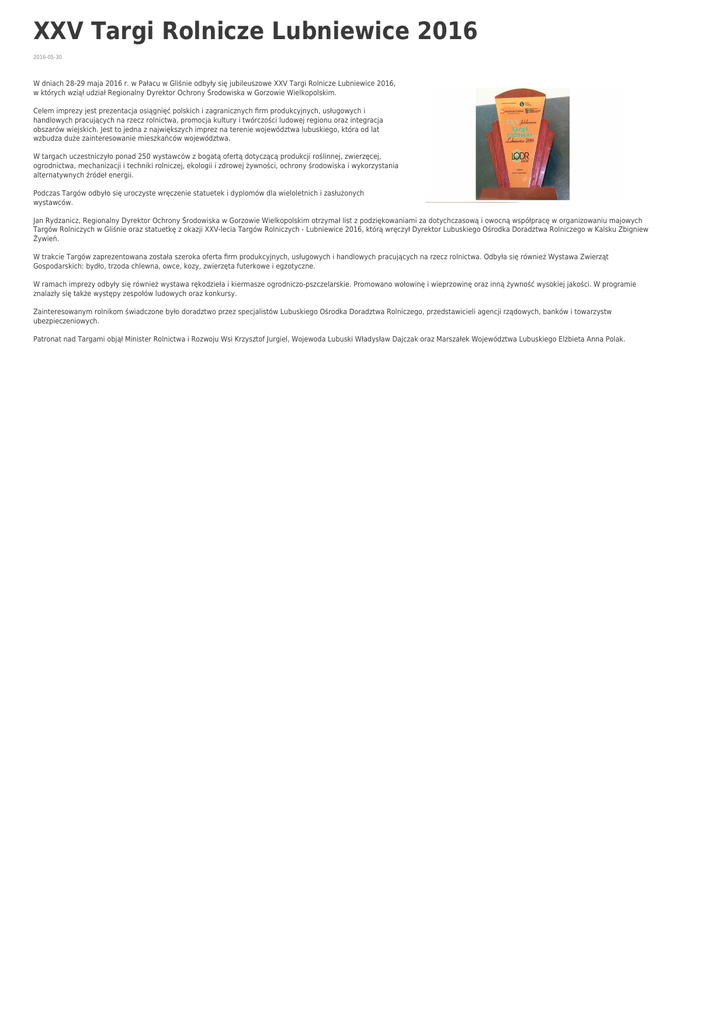 XXV Targi Rolnicze Lubniewice 2016 2016-05-30 W dniach 28-29 maja 2016 r. w Pałacu w Gliśnie odbyły się jubileuszowe XXV Targi Rolnicze Lubniewice 2016, w których wziął udział Regionalny Dyrektor Ochrony Środowiska w Gorzowie Wielkopolskim. Celem imprezy jest prezentacja osiągnięć polskich i zagranicznych firm produkcyjnych, usługowych i handlowych pracujących na rzecz rolnictwa, promocja kultury i twórczości ludowej regionu oraz integracja obszarów wiejskich. Jest to jedna z największych imprez na terenie województwa lubuskiego, która od lat wzbudza duże zainteresowanie mieszkańców województwa. W targach uczestniczyło ponad 250 wystawców z bogatą ofertą dotyczącą produkcji roślinnej, zwierzęcej, ogrodnictwa, mechanizacji i techniki rolniczej, ekologii i zdrowej żywności, ochrony środowiska i wykorzystania alternatywnych źródeł energii. Podczas Targów odbyło się uroczyste wręczenie statuetek i dyplomów dla wieloletnich i zasłużonych wystawców. Jan Rydzanicz, Regionalny Dyrektor Ochrony Środowiska w Gorzowie Wielkopolskim otrzymał list z podziękowaniami za dotychczasową i owocną współpracę w organizowaniu majowych Targów Rolniczych w Gliśnie oraz statuetkę z okazji XXV-lecia Targów Rolniczych - Lubniewice 2016, którą wręczył Dyrektor Lubuskiego Ośrodka Doradztwa Rolniczego w Kalsku Zbigniew Żywień. W trakcie Targów zaprezentowana została szeroka oferta firm produkcyjnych, usługowych i handlowych pracujących na rzecz rolnictwa. Odbyła się również Wystawa Zwierząt Gospodarskich: bydło, trzoda chlewna, owce, kozy, zwierzęta futerkowe i egzotyczne. W ramach imprezy odbyły się również wystawa rękodzieła i kiermasze ogrodniczo-pszczelarskie. Promowano wołowinę i wieprzowinę oraz inną żywność wysokiej jakości. W programie znalazły się także występy zespołów ludowych oraz konkursy. Zainteresowanym rolnikom świadczone było doradztwo przez specjalistów Lubuskiego Ośrodka Doradztwa Rolniczego, przedstawicieli agencji rządowych, banków i towarzystw ubezpieczeniowych. Patronat nad Targami objął Minister Rolnictwa i Rozwoju Wsi Krzysztof Jurgiel, Wojewoda Lubuski Władysław Dajczak oraz Marszałek Województwa Lubuskiego Elżbieta Anna Polak.