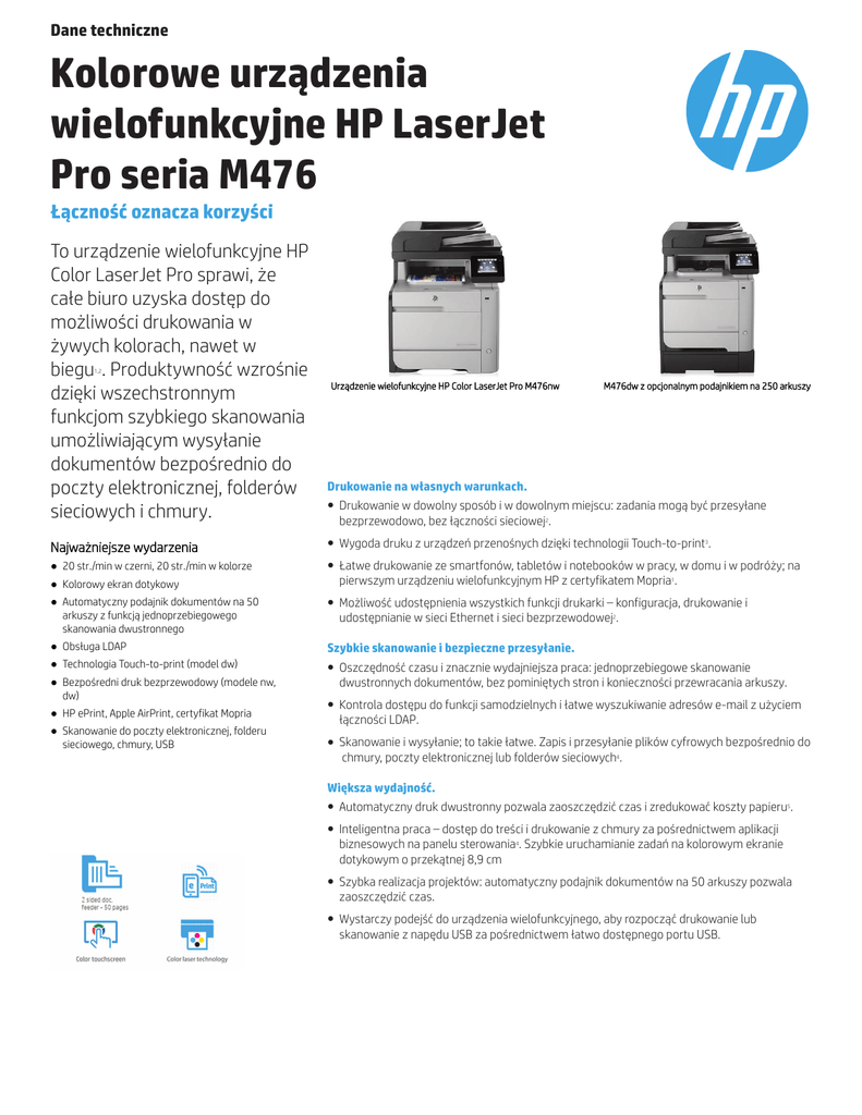 Dane techniczne Kolorowe urządzenia wielofunkcyjne HP LaserJet Pro seria M476 Łączność oznacza korzyści To urządzenie wielofunkcyjne HP Color LaserJet Pro sprawi, że całe biuro uzyska dostęp do możliwości drukowania w żywych kolorach, nawet w biegu . Produktywność wzrośnie dzięki wszechstronnym funkcjom szybkiego skanowania umożliwiającym wysyłanie dokumentów bezpośrednio do poczty elektronicznej, folderów sieciowych i chmury. 1,2 Urządzenie wielofunkcyjne HP Color LaserJet Pro M476nw M476dw z opcjonalnym podajnikiem na 250 arkuszy Drukowanie na własnych warunkach. ● Drukowanie w dowolny sposób i w dowolnym miejscu: zadania mogą być przesyłane bezprzewodowo, bez łączności sieciowej2. Najważniejsze wydarzenia ● Wygoda druku z urządzeń przenośnych dzięki technologii Touch-to-print3. ● 20 str./min w czerni, 20 str./min w kolorze ● Łatwe drukowanie ze smartfonów, tabletów i notebooków w pracy, w domu i w podróży; na ● Kolorowy ekran dotykowy pierwszym urządzeniu wielofunkcyjnym HP z certyfikatem Mopria1. ● Automatyczny podajnik dokumentów na 50 arkuszy z funkcją jednoprzebiegowego skanowania dwustronnego ● Możliwość udostępnienia wszystkich funkcji drukarki – konfiguracja, drukowanie i ● Obsługa LDAP Szybkie skanowanie i bezpieczne przesyłanie. ● Technologia Touch-to-print (model dw) ● Oszczędność czasu i znacznie wydajniejsza praca: jednoprzebiegowe skanowanie ● Bezpośredni druk bezprzewodowy (modele nw, dw) ● HP ePrint, Apple AirPrint, certyfikat Mopria ● Skanowanie do poczty elektronicznej, folderu sieciowego, chmury, USB udostępnianie w sieci Ethernet i sieci bezprzewodowej2. dwustronnych dokumentów, bez pominiętych stron i konieczności przewracania arkuszy. ● Kontrola dostępu do funkcji samodzielnych i łatwe wyszukiwanie adresów e-mail z użyciem łączności LDAP. ● Skanowanie i wysyłanie; to takie łatwe. Zapis i przesyłanie plików cyfrowych bezpośrednio do chmury, poczty elektronicznej lub folderów sieciowych4. Większa wydajność. ● Automatyczny druk dwustronny pozwala zaoszczędzić czas i zredukować koszty papieru5. ● Inteligentna praca – dostęp do treści i drukowanie z chmury za pośrednictwem aplikacji biznesowych na panelu sterowania4. Szybkie uruchamianie zadań na kolorowym ekranie dotykowym o przekątnej 8,9 cm ● Szybka realizacja projektów: automatyczny podajnik dokumentów na 50 arkuszy pozwala zaoszczędzić czas. ● Wystarczy podejść do urządzenia wielofunkcyjnego, aby rozpocząć drukowanie lub skanowanie z napędu USB za pośrednictwem łatwo dostępnego portu USB. Przegląd produktu Na ilustracji urządzenie wielofunkcyjne HP Color LaserJet Pro M476dw: 1. Skaner płaski 2. Odbiornik papieru na 150 arkuszy 3. Pojedyncza pokrywa zapewnia dostęp do wstępnie zainstalowanych wkładów drukujących 4. Podajnik wielofunkcyjny na 50 arkuszy 5. Podajnik nr 2 na 250 arkuszy 6. Automatyczny podajnik dokumentów na 50 arkuszy umożliwiający jednoprzebiegowe skanowanie dwustronne 7. Kolorowy, dotykowy panel sterowania o przekątnej 8,9 cm z aplikacjami biznesowymi HP 8. Technologia Touch-to-print i bezpośredni druk bezprzewodowy 9. Łatwo dostępny port USB 10. Wygodny włącznik z przodu 11. Port telefonicznego wyjścia liniowego 12. Port RJ-11 do podłączania faksu 13. Wbudowany interfejs sieci bezprzewodowej 14. Port sieci Fast Ethernet 15. Port Hi-Speed USB 2.0 na potrzeby drukowania Krótka charakterystyka Model Urządzenie wielofunkcyjne HP Color LaserJet Pro M476nw Urządzenie wielofunkcyjne HP Color LaserJet Pro M476dn Urządzenie wielofunkcyjne HP Color LaserJet Pro M476dw Numer produktu CF385A CF386A CF387A Podajnik uniwersalny 1 na 50 arkuszy Tak Tak Tak Podajnik nr 2 na 250 arkuszy Tak Tak Tak Podajnik nr 3 na 250 arkuszy Opcjonalne Opcjonalne Opcjonalne Bezpośredni druk bezprzewodowy Tak Niedostępny Tak Technologia Touch-to-print Niedostępny Niedostępny Tak Praca w sieci Ethernet Tak Tak Tak Bezprzewodowa łączność sieciowa Tak Niedostępny Tak Jednoprzebiegowe skanowanie dwustronne z automatycznym podajnikiem dokumentów (ADF) Tak Tak Tak Automatyczne drukowanie dwustronne Niedostępny Tak Tak Uwierzytelnianie LDAP/Windows Tak Tak Tak Dane techniczne Model Urządzenie wielofunkcyjne HP Color LaserJet Pro M476nw Urządzenie wielofunkcyjne HP Color LaserJet Pro M476dn Urządzenie wielofunkcyjne HP Color LaserJet Pro M476dw Numer produktu CF385A CF386A CF387A Technologia druku Druk laserowy Funkcje Drukowanie, kopiowanie, skanowanie, faksowanie Czcionki 84 skalowalnych czcionek TrueType Prędkość druku Do 20 str./min w czerni (A4); Do 20 str./min w kolorze (A4) Pomiarów dokonano z wykorzystaniem normy ISO/IEC 24734 (z wyłączeniem pierwszego zestawu dokumentów testowych). Więcej informacji można znaleźć na stronie http://www.hp.com/go/printerclaims. Prędkość druku zależy od konfiguracji systemu, wykorzystywanego oprogramowania, sterownika i stopnia złożoności drukowanych prac. Czas wydruku pierwszej strony W ciągu zaledwie 16,5 sekund w czerni (A4, tryb gotowości); W ciągu zaledwie 16,5 sekund w kolorze (A4, tryb gotowości) Miesięczny cykl pracy Do 40000 stron (A4); Zalecana ilość stron drukowanych miesięcznie: 1000–2500 Obszar drukowania Marginesy drukowania: Górny: 4,23 mm; Dolny: 4,23 mm; Lewy: 4,23 mm; Prawy: 4,23 mm; Maksymalny obszar zadruku: 211,8 x 351,8 mm Rozdzielczość druku HP ImageREt 3600; Do 600 x 600 dpi W czerni; Do 600 x 600 dpi w kolorze Języki drukowania HP PCL 6, HP PCL 5c, emulacja HP Postscript Level 3, PCLm PDF, URF Funkcje inteligentnego oprogramowania do drukarki HP ePrint, Apple AirPrint™, bezpośredni druk bezprzewodowy, certyfikat Mopria, technologia HP Auto-On/Auto-Off, intuicyjny dotykowy panel sterowania o przekątnej 8,9 cm, drukowanie z chmury z użyciem aplikacji biznesowych na panelu sterowania, drukowanie z portu USB Szybkość procesora 800 MHz Pamięć 256 MB Pojemność aut