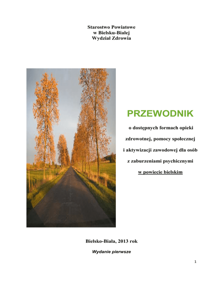 Starostwo Powiatowe w Bielsku-Białej Wydział Zdrowia PRZEWODNIK o dostępnych formach opieki zdrowotnej, pomocy społecznej i aktywizacji zawodowej dla osób z zaburzeniami psychicznymi w powiecie bielskim Bielsko-Biała, 2013 rok Wydanie pierwsze 1 Szanowni Państwo, mam przyjemność przekazać w Państwa ręce Przewodnik o dostępnych formach opieki zdrowotnej, pomocy społecznej i aktywizacji zawodowej dla osób z zaburzeniami psychicznymi w powiecie bielskim. Wierzę, że Przewodnik przybliży Państwu zakres dostępnej pomocy, zarówno społecznej, medycznej czy zawodowej i będzie stanowił źródło informacji o podmiotach świadczących usługi dla osób z zaburzeniami psychicznymi na terenie Miasta Bielska-Białej i Powiatu Bielskiego. Ufam, że przygotowany dokument przysłuży się działaniom realizowanym w zakresie poprawy sytuacji zdrowia psychicznego mieszkańców Powiatu Bielskiego, a także doprowadzi do kształtowania wobec nich postaw tolerancji i zrozumienia. Mając na uwadze użyteczność publikacji, zachęcam Państwa do dzielenia się sugestiami i oczekiwaniami wobec kolejnych jej edycji, poprzez przekazanie propozycji na adres: [email protected]. Aktualizacja danych teleadresowych oraz merytorycznych niniejszego Przewodnika, planowana jest raz w roku. 2 Przewodnik o dostępnych formach opieki zdrowotnej, pomocy społecznej i aktywizacji zawodowej dla osób z zaburzeniami psychicznymi w powiecie bielskim 2013 Spis treści : I. Wstęp …………………………………………………………………………. str. 4-5 II. Opieka zdrowotna …………………………………………………………. str. 6-12 III. Pomoc społeczna ………………………………………………………… str. 12-19 IV. Orzekanie o niepełnosprawności …………………………................... str. 19-23 V. Orzekanie o niezdolności do pracy ……………………….................... str. 23-26 VI. Poradnictwo psychologiczno – pedagogiczne ………….................. str. 27-28 VII. Poradnictwo zawodowe i aktywizacja zawodowa …….................... str. 29-32 3 Przewodnik o dostępnych formach opieki zdrowotnej, pomocy społecznej i aktywizacji zawodowej dla osób z zaburzeniami psychicznymi w powiecie bielskim 2013 I. WSTĘP Ustawa z dnia 19 sierpnia 1994 r. o ochronie zdrowia psychicznego ( tj. Dz. U. z 2011 r. Nr 231,poz.1375 z późn. zm.) uznaje, iż : „…zdrowie psychiczne jest fundamentalnym dobrem osobistym człowieka, a ochrona praw osób z zaburzeniami psychicznymi należy do obowiązków państwa…”. Jest więc integralnym i niezwykle istotnym elementem zdrowia, co więcej nie ma zdrowia bez zdrowia psychicznego. Według Światowej Organizacji Zdrowia (WHO) zdrowie jest to stan dobrego samopoczucia fizycznego, psychicznego, społecznego i duchowego, a nie tylko brak choroby lub niepełnosprawności. Tak szeroko rozumiane zdrowie jest wartością, dzięki której zarówno jednostka jak i grupa może realizować swe aspiracje i potrzebę osiągnięcia satysfakcji, zmieniać środowisko oraz się z nim integrować W Polsce cele, zadania i działania na rzecz ochrony zdrowia psychicznego sformułowane zostały w ustawie o ochronie zdrowia psychicznego z dnia 19 sierpnia 1994 r. ( tj. Dz.U. 2011 r. Nr 231, poz. 1375 z późn. zm. ), a mianowicie: 1) ochronę zdrowia psychicznego zapewniają organy administracji rządowej i samorządowej oraz instytucje do tego powołane, 2) w działaniach z zakresu ochrony zdrowia psychicznego mogą uczestniczyć stowarzyszenia i inne organizacje społeczne, fundacje, samorządy zawodowe, kościoły i inne związki wyznaniowe oraz grupy samopomocy pacjentów i ich rodzin, a także inne osoby fizyczne i prawne. Ochrona zdrowia psychicznego obejmuje realizację zadań dotyczących w szczególności: • promocji zdrowia psychicznego i zapobiegania zaburzeniom psychicznym, • zapewnienia osobom z zaburzeniami psychicznymi wielostronnej i powszechnie dostępnej opieki zdrowotnej oraz innych form opieki i pomocy niezbędnych do życia w środowisku rodzinnym i społecznym, • kształtowania wobec osób z zaburzeniami psychicznymi właściwych postaw społecznych, a zwłaszcza zrozumienia, tolerancji, życzliwości, a także przeciwdziałania ich dyskryminacji. 4 Przewodnik o dostępnych formach opieki zdrowotnej, pomocy społecznej i aktywizacji zawodowej dla osób z zaburzeniami psychicznymi w powiecie bielskim 2013 Zadania, o których mowa powyżej są realizowane przez działania określone w Narodowym Programie Ochrony Zdrowia Psychicznego, który został ustanowiony Rozporządzeniem Rady Ministrów z dnia 28 grudnia 2010 r. Narodowy Program Ochrony Zdrowia Psychicznego określa w szczególności: 1) okres jego obowiązywania, 2) diagnozę sytuacji i zagrożeń dla zdrowia psychicznego, w tym zróżnicowań regionalnych, 3) cele główne i cele szczegółowe, 4) podmioty biorące udział w jego realizacji, 5) sposób realizacji zadań. Jednym z zadań określonym w celach szczegółowych Narodowego Programu, nałożonym na samorządy terytorialne jest przygotowanie aktualizowanego corocznie Przewodnika informującego o dostępnych formach opieki zdrowotnej, pomocy społecznej i aktywizacji zawodowej dla osób z zaburzeniami psychicznymi. Opracowanie tego Przewodnika przez Wydział Zdrowia Starostwa Powiatowego w Bielsku-Białej to próba usystematyzowania najistotniejszych danych dotyczących ulg i uprawnień osobom niepełnosprawnym, w tym osobom z zaburzeniami psychicznymi. W tym właśnie celu - poprawy świadomości powstał Przewodnik, który jest niezwykle istotny dla osób cierpiących na zaburzenia psychiczne, ale także dla instytucji świadczących pomoc tej grupie osób niepełnosprawnych. 5 Przewodnik o dostępnych formach opieki zdrowotnej, pomocy społecznej i aktywizacji zawodowej dla osób z zaburzeniami psychicznymi w powiecie bielskim 2013 II. OPIEKA ZDROWOTNA. Opieka z
