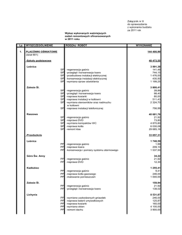 Załącznik nr 8 do sprawozdania z wykonania budżetu za 2011 rok Wykaz wykonanych ważniejszych zadań remontowych sfinansowanych w 2011 roku Lp. WYSZCZEGÓLNIENIE 1. PLACÓWKI OŚWIATOWE (dział 801) RODZAJ ROBÓT WYKONANIE 144 400,99 -Szkoły podstawowe 48 473,55 Leśnica SP SP SP SP SP -regeneracja gaśnic -przegląd i konserwacja ksero -przebudowa instalacji elektrycznej -konserwacja instalacji elektrycznej -wymiana opraw oświetlenia Zalesie Śl. SP SP SP SP SP -regeneracja gaśnic -przegląd i konserwacja ksero -naprawa kosiarki -naprawa instalacji w kotłowni -wymiana sterowników oraz nadmuchu w kotłowni SP -naprawa instalacji telefonicznej Raszowa SP SP SP SP SP -regeneracja gaśnic -naprawa DVD -wymiana kompaktów WC -naprawa kotła -remont klas -Przedszkola 3 991,38 141,48 744,15 1 476,00 430,50 1 199,25 3 800,41 28,89 98,40 80,00 511,43 2 324,70 756,99 40 681,76 21,92 73,80 4 870,80 6 030,08 29 685,16 33 657,31 Leśnica PP -regeneracja gaśnic PP -naprawa ksera PP -konserwacja i pomiary systemu alarmowego Góra Św. Anny PP -regeneracja gaśnic PP -naprawa DVD Kadłubiec PP -regeneracja gaśnic PP -naprawa kotła gazowego PP -malowanie pomieszczeń Zalesie Śl. PP -regeneracja gaśnic PP -przegląd i konserwacja ksero Lichynia PP PP PP PP PP -wymiana uszkodzonych gniazdek -naprawa baterii umywalkowych -naprawa kosiarki -wymiana okien -remont dachu 1 748,59 1,99 209,10 1 537,50 34,22 21,92 12,30 1 255,41 9,41 246,00 1 000,00 159,94 21,92 138,02 8 531,87 246,00 125,87 160,00 4 100,00 3 900,00 Lp. WYSZCZEGÓLNIENIE Raszowa RODZAJ ROBÓT PP PP PP PP -regeneracja gaśnic -przegląd, konserwacja i naprawa ksero -naprawa grzejników, wymiana rur -remont balustrady, malowanie pomieszczeń kuchennych, kafelkowanie łazienki Łąki Kozielskie PP -naprawa kosiarki -Gimnazja PG PG PG PG PG PG -regeneracja gaśnic -przegląd i konserwacja ksero -wymiana uszkodzonych czujników -wymiana uszkodzonego systemu alarmowego -remont pomieszczeń piwnicy -naprawa mikrofonu Centrum Edukacji Ekologicznej 26 410,98 144,13 449,75 256,65 264,45 25 000,00 296,00 14 951,59 PG -naprawa uszkodzonego systemu antywłamaniowego PG -regeneracja gaśnic PG -naprawa i konserwacja dachu na hali sportowej PG -remont oświetlenia PG -konserwacja systemu wentylacyjnego -Gminny Zarząd Oświaty 922,50 155,09 9 200,00 2 829,00 1 845,00 GZO -przegląd i konserwacja ksero 246,00 246,00 SM -regeneracja gaśnic SM -przegląd i konserwacja ksero 175,68 9,63 166,05 -Szkoła Muzyczna -Stołówki szkolne 20 485,88 SP Leśnica SP -konserwacja windy SP -dobudowa oświetlenia SP -doprowadzenie i odprowadzenie wody do kuchni SP -montaż drzwi i okna podawczego SP -naprawa kanalizacji GMINNE JEDNOSTKI 20 485,88 664,20 1 845,00 13 285,23 3 953,45 738,00 514 501,87 Jednostki OSP (dział 754) OSP Leśnica 99,00 99,00 41 362,57 Publiczne Gimnazjum 2. WYKONANIE 21 828,28 21,92 456,69 1 500,00 19 849,67 53 303,57 -remont sprzętu -odwodnienie piwnic -wymiana napędu (siłownika) bramy uchylnej boksu garażowego -przegląd techniczny i naprawa kotłów grzewczych -wymiana rynien na budynku remizy OSP Lichynia -remont sprzętu -remont boksu garażowego -obsługa serwisowa kotła olejowego OSP Wysoka -remont sprzętu 2 889,84 2 367,93 1 400,00 800,00 1 700,11 47,75 16 023,52 307,50 4 917,70 Lp. WYSZCZEGÓLNIENIE RODZAJ ROBÓT -remont tarasu OSP Zalesie Śl. -remont sprzętu wszystkie jednostki OSP -przegląd serwisowy selektywnego alarmowania i łączności WYKONANIE 20 082,21 688,31 2 078,70 87 328,91 Drogi gminne i wewnętrzne: (dział 600) Leśnica, Plac Targowy -remont muru oporowego 4 947,06 Leśnica, ul. Brzegowa -remont mostku 4 083,60 Lichynia, ul. Ogrodowa -remont nawierzchni drogi gminnej 105896 O 57 319,41 Łąki Kozielskie, ul.Kościelna -remont przepustów 19 218,38 Wysoka i Poręba -montaż słupków przystankowych wraz z oznakowaniem (znaki D-15) Pozostałe remonty: Gospodarka mieszkaniowa (dział 700) Działalność usługowa (dział 710) Administracja (dział 750) 1 760,46 373 869,39 -skucie tynków na budynku komunalnym w Leśnicy przy ul. Góry Św. Anny -remont bieżący instalacji elektrycznej w budynku komunalnym Pl. Narutowicza 27 -wymiana i montaż okien i parapetów w budynkach komunalnych (Leśnica ul. Kościelna 3/3, 3/5, 3/6, ul. Zdzieszowicka 9/2) -remont balkonu budynku Pl.Narutowicza 27 -remont instalacji elektrycznej Pl.Narutowicza 26 -remont muru na działce nr 1937 przy budynku na Pl. Narutowicza 12 -remont instalacji elektrycznej w budynku komunalnym przy Placu Narutowicza 27 -rozbiórka budynków komunalnych w tym: -Krasowa, ul. Wiejska 44 -Leśnica, ul. Brzegowa -wykonanie nagrobka na grobie Powstańców Śląskich na cmentarzu w Leśnicy w tym: -dotacja celowa z budżetu państwa -środki budżetu gminy -konserwacja i naprawy ksero,drukarek,sprzętu -montaż i demontaż szafy telekomunikacyjnej wraz z centralą oraz podłączenia i konfiguracja nowych numerów -drobne naprawy i awarie -remont pomieszczeń biurowych -naprawa samochodów służbowych -kompleksowy remont magazynu oleju kotłowni -przegląd, konserwacja i regeneracja sprzętu gaśniczego -renowacja schodów w budynku UM 65 264,86 1 273,73 3 999,96 5 075,81 738,00 20 585,97 10 876,68 9 416,51 13 298,20 3 790,00 9 508,20 1 075,50 1 075,50 575,50 500,00 83 270,24 5 045,71 984,00 2 175,18 24 496,79 3 283,42 31 337,94 188,44 3 499,35 Lp. WYSZCZEGÓLNIENIE Bezpieczeństwo publiczne i ochrona przeciwpożarowa (dział 754) RODZAJ ROBÓT -wykonanie tablic ogłoszeniowych dla sołectw Poręba, Zalesie Śl., Kadłubiec -montaż oświetlenia - okres Bożego Narodzenia - teren gminy -utwardzenie terenu przy zbiorniku p.poż. w Górze Św. Anny -remont zbiornika przeciwpożarowego w Górze Św. Anny -wykonanie przyłącza przeciwpożarowego do budynku Klubu Wiejskiego w Raszowej -naprawa silnika i syreny alarmowej OC w Leśnicy - Plac Narutowicza 26 -przegląd serwisowy stacji bazowej DSP15 i stacji obiektowej DSP50 - OC - Leśnica -naprawa stacji obi