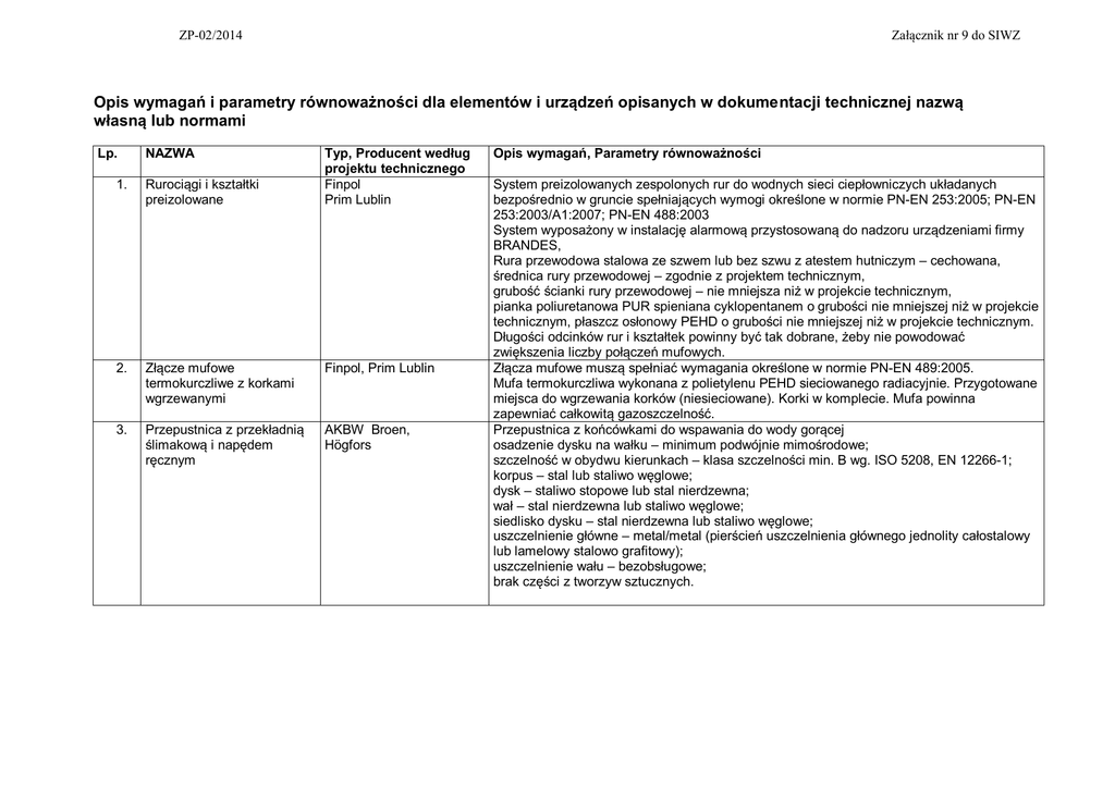 ZP-02/2014 Załącznik nr 9 do SIWZ Opis wymagań i parametry równoważności dla elementów i urządzeń opisanych w dokumentacji technicznej nazwą własną lub normami Lp. NAZWA Typ, Producent według projektu technicznego Finpol Prim Lublin 1. Rurociągi i kształtki preizolowane 2. Złącze mufowe termokurczliwe z korkami wgrzewanymi Finpol, Prim Lublin 3. Przepustnica z przekładnią ślimakową i napędem ręcznym AKBW Broen, Högfors Opis wymagań, Parametry równoważności System preizolowanych zespolonych rur do wodnych sieci ciepłowniczych układanych bezpośrednio w gruncie spełniających wymogi określone w normie PN-EN 253:2005; PN-EN 253:2003/A1:2007; PN-EN 488:2003 System wyposażony w instalację alarmową przystosowaną do nadzoru urządzeniami firmy BRANDES, Rura przewodowa stalowa ze szwem lub bez szwu z atestem hutniczym – cechowana, średnica rury przewodowej – zgodnie z projektem technicznym, grubość ścianki rury przewodowej – nie mniejsza niż w projekcie technicznym, pianka poliuretanowa PUR spieniana cyklopentanem o grubości nie mniejszej niż w projekcie technicznym, płaszcz osłonowy PEHD o grubości nie mniejszej niż w projekcie technicznym. Długości odcinków rur i kształtek powinny być tak dobrane, żeby nie powodować zwiększenia liczby połączeń mufowych. Złącza mufowe muszą spełniać wymagania określone w normie PN-EN 489:2005. Mufa termokurczliwa wykonana z polietylenu PEHD sieciowanego radiacyjnie. Przygotowane miejsca do wgrzewania korków (niesieciowane). Korki w komplecie. Mufa powinna zapewniać całkowitą gazoszczelność. Przepustnica z końcówkami do wspawania do wody gorącej osadzenie dysku na wałku – minimum podwójnie mimośrodowe; szczelność w obydwu kierunkach – klasa szczelności min. B wg. ISO 5208, EN 12266-1; korpus – stal lub staliwo węglowe; dysk – staliwo stopowe lub stal nierdzewna; wał – stal nierdzewna lub staliwo węglowe; siedlisko dysku – stal nierdzewna lub staliwo węglowe; uszczelnienie główne – metal/metal (pierścień uszczelnienia głównego jednolity całostalowy lub lamelowy stalowo grafitowy); uszczelnienie wału – bezobsługowe; brak części z tworzyw sztucznych. ZP-…../2014 Załącznik nr 9 do SIWZ 4. Zawór odcinający kulowy DZT Broen, Naval 5. Instalacja alarmowa dla systemu rur preizolowanych BRANDES 6. Pomiary miejscowe temperatury 7. Pomiary miejscowe ciśnienia Zawór do wody gorącej, kulowy, korpus całkowicie spawany ze stali węglowej z osadzonym w korpusie uszczelnieniem ze zbrojonego teflonu PTFE+C, kula wykonana ze szlifowanej i polerowanej stali nierdzewnej, kula osadzona pływająco na sprężynach talerzowych wykonanych ze stali sprężynowej, trzpień ze stali nierdzewnej, dla średnic od DN 65 obudowa trzpienia z łożyskiem ze stali nierdzewnej, dźwignia zaworu ze stali ocynkowanej, podwójne uszczelnienie wrzeciona - O-ring (EPDM, FKM) max. temperatura wody – nie mniej niż 150oC, max. ciśnienie pracy – nie mniej niż 25 bar DN – zgodnie z projektem technicznym, Rodzaj przyłącza (końcówki do wspawania, kołnierz) zgodnie z projektem technicznym Elementy systemu alarmowego kompatybilne z urządzeniami firmy Brandes. Puszki pomiarowe i przyłączeniowe przystosowane do podłączenia urządzeń firmy Brandes. 2 Przewody łączące do puszek – linka miedziana o przekroju nie mniej niż 1 mm , w izolacji teflonowej Pomiar temperatury miejscowy – tuleja termometryczna z gwintem ¾ cala, termometr techniczny prosty rtęciowy w obudowie stalowej (zakres temperatur 0-150°C) wg rysunku nr 9 Wytycznych projektowania dostępnych na stronie internetowej www.mpec.bialystok.pl w zakładce Strefa projektanta Pomiar ciśnienia miejscowy (manometr) – króciec ciśnieniowy, rurka syfonowa, zawór MEZ15 – gwint M20x1,5mm lub kurek manometryczny, dla średnic sieci powyżej DN250 wymagany jest dodatkowy zawór kulowy zamontowany bezpośrednio przy rurze przewodowej (manometr tarczowy M160, zakres 0-2,5MPa), wg rysunku nr 11 Wytycznych projektowania dostępnych na stronie internetowej www.mpec.bialystok.pl w zakładce Strefa projektanta