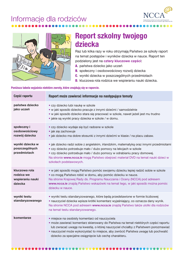 Informacje dla rodziców •••••••••••••••••••••••••••••••••••••••••••••••• Report szkolny twojego dziecka Raz lub kilka razy w roku otrzymają Państwo ze szkoły raport na temat postępów i wyników dziecka w nauce. Raport ten podzielony jest na cztery kluczowe części: A. państwa dziecko jako uczeń B. społeczny i osobowościowy rozwój dziecka C. wyniki dziecka w poszczególnych przedmiotach D. kluczowa rola rodzica we wspieraniu nauki dziecka. Poniższa tabela wyjaśnia niektóre zwroty, które znajdują się w raporcie. Część raportu Raport może zawierać informacje na następujące tematy państwa dziecko jako uczeń • czy dziecko lubi naukę w szkole • w jaki sposób dziecko pracuje z innymi dziećmi / samodzielnie • w jaki sposób dziecko stara się pracować w szkole, nawet jeżeli jest mu trudno • jakie są wyniki pracy dziecka w szkole / w domu. społeczny i osobowościowy rozwój dziecka • czy dziecko wydaje się być radosne w szkole • jak się zachowuje • jak dziecko ma dobre stosunki z innymi dziećmi w klasie / na placu zabaw. wyniki dziecka w poszczególnych przedmiotach • jak dziecko radzi sobie z angielskim, irlandzkim, matematyką oraz innymi przedmiotami • czy dziecko potrzebuje mało / dużo pomocy na lekcjach w szkole • czy dziecko potrzebuje mało / dużo pomocy w odrabianiu pracy domowej. Na stronie www.ncca.ie mogą Państwo obejrzeć materiał DVD na temat nauki dzieci w szkołach podstawowych. kluczowa rola rodzica we wspieraniu nauki dziecka • w jaki sposób mogą Państwo pomóc swojemu dziecku lepiej radzić sobie w szkole • co mogą Państwo robić w domu, aby pomóc dziecku w nauce. Na stronie Krajowej Rady ds. Programu Nauczania i Oceny (NCCA) pod adresem www.ncca.ie znajdą Państwo wskazówki na temat tego, w jaki sposób można pomóc dziecku w nauce. wyniki testu standaryzowanego • wyniki testu standaryzowanego, które będą przedstawione w formie liczbowej • nauczyciel dziecka wpisze krótki komentarz wyjaśniający, co oznacza dany wynik. Na stronie NCCA pod adresem www.ncca.ie znajdą Państwo także ulotki dla rodziców na temat testu standaryzowanego. komentarze • miejsce na osobisty komentarz od nauczyciela • może zawierać komentarz skierowany do Państwa na temat niektórych części raportu lub zwracać uwagę na kwestię, o której nauczyciel chciałby z Państwem porozmawiać • nauczyciel może wykorzystać to miejsce, aby zwrócić Państwa uwagę lub pochwalić dziecko za specjalne osiągnięcie lub cechę charakteru. ••••••••••••••••••••••••••••••••••••••••••••••••