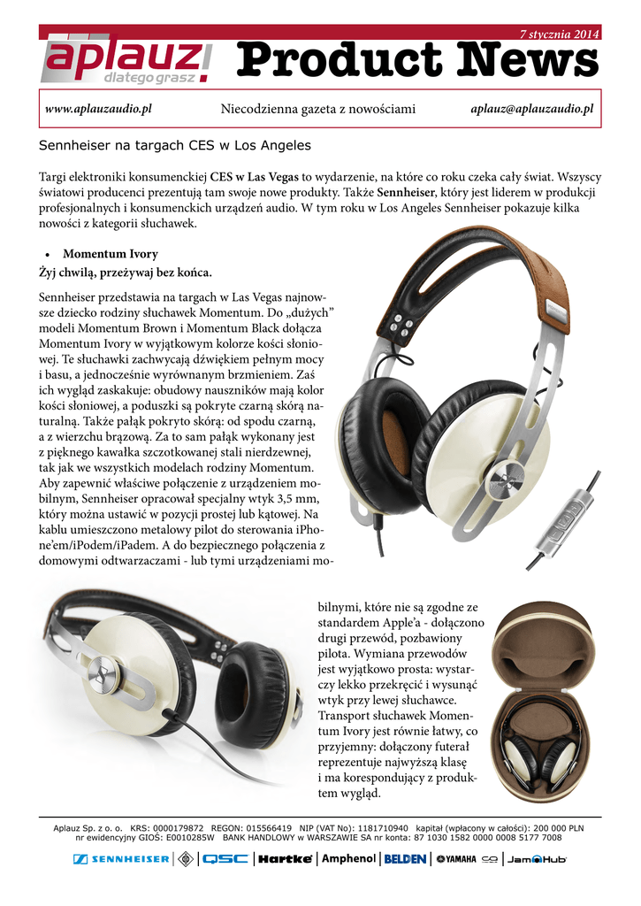 Product News 7 stycznia 2014 www.aplauzaudio.pl Niecodzienna gazeta z nowościami [email protected] Sennheiser na targach CES w Los Angeles Targi elektroniki konsumenckiej CES w Las Vegas to wydarzenie, na które co roku czeka cały świat. Wszyscy światowi producenci prezentują tam swoje nowe produkty. Także Sennheiser, który jest liderem w produkcji profesjonalnych i konsumenckich urządzeń audio. W tym roku w Los Angeles Sennheiser pokazuje kilka nowości z kategorii słuchawek. • Momentum Ivory Żyj chwilą, przeżywaj bez końca. Sennheiser przedstawia na targach w Las Vegas najnowsze dziecko rodziny słuchawek Momentum. Do „dużych” modeli Momentum Brown i Momentum Black dołącza Momentum Ivory w wyjątkowym kolorze kości słoniowej. Te słuchawki zachwycają dźwiękiem pełnym mocy i basu, a jednocześnie wyrównanym brzmieniem. Zaś ich wygląd zaskakuje: obudowy nauszników mają kolor kości słoniowej, a poduszki są pokryte czarną skórą naturalną. Także pałąk pokryto skórą: od spodu czarną, a z wierzchu brązową. Za to sam pałąk wykonany jest z pięknego kawałka szczotkowanej stali nierdzewnej, tak jak we wszystkich modelach rodziny Momentum. Aby zapewnić właściwe połączenie z urządzeniem mobilnym, Sennheiser opracował specjalny wtyk 3,5 mm, który można ustawić w pozycji prostej lub kątowej. Na kablu umieszczono metalowy pilot do sterowania iPhone’em/iPodem/iPadem. A do bezpiecznego połączenia z domowymi odtwarzaczami - lub tymi urządzeniami mobilnymi, które nie są zgodne ze standardem Apple’a - dołączono drugi przewód, pozbawiony pilota. Wymiana przewodów jest wyjątkowo prosta: wystarczy lekko przekręcić i wysunąć wtyk przy lewej słuchawce. Transport słuchawek Momentum Ivory jest równie łatwy, co przyjemny: dołączony futerał reprezentuje najwyższą klasę i ma korespondujący z produktem wygląd. Aplauz Sp. z o. o. KRS: 0000179872 REGON: 015566419 NIP (VAT No): 1181710940 kapitał (wpłacony w całości): 200 000 PLN nr ewidencyjny GIOŚ: E0010285W BANK HANDLOWY w WARSZAWIE SA nr konta: 87 1030 1582 0000 0008 5177 7008 ® • MM 30G Twoje brzmienie. Twoje rozmowy. Twoje Galaxy. Nowością targów CES jest także zestaw słuchawkowy kompatybilny z urządzeniami Samsung Galaxy: MM 30G. To doskonały wybór dla użytkowników Samsunga: dyskretne, wygodne i świetnie brzmiące słuchawki dokanałowe. Przydadzą się w drodze, bo możesz słuchać muzyki w jakości Sennheisera i nie przerywając odebrać połączenie. Lub odrzucić, jeśli nie chcesz, by przerywano Ci ulubiony utwór. MM 30G występują w kolorze białym oraz czarnym i są dopasowane do wszystkich urządzeń Galaxy od modelu S2. Pilot na kablu pozwala regulować głośność, odbierać/rozłączać połączenie, odtwarzać i pauzować utwór. Ten zestaw słuchawkowy jest uniwersalny, ponieważ dołączono do niego gumki douszne w trzech rozmiarach: S, M i L. • HD6 Mix, HD7 DJ, HD8 DJ Dadzą Ci moc do poruszenia tłumów: nowe słuchawki dla DJ-a. Sennheiser od zawsze dostarcza słuchawki na rynek profesjonalny. HD6 Mix, HD7 DJ i HD8 DJ to nowe modele skierowane do DJ-ów, inspirowane kultowymi Sennheiserami HD 25, które w zeszłym roku obchodziły 25-lecie i nadal są najchętniej wybieranymi słuchawkami DJ-skimi. Nowe modele charakteryzują się doskonałą jakością brzmienia, niezawodnością i wysokim komfortem użytkowania, a do tego mają świeży, stylowy wygląd. DJ nie tylko pracuje w słuchawkach, ale także są one elementem jego stylu. Te trzy modele spełniają potrzeby DJ-ów. HD6 Mix został zaprojektowany pod kątem użycia w studiu nagraniowym (impedancja 150 Ohm), zaś HD7 DJ i HD8 DJ są przeznaczone na scenę z uwagi na ekstremalną wytrzymałość, impedancję dostosowaną do sprzętu mikserskiego (95 Ohm), przekręcanym nausznikom i głębszym odwzorowaniu niskich częstotliwości. Wszystkie modele mają obudowy wzmacniane metalem i są zamkniętymi konstrukcjami wokółusznymi, więc skutecznie tłumią dźwięki otoczenia, co jest kluczowe dla pracy DJ-a. W komplecie z tymi słuchawkami dostarczony jest wysokiej klasy futerał, zapasowe poduszki nauszników oraz dwa przewody: jeden spiralny o długości 1,5 (rozciągalny do 3 m), a drugi prosty o długości 3 m. Złożone słuchawki HD 8 DJ Informacje o aktualnych modelach można znaleźć na oficjalnej stronie internetowej www.sennheiser.pl Aplauz Sp. z o. o. KRS: 0000179872 REGON: 015566419 NIP (VAT No): 1181710940 kapitał (wpłacony w całości): 200 000 PLN nr ewidencyjny GIOŚ: E0010285W BANK HANDLOWY w WARSZAWIE SA nr konta: 87 1030 1582 0000 0008 5177 7008 ®
