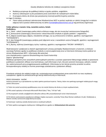 Zasady składania tekstów do redakcji czasopisma Sztuki: Redakcja przyjmuje do publikacji teksty w języku polskim, angielskim. Autorzy zobowiązani są do posiadania praw autorskich do nadsyłanych materiałów. O przyjęciu tekstu do druku (po pozytywnej recenzji) poinformujemy autorów w ciągu 6 miesięcy. Tekst należy przekazać sekretarzowi Wydawnictwa WST w postaci wydruku w całości (mogą być w tekście zdjęcia) lub w postaci elektronicznej na adres [email protected] wg poniższej organizacji: Folder główny o nazwie: imię, nazwisko autora, Sztuki. Podfoldery: Nr 1_Tekst - całość (zawierający pełny tekst w którym mogą, ale nie muszą być zamieszczone fotografie) Nr 2_Streszczenia (zawierający streszczenia i słowa kluczowe artykułu w języku polskim i angielskim) Nr 3_Zdjęcia (zawierający zdjęcia, niezależnie od tego, czy są umieszczone w tekście, zgodnie z wymaganiami "FOTOGRAFIE") Nr 4_Spis fotografii (zawierający podpisy pod zdjęciami wraz z nazwiskiem autora fotografii, zgodnie z wymaganiami "FOTOGRAFIE") Nr 5_Ryciny, wykresy (zawierający ryciny i wykresy, zgodnie z wymaganiami "RYCINY I WYKRESY") Wydrukowane i podpisane w dwóch egzemplarzach umowy pomiędzy Wydawnictwem a Autorem, w którym wyrażają Państwo zgodę na publikacje artykułu w wersji papierowej oraz w Internecie (Umowę można pobrać ze strony Wydawnictwa WST– informacje dla autorów) oraz oświadczenie o zaporze Ghostwriting oraz Guest Autorship Zapora “ghostwriting” Redakcja uprzejmie prosi wszystkich potencjalnych autorów o uczciwe ujawnianie faktycznego wkładu w powstanie publikacji (z podaniem afiliacji oraz kontrybucji, czyli informacji o tym, kto jest autorem koncepcji, założeń, metod itp. wykorzystanych przy przygotowywaniu publikacji). Informację na ten temat prosimy przesłać na adres korespondencyjny redakcji w formie pisemnego oświadczenia z podaniem afiliacji. Przesłanie artykułu do redakcji wiąże się z automatycznym przekazaniem praw autorskich na rzecz wydawcy czasopisma i zgoda na zamieszczenie go wersji elektronicznej w Internecie. PRZED ODDANIEM - WAŻNE Autorzy proszeni są o sprawdzenie czy tekst spełnia poniższe kryteria. Teksty, które nie spełniają wymagań redakcyjnych mogą zostać odrzucone: 1/ Tekst nie został wcześniej opublikowany oraz nie został złożony do druku w innym wydawnictwie. 2/ Plik został zapisany w formacie Microsoft Word (doc) *doc, *rtf lub *odt. 3/ W przypisach zostały uwzględnione aktualne adresy URL przywoływanych stron internetowych. 4/ W tekście zastosowano pojedyncze odstępy między wyrazami, czcionkę Times New Roman wielkości 12 pkt. Śródtytuły w tekście zostały zaznaczone pogrubioną kursywą. 5/ Ilustracje i wykresy zostały dostarczone w osobnych plikach. 6/ Tekst spełnia wymagania stylistyczne i bibliograficzne zgodne ze Wskazówkami dla autorów