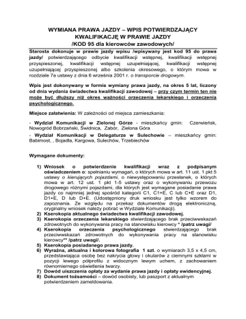 WYMIANA PRAWA JAZDY – WPIS POTWIERDZAJĄCY KWALIFIKACJĘ W PRAWIE JAZDY /KOD 95 dla kierowców zawodowych/ Starosta dokonuje w prawie jazdy wpisu /wpisywany jest kod 95 jazdy/ potwierdzającego odbycie kwalifikacji wstępnej, kwalifikacji przyspieszonej, kwalifikacji wstępnej uzupełniającej, kwalifikacji uzupełniającej przyspieszonej albo szkolenia okresowego, o którym rozdziale 7a ustawy z dnia 6 września 2001 r. o transporcie drogowym. do prawa wstępnej wstępnej mowa w Wpis jest dokonywany w formie wymiany prawa jazdy, na okres 5 lat, liczony od dnia wydania świadectwa kwalifikacji zawodowej – przy czym termin ten nie może być dłuższy niż okres ważności orzeczenia lekarskiego i orzeczenia psychologicznego. Miejsce załatwienia: W zależności od miejsca zamieszkania: - Wydział Komunikacji w Zielonej Górze - mieszkańcy gmin: Nowogród Bobrzański, Świdnica, Zabór, Zielona Góra Czerwieńsk, - Wydział Komunikacji w Delegaturze w Sulechowie – mieszkańcy gmin: Babimost, , Bojadła, Kargowa, Sulechów, Trzebiechów Wymagane dokumenty: 1) Wniosek o potwierdzenie kwalifikacji wraz z podpisanym oświadczeniem o: spełnianiu wymagań, o których mowa w art. 11 ust. 1 pkt 5 ustawy o kierujących pojazdami, o niewystępowaniu przesłanek, o których mowa w art. 12 ust. 1 pkt 1-5 ustawy oraz o wykonywaniu przewozu drogowego różnymi pojazdami, dla których jest wymagane posiadanie prawa jazdy co najmniej jednej spośród kategorii C1, C1+E, C lub C+E oraz D1, D1+E, D lub D+E. (Udostępniony druk wniosku jest tylko wzorem do zapoznania. Ze względu na przekaz dokumentów drogą elektroniczną, oryginalny wniosek należy pobrać w Wydziale Komunikacji). 2) Kserokopia aktualnego świadectwa kwalifikacji zawodowej. 3) Kserokopia orzeczenia lekarskiego stwierdzającego brak przeciwwskazań zdrowotnych do wykonywania pracy na stanowisku kierowcy * /patrz uwagi/ 4) Kserokopia orzeczenia psychologicznego stwierdzającego brak przeciwwskazań zdrowotnych do wykonywania pracy na stanowisku kierowcy** /patrz uwagi/. 5) Kserokopia posiadanego prawa jazdy. 6) Wyraźna, aktualna i kolorowa fotografia 1 szt. o wymiarach 3,5 x 4,5 cm, przedstawiająca osobę bez nakrycia głowy i okularów z ciemnymi szkłami w pozycji lewego półprofilu z widocznym lewym uchem, z zachowaniem równomiernego oświetlenia twarzy. 7) Dowód uiszczenia opłaty za wydanie prawa jazdy i opłaty ewidencyjnej. 8) Dokument tożsamości – dowód osobisty, lub paszport z aktualnym potwierdzeniem zameldowania. Opłaty: 100,00 zł za prawo jazdy 0,50 zł opłata ewidencyjna Opłaty można uiścić: - w kasie urzędu przy ul. Podgórnej 5 (1 piętro, pokój 113), lub w kasie Delegatury w Sulechowie (1 piętro, pokój nr 4) - przelewem na konto tut. Starostwa Termin załatwienia: 9 dni roboczych od dnia złożenia wniosku Tryb odwoławczy: Odwołanie wnosi się do Samorządowego Kolegium Odwoławczego w Zielonej Górze (Aleja Niepodległości 7, 65-048 Zielona Góra), za pośrednictwem Starosty Zielonogórskiego, w terminie 14 dni od doręczenia decyzji. Podstawa prawna: - art. 15 ustawy o kierujących pojazdami z dnia 5 stycznia 2011 r. (Dz. U. z 2014 r., poz. 600 – tekst jednolity z późn. zm), - § 8 ust. 1 pkt. 12 rozporządzenia Ministra Transportu, Budownictwa i Gospodarki Morskiej z dnia 31 lipca 2012 r. w sprawie wydawania dokumentów stwierdzających uprawnienia do kierowania pojazdami (Dz. U. z 2012 r., poz.1005), - rozdział 7a ustawy z dnia 6 września 2001 r. o transporcie drogowym (Dz. U. z 2013 r., poz. 1414 – tekst jednolity z późn. zm.), - § 1 rozporządzenia Ministra Transportu, Budownictwa i Gospodarki Morskiej z dnia 11 stycznia 2013 r. w sprawie wysokości opłat za wydanie dokumentów stwierdzających uprawnienia do kierowania pojazdami (Dz. U. z 2013 r., poz. 83), - rozporządzenie Ministra Spraw Wewnętrznych z dnia 25 czerwca 2014 r. w sprawie opłaty ewidencyjnej stanowiącej przychód Funduszu - Centralna Ewidencja Pojazdów i Kierowców (Dz. U. z 2014 r., poz. 852). UWAGI: * Badania lekarskie muszą być wydane na podstawie art. 39j ustawy o transporcie drogowym w zakresie i na zasadach określonych w przepisach Kodeksu pracy. /Art. 39j ust. 1. - Kierowca wykonujący przewóz drogowy podlega badaniom lekarskim przeprowadzanym w celu stwierdzenia istnienia lub braku przeciwwskazań zdrowotnych do wykonywania pracy na stanowisku kierowcy. Art. 39j ust. 2 - Badania lekarskie, o których mowa w ust. 1, są wykonywane, z zastrzeżeniem ust. 3-6, w zakresie i na zasadach określonych w przepisach 7) ustawy z dnia 26 czerwca 1974 r. - Kodeks pracy (Dz. U. z 1998 r. Nr 21, poz. 94, z późn. zm. ), zwanej dalej "Kodeksem pracy". Art. 39j ust. 3 - Zakres badań lekarskich, o których mowa w ust. 1, obejmuje ponadto ustalenie istnienia lub braku przeciwwskazań zdrowotnych do kierowania pojazdami, zgodnie z rozdziałem 12 ustawy z dnia 5 stycznia 2011 r. o kierujących pojazdami/. Badania lekarskie, o których mowa powyżej, są przeprowadzane: 1) do czasu ukończenia przez kierowcę 60 lat - co 5 lat; 2) po ukończeniu przez kierowcę 60 roku życia - co 30 miesięcy Pierwsze badanie lekarskie jest wykonywane przed dniem wydania świadectwa kwalifikacji zawodowej potwierdzającego ukończenie kwalifikacji. A każde następne dla kierowcy w wieku do 60 lat - w terminie właściwym do ukończenia szkolenia okresowego, jednak nie później niż do dnia wydania świadectwa kwalifikacji zawodowej potwierdzającego ukończenie szkolenia okresowego. Badania lekarskie wykonują lekarze uprawnieni do wykonywania badań profilaktycznych, o których mowa w przepisach Kodeksu pracy, posiadający dodatkowo uprawnienia do przeprowadzania badań lekarskich kandydatów na kierowców i kierowców określone w odrębnych przepisach. Badania psychologiczne muszą art. 39k ustawy o transporcie drogowym. ** być wydane na podstawie /Art. 39k ust. 1 - Kierowca wykonujący przewóz drogowy podlega badaniom 