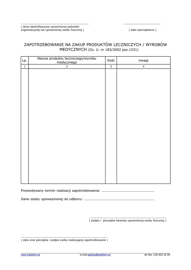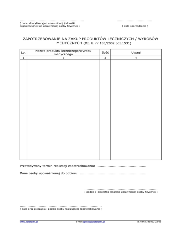 .......................................................... ................................ ( dane identyfikacyjne uprawnionej jednostki organizacyjnej lub uprawnionej osoby fizycznej ) ( data sporządzenia ) ZAPOTRZEBOWANIE NA ZAKUP PRODUKTÓW LECZNICZYCH / WYROBÓW MEDYCZNYCH (Dz. U. nr 183/2002 poz.1531) Lp. Nazwa produktu leczniczego/wyrobu medycznego Ilość Uwagi 1 2 3 4 Przewidywany termin realizacji zapotrzebowania: ............................................. Dane osoby upoważnionej do odbioru: ............................................................ .................................................................. ( podpis i pieczątka lekarska uprawnionej osoby fizycznej ) .......................................................................... ( data oraz pieczątka i podpis osoby realizującej zapotrzebowanie ) www.katefarm.pl e-mail:[email protected] tel./fax: (33) 822 22 65