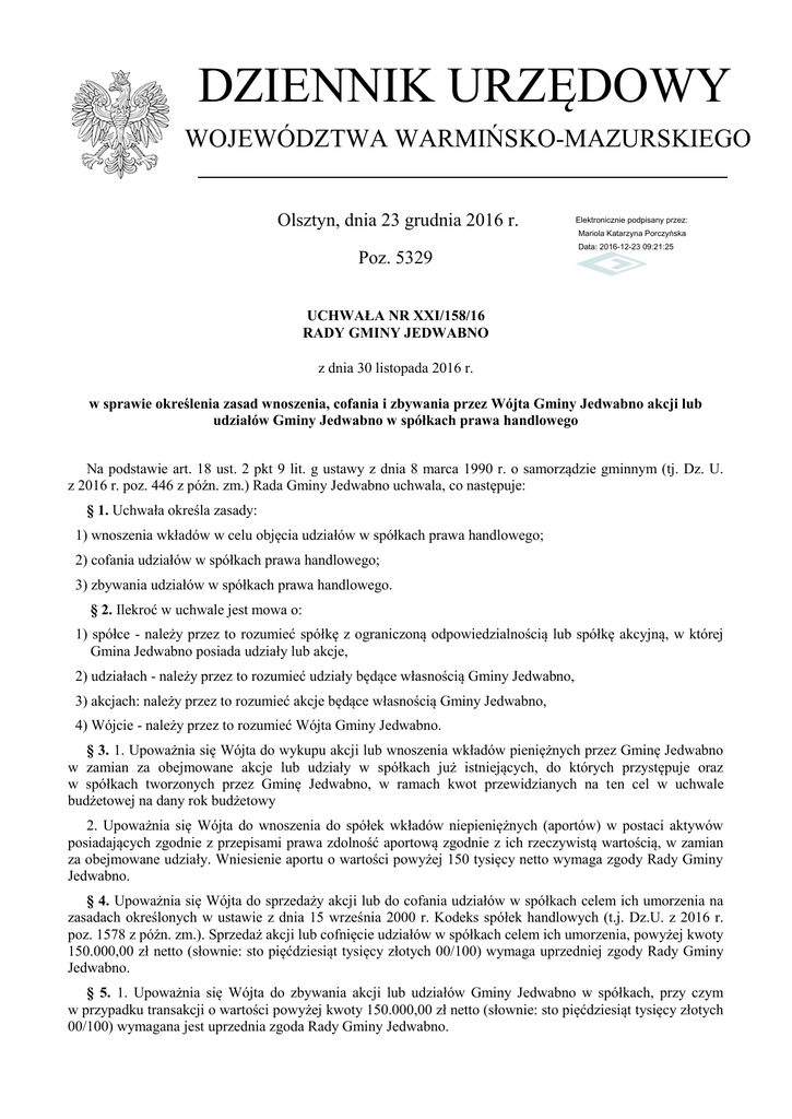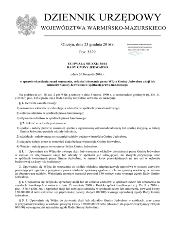DZIENNIK URZĘDOWY WOJEWÓDZTWA WARMIŃSKO-MAZURSKIEGO Olsztyn, dnia 23 grudnia 2016 r. Elektronicznie podpisany przez: Mariola Katarzyna Porczyńska Poz. 5329 Data: 2016-12-23 09:21:25 UCHWAŁA NR XXI/158/16 RADY GMINY JEDWABNO z dnia 30 listopada 2016 r. w sprawie określenia zasad wnoszenia, cofania i zbywania przez Wójta Gminy Jedwabno akcji lub udziałów Gminy Jedwabno w spółkach prawa handlowego Na podstawie art. 18 ust. 2 pkt 9 lit. g ustawy z dnia 8 marca 1990 r. o samorządzie gminnym (tj. Dz. U. z 2016 r. poz. 446 z późn. zm.) Rada Gminy Jedwabno uchwala, co następuje: § 1. Uchwała określa zasady: 1) wnoszenia wkładów w celu objęcia udziałów w spółkach prawa handlowego; 2) cofania udziałów w spółkach prawa handlowego; 3) zbywania udziałów w spółkach prawa handlowego. § 2. Ilekroć w uchwale jest mowa o: 1) spółce - należy przez to rozumieć spółkę z ograniczoną odpowiedzialnością lub spółkę akcyjną, w której Gmina Jedwabno posiada udziały lub akcje, 2) udziałach - należy przez to rozumieć udziały będące własnością Gminy Jedwabno, 3) akcjach: należy przez to rozumieć akcje będące własnością Gminy Jedwabno, 4) Wójcie - należy przez to rozumieć Wójta Gminy Jedwabno. § 3. 1. Upoważnia się Wójta do wykupu akcji lub wnoszenia wkładów pieniężnych przez Gminę Jedwabno w zamian za obejmowane akcje lub udziały w spółkach już istniejących, do których przystępuje oraz w spółkach tworzonych przez Gminę Jedwabno, w ramach kwot przewidzianych na ten cel w uchwale budżetowej na dany rok budżetowy 2. Upoważnia się Wójta do wnoszenia do spółek wkładów niepieniężnych (aportów) w postaci aktywów posiadających zgodnie z przepisami prawa zdolność aportową zgodnie z ich rzeczywistą wartością, w zamian za obejmowane udziały. Wniesienie aportu o wartości powyżej 150 tysięcy netto wymaga zgody Rady Gminy Jedwabno. § 4. Upoważnia się Wójta do sprzedaży akcji lub do cofania udziałów w spółkach celem ich umorzenia na zasadach określonych w ustawie z dnia 15 września 2000 r. Kodeks spółek handlowych (t.j. Dz.U. z 2016 r. poz. 1578 z późn. zm.). Sprzedaż akcji lub cofnięcie udziałów w spółkach celem ich umorzenia, powyżej kwoty 150.000,00 zł netto (słownie: sto pięćdziesiąt tysięcy złotych 00/100) wymaga uprzedniej zgody Rady Gminy Jedwabno. § 5. 1. Upoważnia się Wójta do zbywania akcji lub udziałów Gminy Jedwabno w spółkach, przy czym w przypadku transakcji o wartości powyżej kwoty 150.000,00 zł netto (słownie: sto pięćdziesiąt tysięcy złotych 00/100) wymagana jest uprzednia zgoda Rady Gminy Jedwabno. Dziennik Urzędowy Województwa Warmińsko-Mazurskiego –2– Poz. 5329 2. Akcje lub udziały mogą być zbywane w trybie: 1) negocjacji podjętych na podstawie publicznego zaproszenia; 2) przetargu publicznego; 3) oferty ogłoszonej publicznie; 4) sprzedaży na podstawie oferty publicznej w obrocie zorganizowanym lub poza obrotem zorganizowanym w rozumieniu przepisów o obrocie instrumentami finansowymi. 3. Akcje lub udziały w spółkach, w których Gmina Jedwabno posiada nie więcej niż 25 % wartości akcji lub udziałów w kapitale zakładowym spółki, mogą być zbywane z pominięciem trybów określonych w ust. 2. Przed zaoferowaniem do zbycia całości lub części akcji lub udziałów w spółkach, dokonuje się wyceny wartości zbywanych akcji lub udziałów. § 6. 1. O każdym wykupie akcji, wniesienia wkładu bądź sprzedaży akcji lub cofnięciu udziałów, Wójt informuje Radę Gminy na najbliższej sesji Rady Gminy następującej po wykupie akcji, objęciu lub cofnięciu udziałów lub występuje o zgodę zgodnie z § 4. 2. Informację o zamiarze zbycia akcji lub udziałów Wójt przekazuje Radzie Gminy przed podjęciem czynności zbycia akcji lub udziałów lub występuje o zgodę zgodnie z § 5 ust. 1. 3. Informacje, o których mowa w ust. 1 i 2 zawierają między innymi: 1) nazwę spółki, ilość i wartość wykupionych, objętych, cofniętych lub zbywanych akcji lub udziałów; 2) cenę akcji lub udziałów według wyceny; 3) tryb zbywania akcji lub cofnięcia udziałów; 4) dane dotyczące zaangażowania Gminy Jedwabno w kapitale zakładowym spółki po wykupie, objęciu, cofnięciu, a także zbyciu akcji lub udziałów. § 7. Gmina Jedwabno może w szczególności obejmować udziały w spółkach już istniejących, do których przystąpiła bądź przystępuje oraz spółkach tworzonych i współtworzonych przez Gminę. § 8. Wykonanie uchwały powierza się Wójtowi Gminy Jedwabno. § 9. Uchwała wchodzi w życie po upływie 14 dni od dnia ogłoszenia w Dzienniku Urzędowym Województwa Warmińsko-Mazurskiego. Przewodnicząca Rady Gminy Elżbieta Brzóska