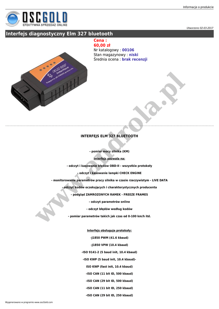 Informacje o produkcie Utworzono 02-03-2017 Interfejs diagnostyczny Elm 327 bluetooth Cena : 60,00 zł ro la .p l Nr katalogowy : 00106 Stan magazynowy : niski Średnia ocena : brak recenzji nd INTERFEJS ELM 327 BLUETOOTH - pomiar mocy silnika (KM) Interfejs pozwala na: w .a - odczyt i kasowanie błędów OBD-II - wszystkie protokoły - odczyt i kasowanie lampki CHECK ENGINE - monitorowanie parametrów pracy silnika w czasie rzeczywistym - LIVE DATA - odczyt kodów oczekujących i charakterystycznych producenta w w - podgląd ZAMROZONYCH RAMEK - FREEZE FRAMES - odczyt parametrów online - odczyt błędów według kodów - pomiar parametrów takich jak czas od 0-100 km/h itd. Interfejs obsługuje protokoły: -J1850 PWM (41.6 kbaud) -J1850 VPW (10.4 kbaud) -ISO 9141-2 (5 baud init, 10.4 kbaud) -ISO KWP (5 baud init, 10.4 kbaud)ISO KWP (fast init, 10.4 kbaud) -ISO CAN (11 bit ID, 500 kbaud) -ISO CAN (29 bit ID, 500 kbaud) -ISO CAN (11 bit ID, 250 kbaud) -ISO CAN (29 bit ID, 250 kbaud) Wygenerowano w programie www.oscGold.com Umożliwia diagnozowanie wszystkich systemów w samochodzie: - elektroniki silnika - układu paliwowego - układu dolotu powietrza - automatycznej skrzyni biegów - elektroniki pompy diesla - systemów hamowania - klimatyzacji - deski rozdzielczej - immobilizera - modułu komfortu la - elektrycznych szyb .p l - wspomagania elektrycznego kierownicy - nawigacji satelitarnej ro - elektroniki szyberdachu - i innych zależnie od modelu samochodu i oprogramowania... nd Współpracuje z oprogramowaniem diagnostycznym: - Scantool.net - Engine Check (bardzo dobry do diagnozowania starszych samochodow z niepelnym wsparciem dla OBD-2) w .a -GM Mode 22 Scan Tool by Terry -OBD Gauge for PalmOS and Pocket PC by Dana Peters -OBD Logger by Jonathan Senkerik -OBD-II ScanMaster by Wladimir Gurskij (ScanMaster 3.52 - local copy) w w -obd2crazy.com -OBD2 Scantool by Ivan Andrzejewski -OBDII for ELM322 by David Huffman -pyOBD by Donour Sizemore for MacOSX and Linux -RDDTC by Pete Calinski -Real Scan by Brent Harris -ScanTest for Pocket PC by Ivan Ganev aka a-ser -wOBD by WDT -easy OBD -DigiMoto -PCMSCAN (umożliwia m.in. pomiar mocy i czasow) -i wieloma innymi darmowymi i płatnymi programami również w wersji PL Wymagania sprzętowe: - Windows 95, 98, 2000, XP, Informacje o produkcie - wolny port USB w komputerze, laptopie, PDA - gniazdo OBD2 w samochodzie DO INTERFEJSU NIE DOŁĄCZAMY ZADNEGO PROGRAMOWANIA LISTA OBSŁUGIWANYCH SAMOCHODÓW: Europejskie osobowe, terenowe i dostawcze od 1996 roku: - Alfa Romeo:147, 156, 159, 166, GT, GTV, Brera, Crosswagon, Spider, Sportwagon - Audi:A2, A3, S3, A4, S4, A6, S6, A8, S8, allroad, Cabriolet, Coupe, Q7, Quattro, RS2, RS4, RS6, TT, V8 - BMW:seria 1 116, 118, 120, 130, seria 3 316, 318, 320, 323, 325, 328, 330, 335, seria 5 518, 520, 523, 524, 525, 528, 530, 535, 540, 545, 550, seria 6 630, 635, 645, 650, seria 7 725, 728, 730, 732, 735, 740, 745, 750, 760, seria 8 840, 850, MPower M3, M5, M6 ,Z4 M, X-seria X3, X5, Z-seria Z3, Z4, Z8 - Dacia: Logan, Pick up .p l - Citroen: Berlingo, C1, C2, C3, C4, C5, C6, C8, CX, Evasion, Jumpy, SAXO, Xantia, Xsara, Xsara Picasso la - Fiat: Albea, Barchetta, Brava, Bravo, Coupe, Croma, Dino, Doblo, Ducato, Grande Punto, Idea, Marea, Marengo, Multipla, Palio Weekend, Palio, Panda, Punto, Scudo, Sedici, Siena, Stilo, Ulysse - Ford: Aerostar, Bronco, Cougar, Courier, Crown, Ecoline, Escape, Escort, Excursion, Expedition, Explorer, Express, F150, F250, F350, Fairlane, Falcon, Fiesta, Focus,Focus C-Max, Fusion, GT, Galaxy, Granada, Ka, Maverick, Stretka, Ka, Maverick, Mondeo, Mustang, Probe, Puma, Ranger, S-max, Thunderbird, Tourneo, Taurus, Transit, ro - Jaguar: Daimler, E-type, S-type, X-type, XJR, XJS, XJ, XJ6, XJ8, XJ12, XJ40, XJR, XJS, XJSC, XK, XKR - Lancia: Gamma, Kappa, Lybra, Musa, Phedra, Thema, Thesis, Ypsilon, Zeta nd - Land Rover: Defender, Discovery, Freelander, Range Rover, Range Rover Sport - Mercedes Benz: A-klasa, B-klasa, C-klasa, CE-klasa, CL-klasa, CLK-klasa, CLS-klasa, E-klasa, G-klasa, GL-klasa, ML-klasa, R-Klasa, S-klasa, SL-klasa, SLK-klasa, SLR, Sprinter, V-klasa V200, V220, V230, V280, Vaneo, Vario, Viano, Vito - Mini: Cooper, Cooper S, ONE w .a - Opel: Agila, Antara, Arena, Astra, Calibra, Campo, Cavalier, Combo, Corsa, Frontera, GT, Merita, Monterey, Movano, Nova, Omega, Signum, Sintra, Speedster, Tigra, Vivaro, Vectra, Zafira - Peugeot: 106, 107, 206, 207, 306, 307, 406, 407, 605, 607, 806, 807, 1007, Boxer, Expert, J5, Partner - Porsche: 911, Boxster, Carrera GT, Cayenne, Cayman w w - Renault: (Tylko nowe modele po 2002 roku) Avantime, Clio, Coupe, Espace, Express, Fuego, Grand Espace, Grand Scenic, Kangoo, Laguna, Mascott, Master, Megane, Modus, Safrane, Scenic, Spider, Trafic, Twingo, Vel Satis - Rover: 75, 600, 618, 620, 623, 800, 820, 825, 827 - Saab: 9-3, 9-5, 9-7X - Seat: Alhambra, Altea, Arosa, Cordoba, Ibiza, Inca, Leon, Terra, Toledo - Skoda: Fabia, Felicia, Octavia, Roomster, Superb - Smart: Crossblade, ForFour, ForTwo, Roadster - Volvo: 850, C70, Polar, S40, S60, S70, S80, S90, V40, V50, V70, V90, XC 70, XC 90 - Volkswagen: Bora, Buggy, Caddy, Corrado, Eos, Fox, Golf, Iltis, Jetta, Karmann Ghia, Kafer, LT, Lupo, New Beetle, Passat, Phaeton, Polo, Sharan, T3, T4, T5, Caravelle, Multivan, Shuttle, Taro, Touareg, Touran, Vento Amerykańskie osobowe, terenowe i dostawcze od 1996 roku: - Buick: Century, Elektra, Le Sabie, Park Avenue, Regal, Riviera, Roadmaster, Skylark - Cadillac: Allante, BLS, CTS, Deville, Eldorado, Escalade, Fleetwood, SRX, STS, Seville, XLR - Chevrolet: 2500, Alero, Astro, Avalanche, Aveo, Beretta, Blazer, C1500, Camaro, Caprice, Captiva, Cavalier, Chevelle, Chevy Van, Citation, Colorado, Corsica, El Camino, Epica, Evanda, G, Impala, K30, K1500, Kalos, Lacetti, Lumina, Malibu, Matiz, Nubira, Rezzo, S-10, SSR, Silverado, Suburban, Tahoe, Trailblazer, Trans Sport, Venture - Chrysler: 300M, 300C, Crosssfire, Daytona, ES, GS, GTS, Grand Voyager, Le Baron, Neon, Ne