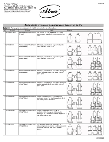 Strona 1/8 P.P.H.U. "ATRA" Kilińskiego 59, 27-400 Ostrowiec Św. Tel.: 041 265 30 60, NIP: 661-100-50-18 Bank Spółdzielczy Ostrowiec Św., 05850700042001000160010001 Zestawienie wymiarów do pokrowców typowych do Vw Opis: Lp Pełny wykaz zwymiarowanych modeli samochodów ze schematami. Symbol Nazwa Opis 1 E-VW.CD.3/01 Pokrowiec do VW Cady III 1+1 przód, 2+1 tył; zagłówki: 4+1; pasy (5 foteli) wychodzęce w podwójnym siedzeniu; rok: 2004-... 2 E-VW.SH/01 Pokrowiec do VW Sharan 5 foteli; 2 podłokietniki; zagłówki: 5; rok: VAN (5 foteli) 1997; zakres: 1995-2001 3 E-VW.SH/02 Pokrowiec do VW Sharan 7 foteli; 2 podłokietniki; zagłówki: 7; rok: VAN (7 foteli) 1997; zakres: 1995-2001 4 E-VW.SH/03 Pokrowiec do VW Sharan 5 foteli; 2 podłokietniki; poduszki; otwory na VAN (5 foteli) stoliki; zagłówki: 2+3; rok: 2004; zakres: 2001-2006 5 E-VW.SH/04 Pokrowiec do VW Sharan 7 foteli; 2 podłokietniki; poduszki; otwory na VAN (7 foteli) stoliki; zagłówki: 2+5; rok: 2004; zakres: 2001-2006 6 E-VW.SH/05 Pokrowiec do VW Sharan 7 foteli kubełkowych ; 2 podłokietniki; VAN (7 foteli) poduszki; otwory na stoliki; zagłówki: 2+5; rok: 2008;zakres: do 2010 7 E-VW.SH/06 Pokrowiec do VW Sharan 7 foteli kubełkowych; poduszki; 2 VAN (7 foteli) podłokietnikii; otwory na stoliki;foteliki dziecięce w 3 fotelach tylnych; zagłówki: 7; rok: 2000;zakres: do 8 E-VW.TU/01 Pokrowiec do VW Touran 5 pojedyncych siedzeń; zagłówki: 4+1; VAN (5 foteli) schowek przód; poduszki; osobne wałeczki w tylnych fotelach; rok: 2003; zakres: 2003-... Zdjęcie 2012-03-23 Strona 2/8 www.atra.auto.pl [email protected] Lp Symbol Nazwa Opis 9 E-VW.TU/02 Pokrowiec do VW Touran 7 pojedyncych siedzeń; zagłówki: 6+1; VAN (7 foteli) schowek przód; poduszki; osobne wałeczki w tylnych fotelach; rok: 2003; zakres: 2003-... 10 E-VW.TU/03 Pokrowiec do VW Touran 5 pojedyncych siedzeń; zagłówki: 4+1; VAN (5 foteli) schowek przód; poduszki; osobne wałeczki w tylnych fotelach; pokrętła lędźwiowe; stoliki w przednich fotelach; rok:2008; zakres:2007-... 11 S-VW.BO/01 Pokrowiec do VW Bora Sedan Tył 2/3; 4 zagłówki; zakres: 1997-2005 12 S-VW.BO/02 Pokrowiec do VW Bora Sedan Tył 2/3; 4 zagłówki; podłokietnik tył; zakres: 1997-2005 13 S-VW.BO/03 Pokrowiec do VW Bora Sedan Tył 2/3; 4 zagłówki; podłokietnik tył; poduszki, zakres: 1997-2005 14 S-VW.BO/04 Pokrowiec do VW Bora Sedan Tył 2/3; 4 zagłówki; kubełki, podłokietnik tył; poduszki; rok: 2000; zakres: 1997-2005 15 S-VW.FO/01 Pokrowiec do VW Fox Tył cały; 4 zagłówki; kubełki; rok: 2005; pasy z kanapy; podstawka na napoje w kanapie; zakres: 2004-.. 16 S-VW.GO.2/01 Pokrowiec do VW Golf II Hatchback Tył cały; zagłówki: 2; kubełki; rok: 1990; zakres: 1983-1992 17 S-VW.GO.2/02 Pokrowiec do VW Golf II Hatchback Tył 2/3; zagłówki: 2; rok: 1987; zakres: 1983-1992 18 S-VW.GO.2/03 Pokrowiec do VW Golf II Copue Tył cały; zagłówki: 2; kubełki; rok: 1990; zakres: 1983-1992 Zdjęcie 2012-03-23 Strona 3/8 www.atra.auto.pl [email protected] Lp Symbol Nazwa Opis 19 S-VW.GO.3/01 Pokrowiec do VW Golf III Tył 2/3; zagłówki 2; kubełki; rok: 1994; Hatchback zakres: 1991-1999 20 S-VW.GO.3/02 Pokrowiec do VW Golf III Tył 2/3; zagłówki: 2; kubełki; ROK: 1994; 3 Hatchback drzwi; GTI; zakres: 1991-1999 21 S-VW.GO.3/03 Pokrowiec do VW Golf III Tył 2/3; zagłówki: 2; 3 drzwi; rok: 1994; Hatchback zakres: 1991-1999 22 S-VW.GO.3/04 Pokrowiec do VW Golf III Tył 2/3; zagłówki: 2; rok: 1994; zakres: Hatchback 1991-1999 23 S-VW.GO.3/05 Pokrowiec do VW Golf III Tył cały; zagłówki: 4; rok: 1997; zakres: Hatchback 1991-1999 24 S-VW.GO.3/06 Pokrowiec do VW Golf III Tył 2/3; zagłówki 4; kubełki; rok: 1997; Hatchback zakres: 1991-1999 25 S-VW.GO.4/01 Pokrowiec do VW Golf IV Tył 2/3; zagłówki: 4; podłokietnik tył; rok; Hatchback 1998; zakres: 1997-2006 26 S-VW.GO.4/02 Pokrowiec do VW Golf IV Tył 2/3; zagłówki: 2+2; podłokietnik tył; ROK: Hatchback 2001; kombi; pasy wychodzące z siedziska; zakres: 1997-2006 27 S-VW.GO.4/03 Pokrowiec do VW Golf IV Tył 2/3; zagłówki: 4; rok: 2000; zakres: Hatchback 1997-2006 28 S-VW.GO.4/04 Pokrowiec do VW Golf IV Tył cały; zagłówki: 4; rok: 2000; zakres: Hatchback 1997-2006 Zdjęcie 2012-03-23 Strona 4/8 www.atra.auto.pl [email protected] Lp Symbol Nazwa Opis 29 S-VW.GO.4/05 Pokrowiec do VW Golf IV Tył 2/3; zagłówki: 4; siedzenia Hatchback kubełkowe,poduszki; rok: 2000; zakres: 1997-2006 30 S-VW.GO.4/06 Pokrowiec do VW Golf IV Tył 2/3; zagłówki: 4; poduszki; rok: 2000; Hatchback zakres: 1997-2006 31 S-VW.GO.5/01 Pokrowiec do VW Golf V Hatchback Oparcie2/3; zagłówki:2+2+1; pas wychodzacy z oparcia; otwory w kanapie na foteliki dzicięce; boczki; poduszki; prowadnice na pasy w boczkach; rok:2005; zakres:2003-2008 32 S-VW.GO.5+/01 Pokrowiec do VW Golf V Plus Tył 1/3; zagłówki: 2+3; poduszki; podłokietnik tył; schowek przod; pasy z kanapy i oparcia; ROK: 2006; zakres: 2003-2008 33 S-VW.GO.6/01 Pokrowiec do VW Golf VI Oparcie 2/3; zagłówki: 2+2+1; pas Hatchback wychodzacy z oparcia i kanapy; otwory na fotelik dzicięcy; poduszki ; rok: 2009; zakres: 2008-... 34 S-VW.GO.6/02 Pokrowiec do VW Golf VI Oparcie 2/3; zagłówki: 2+2+1; pas Hatchback wychodzacy z oparcia i kanapy; otwory na fotelik dzicięcy; poduszki ; podłokietnik tył; schowek przód; regulacja lędżwiowa; rok: 2009; comfort line; zakres: 2008-... 35 S-VW.JE.1/02 Pokrowiec do VW Jetta I Sedan 36 S-VW.JE.2/01 Pokrowiec do VW Jetta II Tył cały; zagłówki: 4; rok: 1987; zakres: Sedan 1984-1992 37 S-VW.JE.5/03 Pokrowiec do VW Jetta (A3) V Sedan Oparcie 2/3; pas z kanapy ,boczki, poduszki ,zagłówki 2+2+1; rok: 2006; zakres: 2005-... 38 S-VW.LU/01 Pokrowiec do VW Lupo Tył 1/2; 4 zagłówki; rok: 2001 Zdjęcie Tył cały (garby); zagłówki: 2; rok: 1982; zakres: 1979-1984 2012-03-23 Strona 5/8 www.atra.auto.pl [email protected] Lp Symbol Nazwa Opis 39 S-VW.PA.B3/01 Pokrowiec do VW Passat Tył cały; zagłówki: 2; wym: 1992; zakr