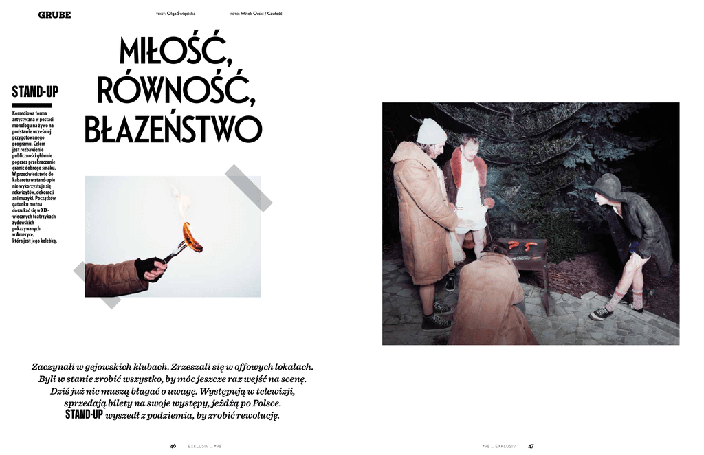 GRUBE Stand-up Komediowa forma artystyczna w postaci monologu na żywo na podstawie wcześniej przygotowanego programu. Celem jest rozbawienie publiczności głównie poprzez przekraczanie granic dobrego smaku. W przeciwieństwie do kabaretu w stand-upie nie wykorzystuje się rekwizytów, dekoracji ani muzyki. Początków gatunku można doszukać się w XIX-wiecznych teatrzykach żydowskich pokazywanych w Ameryce, która jest jego kolebką. tekst: Olga Święcicka foto: Witek Orski / Czułość Miłość, równość, błazeństwo Zaczynali w gejowskich klubach. Zrzeszali się w offowych lokalach. Byli w stanie zrobić wszystko, by móc jeszcze raz wejść na scenę. Dziś już nie muszą błagać o uwagę. Występują w telewizji, sprzedają bilety na swoje występy, jeżdżą po Polsce. Stand-up wyszedł z podziemia, by zrobić rewolucję. 46 exklusiv ... #98 #98 ... exklusiv 47 K „Najgorszą reakcją jest brak reakcji” rzyśka Unruga spotkało to podczas debiutu w Ustach Mariana pod koniec 2009 roku. Jego pierwszy występ był tak skuteczny, że miesiąc po nim klub zbankrutował. Nie przejął się porażką. Mówi o sobie: „homoseksualista, cyklista i rekreacyjny alkoholik” i jest w tym dużo prawdy. Poza sceną jest smutnym bezrobotnym aktorem czekającym na nieuchronną zagładę cywilizacji. Depresyjny i neurotyczny jest również Antek Syrek-Dąbrowski – psycholog i nauczyciel angielskiego. Do tego jest rudy i kiepski w łóżku, co ostatecznie przekreśla jego szanse na życiowy sukces. Stand-upem zajął się, by odreagować stres związany z licznymi niepowodzeniami. Razem z kolegami komikami założył grupę Stand-up Polska, w której po cichu się realizuje. Michał Kempa pierwszy raz „mówił do ludzi” w podstawówce podczas szkolnej akademii, drugi raz na scenę wyszedł już w świetle reflektorów w programie Stand up. Zabij mnie śmiechem. – Ten program to była taka droga na skróty, teraz muszę za to zapłacić – mówi. Wziął w nim udział powodowany próżnością i poczuciem, że to ostatni moment, żeby zmienić coś w swoim monotonnym prawniczym życiu. Wygrał. Co innego Maciek Buchwald – reżyser, aktor Klancyka, człowiek undergroundu. Do występowania namawiali go koledzy, ale on długo nie chciał się zgodzić. – Przez pewien czas uważałem, że stand-up nie nadaje się na polski grunt, że to jest coś rdzennie anglosaskiego – wyjaśnia. – Z jakiegoś powodu oni mają świetnego Family Guya, a my Włatców móch. W końcu wyszedł na scenę. – Zrobiłem to z ciekawości – tłumaczy. – Potrzebowałem wyzwania. Czterech mężczyzn, cztery historie, cztery rodzaje humoru i jeden mikrofon. Połączyła ich scena, na którą każdy z nich wszedł choć raz, by ośmieszając siebie i świat, rozśmieszyć innych. „Obudziłem się nad ranem zlany potem, w drżączce, krzycząc: »Kurwa, co ja zrobiłem!«” Pierwszy raz Antka nie należał do udanych, mimo że swój program szykował przez kilka tygodni. – Wyjść na scenę, przełamać strach, powiedzieć coś od siebie – to było moje marzenie – mówi. W realizacji pomógł mu reżyser HBO, którego poznał, pracując za barem na Chłodnej. Razem przygotowywali pierwszy tekst. Było to o tyle łatwe, że Antek dobrze znał temat. Od połowy lat 90. oglądał stand-upy w telewizji satelitarnej, przy okazji ucząc się angielskiego. Występy kontrowersyjnych, łamiących tabu komików, tak odmienne od polskiej, biesiadnej sceny kabaretowej, były dla niego wielkim odkryciem. – Wszystko w życiu zawdzięczam temu, że ktoś mi mówi: „zrób to!” – przyznaje Maciek, ale pod tym wyznaniem równie dobrze mógłby podpisać się Kempa. Jego historia zaczęła się od przypadku. Michał od dawna myślał o jakiejś zmianie, ale gdyby nie znajomy, który powiedział mu o castingu do programu, pewnie nic by z tego nie wyszło. – Mam fizyczne i psychiczne predyspozycje do tego, żeby być ciapą – wyznaje. – Zawsze byłem najwolniejszy, najmniej praktyczny. Nikt nie wierzył, że mi się uda. Byłem wtedy u rodziców w Bielsku, wstałem o 6 rano, usiadłem na łóżku i sennie mamrotałem: „Jechać, nie jechać”. W ostatniej chwili zerwałem się na dworzec. W pociągu wymyśliłem mój pierwszy program. O przejściu do drugiego etapu dowiedział się podczas pierwszego dnia wakacji. Spał ze znajomymi gdzieś na plaży w Grecji, gdy zadzwonił telefon. Ostatnie pieniądze wydał na bilet powrotny. Następnego dnia, po kilkunastu godzinach szalonej podróży, znów był na scenie. – Wtedy odkryłem, że to mój żywioł – śmieje się. – Jak wchodzę na scenę, czuję się, jakbym wziął tonę koksu. krzysztof unrug: homoseksualista, cyklista i rekreacyjny alkoholik 48 exklusiv ... #98 michał kempa nigdy nie śmieje się z religii i polityki. po pierwsze dlatego, że jest wierzący, po drugie dlatego, że wszyscy to robią Energia, którą wytwarza komik, jest kluczowa, nakręca publiczność, generuje śmiech. – Najważniejsze jest pierwsze siedem sekund – mówi Unrug. – Albo kupią twój żart, albo nie. Krzysiek nauczył się tego po jednym z pamiętnych występów. – W pierwszym rzędzie siedziały plotkujące dziewczyny – opowiada. – Nie mogłem skupić się na tym, co mówię, cały czas słyszałem ich chichot. W końcu powiedziałem: „Widzę, że mamy tu z przodu całą obsadę filmu Galerianki”. Wyszły, trzaskając drzwiami. A ja dostałem brawa. Udany występ to wypadkowa wielu czynników, liczy się nie tylko widz, ale też miejsce występu, umiejętność spontanicznego reagowania, a także to, kto występuje przed tobą i jaką zostawia atmosferę na sali. Wszyscy komicy zgodnie przyznają, że najłatwiej ma ostatni występujący, bo publiczność jest już rozgrzana. Podkreślają jednak, że nie ma reguł, czasem warto na przykład nowy program przetestować na początku, kiedy atmosfera jest jeszcze „czysta”. „Ba
