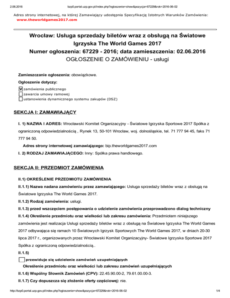 2.06.2016 bzp0.portal.uzp.gov.pl/index.php?ogloszenie=show&pozycja=67229&rok=20160602 Adres strony internetowej, na której Zamawiający udostępnia Specyfikację Istotnych Warunków Zamówienia: www.theworldgames2017.com Wrocław: Usługa sprzedaży biletów wraz z obsługą na Światowe Igrzyska The World Games 2017 Numer ogłoszenia: 67229 2016; data zamieszczenia: 02.06.2016 OGŁOSZENIE O ZAMÓWIENIU usługi Zamieszczanie ogłoszenia: obowiązkowe. Ogłoszenie dotyczy: V zamówienia publicznego zawarcia umowy ramowej ustanowienia dynamicznego systemu zakupów (DSZ) SEKCJA I: ZAMAWIAJĄCY I. 1) NAZWA I ADRES: Wrocławski Komitet Organizacyjny Światowe Igrzyska Sportowe 2017 Spółka z ograniczoną odpowiedzialnością , Rynek 13, 50101 Wrocław, woj. dolnośląskie, tel. 71 777 94 45, faks 71 777 94 50. Adres strony internetowej zamawiającego: bip.theworldgames2017.com I. 2) RODZAJ ZAMAWIAJĄCEGO: Inny: Spółka prawa handlowego. SEKCJA II: PRZEDMIOT ZAMÓWIENIA II.1) OKREŚLENIE PRZEDMIOTU ZAMÓWIENIA II.1.1) Nazwa nadana zamówieniu przez zamawiającego: Usługa sprzedaży biletów wraz z obsługą na Światowe Igrzyska The World Games 2017. II.1.2) Rodzaj zamówienia: usługi. II.1.3) przed wszczęciem postępowania o udzielenie zamówienia przeprowadzono dialog techniczny II.1.4) Określenie przedmiotu oraz wielkości lub zakresu zamówienia: Przedmiotem niniejszego zamówienia jest realizacja Usługi sprzedaży biletów wraz z obsługą na Światowe Igrzyska The World Games 2017 odbywająca się ramach 10 Światowych Igrzysk Sportowych The World Games 2017, w dniach 2030 lipca 2017 r., organizowanych przez Wrocławski Komitet Organizacyjny Światowe Igrzyska Sportowe 2017 Spółka z ograniczoną odpowiedzialnością.. II.1.5) przewiduje się udzielenie zamówień uzupełniających Określenie przedmiotu oraz wielkości lub zakresu zamówień uzupełniających II.1.6) Wspólny Słownik Zamówień (CPV): 22.45.90.002, 79.61.00.003. II.1.7) Czy dopuszcza się złożenie oferty częściowej: nie. http://bzp0.portal.uzp.gov.pl/index.php?ogloszenie=show&pozycja=67229&rok=20160602 1/4 2.06.2016 bzp0.portal.uzp.gov.pl/index.php?ogloszenie=show&pozycja=67229&rok=20160602 II.1.8) Czy dopuszcza się złożenie oferty wariantowej: nie. II.2) CZAS TRWANIA ZAMÓWIENIA LUB TERMIN WYKONANIA: Zakończenie: 31.03.2018. SEKCJA III: INFORMACJE O CHARAKTERZE PRAWNYM, EKONOMICZNYM, FINANSOWYM I TECHNICZNYM III.1) WADIUM Informacja na temat wadium: Zamawiający wymaga wniesienia wadium w wysokości 30 000,00 (słownie: trzydzieści tysięcy 00/100 złotych). 1. Wadium może być wniesione w następujących formach: 1) pieniądzu, 2) poręczeniach bankowych lub poręczeniach spółdzielczej kasy oszczędnościowokredytowej, z tym że poręczenie kasy jest zawsze poręczeniem pieniężnym, 3) gwarancjach bankowych, 4) gwarancjach ubezpieczeniowych, 5) poręczeniach udzielanych przez podmioty, o których mowa w art. 6b ust. 5 pkt. 2 ustawy z 9.11.2000 o utworzeniu Polskiej Agencji Rozwoju Przedsiębiorczości (tekst jednolity Dz.U. z 2007 r. nr 42, poz. 275, ze zm.). III.2) ZALICZKI III.3) WARUNKI UDZIAŁU W POSTĘPOWANIU ORAZ OPIS SPOSOBU DOKONYWANIA OCENY SPEŁNIANIA TYCH WARUNKÓW III. 3.1) Uprawnienia do wykonywania określonej działalności lub czynności, jeżeli przepisy prawa nakładają obowiązek ich posiadania Opis sposobu dokonywania oceny spełniania tego warunku Zamawiający nie stawia szczegółowych wymagań w zakresie tego warunku. Wykonawcy potwierdzają spełnienie tego warunku poprzez złożenie oświadczenia. III.3.2) Wiedza i doświadczenie Opis sposobu dokonywania oceny spełniania tego warunku realizacji międzynarodowej promocji i sprzedaży biletów minimum 3 (słownie: trzech) wydarzeń o widowni minimum 10 000 osób, przygotowania i opracowania modeli biznesowych, estymacji cen biletów dla międzynarodowych wydarzeń, minimum 1 (słownie: jedno) wydarzenie o widowni minimum 20 000 osób, III.3.5) Sytuacja ekonomiczna i finansowa Opis sposobu dokonywania oceny spełniania tego warunku Zamawiający nie stawia szczegółowych wymagań w zakresie tego warunku. Wykonawcy potwierdzają spełnienie tego warunku poprzez złożenie oświadczenia. III.4) INFORMACJA O OŚWIADCZENIACH LUB DOKUMENTACH, JAKIE MAJĄ DOSTARCZYĆ WYKONAWCY W CELU POTWIERDZENIA SPEŁNIANIA WARUNKÓW UDZIAŁU W POSTĘPOWANIU ORAZ NIEPODLEGANIA WYKLUCZENIU NA PODSTAWIE ART. 24 UST. 1 USTAWY III.4.1) W zakresie wykazania spełniania przez wykonawcę warunków, o których mowa w art. 22 ust. 1 ustawy, oprócz oświadczenia o spełnianiu warunków udziału w postępowaniu należy przedłożyć: http://bzp0.portal.uzp.gov.pl/index.php?ogloszenie=show&pozycja=67229&rok=20160602 2/4 2.06.2016 bzp0.portal.uzp.gov.pl/index.php?ogloszenie=show&pozycja=67229&rok=20160602 wykaz wykonanych, a w przypadku świadczeń okresowych lub ciągłych również wykonywanych, głównych dostaw lub usług, w okresie ostatnich trzech lat przed upływem terminu składania ofert albo wniosków o dopuszczenie do udziału w postępowaniu, a jeżeli okres prowadzenia działalności jest krótszy w tym okresie, wraz z podaniem ich wartości, przedmiotu, dat wykonania i podmiotów, na rzecz których dostawy lub usługi zostały wykonane, oraz załączeniem dowodów, czy zostały wykonane lub są wykonywane należycie; III.4.2) W zakresie potwierdzenia niepodlegania wykluczeniu na podstawie art. 24 ust. 1 ustawy, należy przedłożyć: oświadczenie o braku podstaw do wykluczenia; aktualny odpis z właściwego rejestru lub z centralnej ewidencji i informacji o działalności gospodarczej, jeżeli odrębne przepisy wymagają wpisu do rejestru lub ewidencji, w celu wykazania braku podstaw do wykluczenia w oparciu o art. 24 ust. 1 pkt 2 ustawy, wystawiony nie wcześniej niż 6 miesięcy przed upływem terminu składania wniosków o dopuszczenie do udziału w postępowaniu o udzielenie zamówienia albo składania ofert; aktualne zaświadczenie w