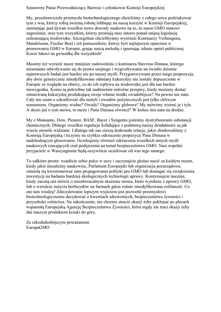 Szanowny Panie Przewodniczący Barroso i członkowie Komisji Europejskiej My, przedstawiciele przemysłu biotechnologicznego chcieliśmy z całego serca podziękować tym z was, którzy robią świetną robotę lobbując na naszą korzyść w Komisji Europejskiej, zamiatając pod dywan wszelkie nowe dowody naukowe na to, Ŝe nasze GMO stanowi zagroŜenie, oraz tym wszystkim, którzy promują nasz interes ponad unijną legislację ochraniającą środowisko. Szczególnie chcielibyśmy wyróŜnić Komisarzy Verheugena, Mandelsona, Fischer Boel i ich pomocników, którzy byli najlepszym oparciem w promowaniu GMO w Europie, grając naszą melodię i ignorując zdanie opinii publicznej. Kosze łakoci na gwiazdkę dla wszystkich! Musimy teŜ wyrazić nasze mniejsze zadowolenie z komisarza Stavrosa Dimasa, którego nieustanne odwoływanie się do prawa unijnego i wygrzebywanie na światło dzienne najnowszych badań jest bardzo nie po naszej myśli. Przygotowywana przez niego propozycja, aby dwie genetycznie zmodyfikowane odmiany kukurydzy nie zostały dopuszczone w Europie ze względu na obawy, co do ich wpływu na środowisko jest dla nas bardzo niewygodna. Komu są potrzebne tak nadmiernie ostroŜne przepisy, kiedy moŜemy dostać zmutowaną kukurydzę produkującą swoje własne środki owadobójcze? Na pewno nie nam. Cały ten szum o szkodliwość dla motyli i owadów poŜytecznych jest tylko ckliwym nonsensem. Organizmy wodne? Owady? Organizmy glebowe? My mówimy wytruć je i tyle. A skoro juŜ o tym mowa, to moŜe i Pana Dimasa równieŜ? W końcu stoi nam na drodze. My z Monsanto, Dow, Pioneer, BASF, Bayer i Syngenta jesteśmy dystrybutorami substancji chemicznych. Dlatego wszelkie regulacje kolidujące z podstawą naszej działalności są jak wiecie niemile widziane. I dlatego tak nas cieszą doskonałe relacje, jakie zbudowaliśmy z Komisją Europejską i liczymy na szybkie odrzucenie propozycji Pana Dimasa w nadchodzącym głosowaniu. Oczekujemy równieŜ odrzucenia wszelkich innych myśli naukowych rzucających cień podejrzenia na temat bezpieczeństwa GMO. Nasi wspólni przyjaciele w Waszyngtonie będą oczywiście oczekiwać od was tego samego. To całkiem proste: wsadźcie sobie palce w uszy i zaczynajcie głośno nucić za kaŜdym razem, kiedy jakiś niezaleŜny naukowiec, Parlament Europejski lub organizacja pozarządowa, ośmielą się kwestionować sens propagowania polityki pro GMO lub domagać się zwiększenia inwestycji na badania bardziej ekologicznych technologii uprawy. Kontynuujcie nucenie, kiedy zaczną oni mówić o nieodwracalnym skaŜeniu terenu, które wyniknie z uprawy GMO, lub o wzroście zuŜycia herbicydów na farmach gdzie rośnie zmodyfikowana roślinność. Co oni tam wiedzą? Zdecydowanie lepszym wyjściem jest pozwolić przemysłowi biotechnologicznemu decydować o kwestiach zdrowotnych, bezpieczeństwa Ŝywności i przyszłości rolnictwa. Na zakończenie, nie chcemy stracić okazji Ŝeby poklepać po plecach wspaniałą Europejską Agencję Bezpieczeństwa śywności, która nigdy nie traci okazji Ŝeby dać naszym produktom kciuki do góry. Ze szkodnikobójczym powaŜaniem EuropaGMO