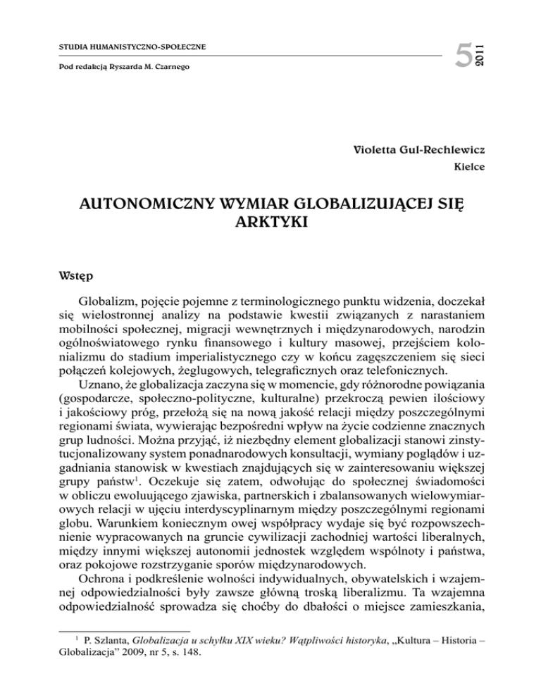 Pod redakcją Ryszarda M. Czarnego 5 2011 Studia Humanistyczno-Społeczne Violetta Gul-Rechlewicz Kielce Autonomiczny wymiar globalizującej się Arktyki Wstęp Globalizm, pojęcie pojemne z terminologicznego punktu widzenia, doczekał się wielostronnej analizy na podstawie kwestii związanych z narastaniem mobilności społecznej, migracji wewnętrznych i międzynarodowych, narodzin ogólnoświatowego rynku finansowego i kultury masowej, przejściem kolonializmu do stadium imperialistycznego czy w końcu zagęszczeniem się sieci połączeń kolejowych, żeglugowych, telegraficznych oraz telefonicznych. Uznano, że globalizacja zaczyna się w momencie, gdy różnorodne powiązania (gospodarcze, społeczno-polityczne, kulturalne) przekroczą pewien ilościowy i jakościowy próg, przełożą się na nową jakość relacji między poszczególnymi regionami świata, wywierając bezpośredni wpływ na życie codzienne znacznych grup ludności. Można przyjąć, iż niezbędny element globalizacji stanowi zinstytucjonalizowany system ponadnarodowych konsultacji, wymiany poglądów i uzgadniania stanowisk w kwestiach znajdujących się w zainteresowaniu większej grupy państw1. Oczekuje się zatem, odwołując do społecznej świadomości w obliczu ewoluującego zjawiska, partnerskich i zbalansowanych wielowymiarowych relacji w ujęciu interdyscyplinarnym między poszczególnymi regionami globu. Warunkiem koniecznym owej współpracy wydaje się być rozpowszechnienie wypracowanych na gruncie cywilizacji zachodniej wartości liberalnych, między innymi większej autonomii jednostek względem wspólnoty i państwa, oraz pokojowe rozstrzyganie sporów międzynarodowych. Ochrona i podkreślenie wolności indywidualnych, obywatelskich i wzajemnej odpowiedzialności były zawsze główną troską liberalizmu. Ta wzajemna odpowiedzialność sprowadza się choćby do dbałości o miejsce zamieszkania, 1 P. Szlanta, Globalizacja u schyłku XIX wieku? Wątpliwości historyka, „Kultura – Historia – Globalizacja” 2009, nr 5, s. 148. 86 Violetta Gul-Rechlewicz wzmożonej troski o ekologiczne formy życia, kultywowanie tradycji swoich przodków i przyszłość następnych generacji. Obejmuje również odpowiedzialność za zagrożonych ludzi i wszystkie pozostałe gatunki na kuli ziemskiej. Spustoszenia w przyrodzie dokonane w XIX w. zmotywowały społeczność międzynarodową do zwrócenia większej uwagi na środowisko i jego zasoby naturalne oraz ich ochronę. Równolegle doceniono wartość ludności autochtonicznej jako ważnego warunku bytu oraz źródła cennej wiedzy z zakresu funkcjonowania przyrody2. Wzajemny związek autonomii i globalizacji – kontekst arktyczny Złożone konsekwencje II wojny światowej sprawiły, że dotychczasowy obraz świata uległ radykalnej zmianie. Imperialny porządek musiał ustąpić, co w konsekwencji spowodowało widoczne zmiany w zakresie stref wpływów poszczególnych kolonialnych mocarstw. Prawdziwa eksplozja dążeń niepodległościowych objęła kontynent Afryki, Azji, Ameryki Południowej oraz inne rejony kuli ziemskiej3. Kształtujący się nowy porządek narodowościowy i państwowy świata wyrażał się, jak się wówczas wydawało, na jednoznacznym dążeniu poszczególnych narodów i grup etnicznych do harmonijnego współistnienia w obrębie nowo powstających jednostek polityczno-terytorialnych. Teorie: asymilacyjna i integracyjna, oparte były na dominującej wówczas refleksyjnej filozofii zwanej „teorią powstawania narodów”4, wizji wskazującej na uniwersalność w dążeniu do samostanowienia grup narodowościowych w różnych częściach świata. Problem jednak okazał się zdecydowanie bardziej złożony, co wykazano w latach siedemdziesiątych XX w. wskazując na brak koincydencji w zakresie kwestii etnicznych i politycznych w poszczególnych analizowanych krajach5. Przyjmując retorykę o zabarwieniu antropologicznym, przyjmijmy, że formowanie się narodu przebiega na trzech wspólnych poziomach: „międzynaro J. Tully, Aboriginal Peoples: Negotiating Reconciliation, w: Canadian Politics, red. J. Bickerton, A. G. Peterborough, 1999, s. 430–436. 3 Więcej w: Konflikty kolonialne i postkolonialne w Afryce i Azji 1869–2006, red. P. Ostaszewski, Warszawa 2006; A. Kosidło, Dekolonizacja Afryki: kryzys formalnego Imperium Wielkiej Brytanii 1939–1951, Gdańsk 1997; J. Kiwerska, Rozpad imperium brytyjskiego w Afryce, Warszawa 1989; R. F. Betts, Decolonization, London 2004; The Dekolonization Leader, red. J. D. Le Sueura, London 2003 i in. 4 „Nation-building theory” wskazywała na wzajemny związek między procesami modernizacyjnymi, tj. rozwojem ekonomicznym oraz technologicznym, a społeczną asymilacją różnorodnych grup narodowościowych. W konsekwencji miało to doprowadzić do zanikania tzw. czynnika dezintegracyjnego stanowiącego wyznacznik tożsamości i odmienności, jak język i kultura, na korzyść wspólnej płaszczyzny materialnej determinującej egzystencję danego kraju. Więcej w: W. J. Burszta, Antropologia kultury, Poznań 1998, s. 142; za: K. Deutsch, Nationalism and Social Communication: An Inquiry into the Foundations of Nationality, Cambridge, Mass 1966; Nationalism and its Alternatives, red. A. A. Knopf, New York 1969. 5 Więcej w: W. J. Burszta, Antropologia. 2 Autonomiczny wymiar globalizującej się Arktyki 87 dowej gramatyki kulturowej” – poczucia przynależności narodowej, tj. języka, symboli, flagi czy historii narodowej, „leksykonu narodowego”, tj. wykładników „gramatyki” poziomu pierwszego przejawiających się na gruncie lokalnym oraz „słownictwa dialektu”, tj. praktyk kulturowych stosowanych przez różne grupy etniczne w ramach jednego narodu6. Kulturowy kontekst, przynależność do „narodu” wzmacnia więzi obywatelskie, tworzy nową formę integracji społecznej, jak również odpowiada polityczną mobilizacją swoich obywateli. Suwerenność narodu, praw