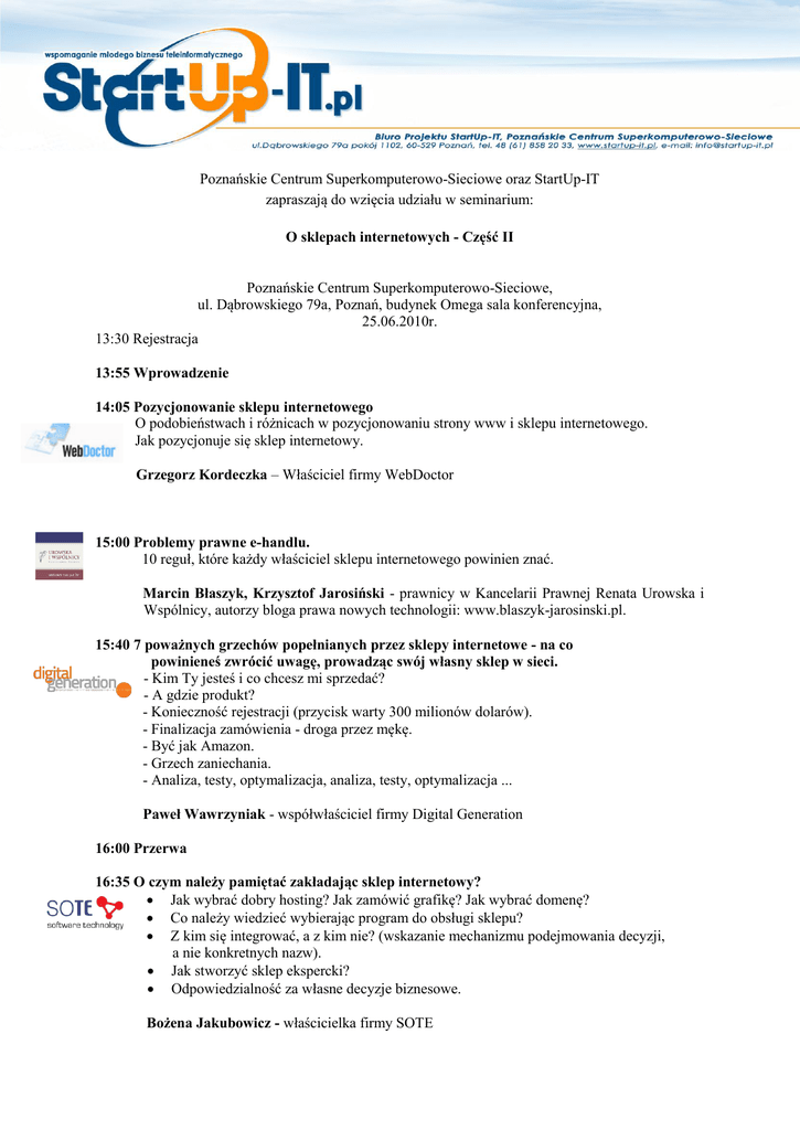 P Poznańskie Centrum Superkomputerowo-Sieciowe oraz StartUp-IT zapraszają do wzięcia udziału w seminarium: O sklepach internetowych - Część II Poznańskie Centrum Superkomputerowo-Sieciowe, ul. Dąbrowskiego 79a, Poznań, budynek Omega sala konferencyjna, 25.06.2010r. 13:30 Rejestracja 13:55 Wprowadzenie 14:05 Pozycjonowanie sklepu internetowego O podobieństwach i różnicach w pozycjonowaniu strony www i sklepu internetowego. Jak pozycjonuje się sklep internetowy. Grzegorz Kordeczka – Właściciel firmy WebDoctor 15:00 Problemy prawne e-handlu. 10 reguł, które każdy właściciel sklepu internetowego powinien znać. Marcin Błaszyk, Krzysztof Jarosiński - prawnicy w Kancelarii Prawnej Renata Urowska i Wspólnicy, autorzy bloga prawa nowych technologii: www.blaszyk-jarosinski.pl. 15:40 7 poważnych grzechów popełnianych przez sklepy internetowe - na co powinieneś zwrócić uwagę, prowadząc swój własny sklep w sieci. - Kim Ty jesteś i co chcesz mi sprzedać? - A gdzie produkt? - Konieczność rejestracji (przycisk warty 300 milionów dolarów). - Finalizacja zamówienia - droga przez mękę. - Być jak Amazon. - Grzech zaniechania. - Analiza, testy, optymalizacja, analiza, testy, optymalizacja ... Paweł Wawrzyniak - współwłaściciel firmy Digital Generation 16:00 Przerwa 16:35 O czym należy pamiętać zakładając sklep internetowy? Jak wybrać dobry hosting? Jak zamówić grafikę? Jak wybrać domenę? Co należy wiedzieć wybierając program do obsługi sklepu? Z kim się integrować, a z kim nie? (wskazanie mechanizmu podejmowania decyzji, a nie konkretnych nazw). Jak stworzyć sklep ekspercki? Odpowiedzialność za własne decyzje biznesowe. Bożena Jakubowicz - właścicielka firmy SOTE 17:35 Wielki Brat patrzy Podpatrywanie zachowania klienta w sklepie internetowym jest równie ważne jak w przypadku sklepów tradycyjnych - w końcu to kupujący decydują o sukcesie (lub porażce) w handlu. W sklepie online co prawda nie możemy bezpośrednio porozmawiać z naszym Klientem, ale możemy go obserwować: jak się porusza po stronie, w co klika, dlaczego nie kupuje albo dlaczego rezygnuje na etapie potwierdzenia zamówienia. Wiedza na ten temat pozwolą na lepszą obsługę klienta wirtualnego i krótszą drogę do jego portfela :). Szymon Wesołowski - Dyrektor operacyjny eFresh Manager 18:35 Bezpieczne płatności elektroniczne Jak przyjmować pieniądze od klientów - czym jest agregator płatności Jak działa i ile kosztuje wdrożenie takiego systemu Preferowane przez klientów formy e-płatności Bezpieczeństwo transakcji internetowych Michał Bzowy – Wiceprezes Zarządu DialCom24 19:05 Zakończenie spotkania W czasie seminarium zachęcamy do zadawania pytań i dyskusji z prelegentami. Udział w seminarium jest bezpłatny. Wymagana jest wcześniejsza rejestracja poprzez stronę www.StartUp-IT.pl. Liczba miejsc jest ograniczona, o udziale decyduje kolejność zgłoszeń. Organizatorzy zastrzegają prawo do dokonania zmian w programie bez powiadomienia oraz podania przyczyny. Zawsze aktualny program znajduje się na stronie www.StartUp-IT.pl Organizator - Poznańskie Centrum Superkomputerowo-Sieciowe