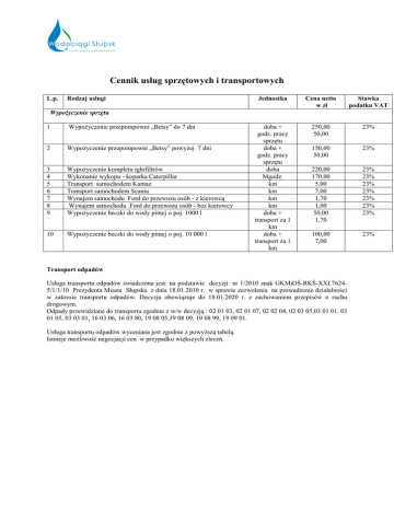Cennik usług sprzętowych sprz i transportowych L.p. Rodzaj usługi Jednostka Cena netto w zł Stawka podatku VAT doba + godz. pracy sprzętu doba + godz. pracy sprzętu doba Mgodz. km km km km doba + transport za 1 km doba + transport za 1 km 250,00 50,00 23% 150,00 50,00 23% 220,00 170,00 5,00 7,00 1,70 1,00 50,00 1,70 23% 23% 23% 23% 23% 23% 23% 100,00 7,00 23% Wypożyczenie sprzętu 1 Wypożyczenie yczenie przepompowni „Betsy” do 7 dni 2 Wypożyczenie przepompowni „Betsy” powyżej powy 7 dni 3 4 5 6 7 8 9 Wypożyczenie yczenie kompletu igłofiltrów Wykonanie wykopu - koparka Caterpillar Transport samochodem Kamaz Transport samochodem Scania Wynajem samochodu Ford do przewozu osób - z kierowcą Wynajem samochodu Ford do przewozu osób - bez kierowcy Wypożyczenie yczenie beczki do wody pitnej o poj. 1000 l 10 Wypożyczenie yczenie beczki do wody pitnej o poj. 10 000 l Transport odpadów Usługa transportu odpadów świadczona wiadczona jest na podstawie decyzji nr 1/2010 znak GKMiO GKMiOŚ-RKŚ-XXI.76245/1/1/10 Prezydenta Miasta Słupska z dnia 18.01.2010 r. w sprawie zezwolenia na prowadzenie działalności działalno w zakresie transportu odpadów. Decyzja obowiązuje obowi zuje do 18.01.2020 r. z zachowaniem przepisów o ruchu drogowym. Odpady przewidziane do transportu zgodnie z w/w decyzją decyzj : 02 01 03, 02 01 07, 02 02 04, 02 03 05,03 01 01, 03 01 05, 03 03 01, 16 03 06, 16 03 80, 19 08 05,19 08 09, 19 08 99, 19 09 01. Usługa transportu odpadów wyceniana jest zgodnie z powyższą powy tabelą. Istnieje możliwość negocjacji cen w przypadku wi większych zleceń.