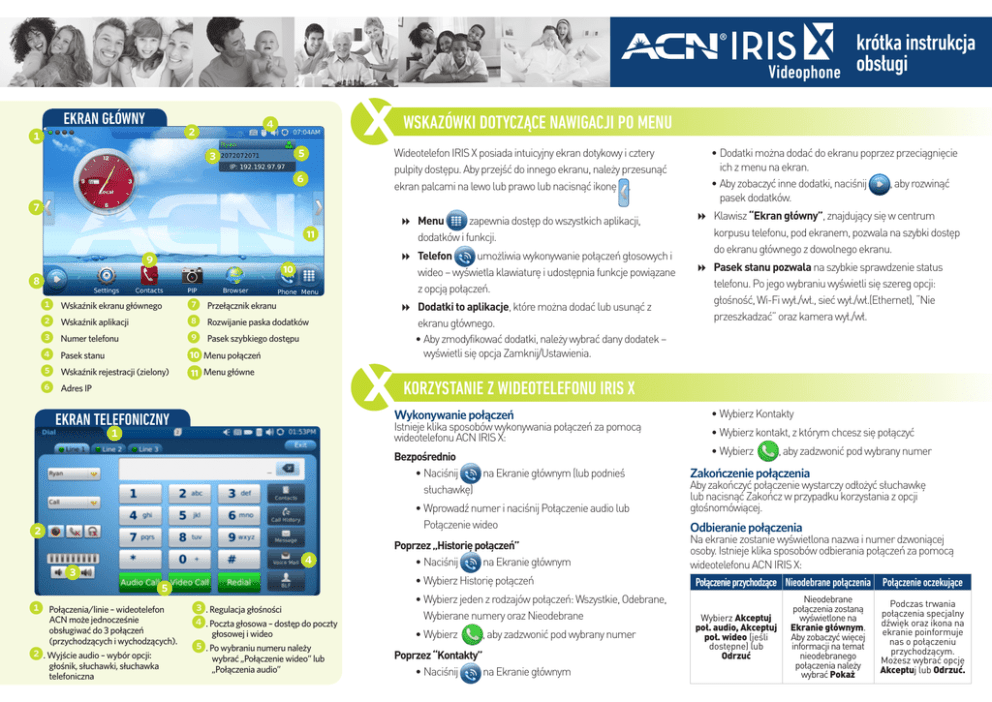 krótka instrukcja Videophone obsługi EKRAN GŁÓWNY WSKAZÓWKI DOTYCZĄCE NAWIGACJI PO MENU Wideotelefon IRIS X posiada intuicyjny ekran dotykowy i cztery pulpity dostępu. Aby przejść do innego ekranu, należy przesunąć ekran palcami na lewo lub prawo lub nacisnąć ikonę 11 10 1 2 3 4 5 6 Numer telefonu 7 8 9 Pasek stanu 10 Menu połączeń Wskaźnik rejestracji (zielony) 11 Menu główne Wskaźnik ekranu głównego Wskaźnik aplikacji Przełącznik ekranu Rozwijanie paska dodatków Pasek szybkiego dostępu Adres IP . �Menu zapewnia dostęp do wszystkich aplikacji, dodatków i funkcji. �Telefon umożliwia wykonywanie połączeń głosowych i wideo – wyświetla klawiaturę i udostępnia funkcje powiązane z opcją połączeń. � Dodatki to aplikacje, które można dodać lub usunąć z ekranu głównego. •Aby zmodyfikować dodatki, należy wybrać dany dodatek – wyświetli się opcja Zamknij/Ustawienia. Istnieje klika sposobów wykonywania połączeń za pomocą wideotelefonu ACN IRIS X: Bezpośrednio •Naciśnij na Ekranie głównym (lub podnieś słuchawkę) •Wprowadź numer i naciśnij Połączenie audio lub Połączenie wideo Poprzez „Historię połączeń” •Naciśnij na Ekranie głównym •Wybierz Historię połączeń 1 Połączenia/linie – wideotelefon ACN może jednocześnie obsługiwać do 3 połączeń (przychodzących i wychodzących). 2. Wyjście audio – wybór opcji: głośnik, słuchawki, słuchawka telefoniczna 3. Regulacja głośności 4. Poczta głosowa – dostęp do poczty głosowej i wideo 5. Po wybraniu numeru należy wybrać „Połączenie wideo” lub „Połączenia audio” � Klawisz “Ekran główny”, znajdujący się w centrum korpusu telefonu, pod ekranem, pozwala na szybki dostęp do ekranu głównego z dowolnego ekranu. � Pasek stanu pozwala na szybkie sprawdzenie status telefonu. Po jego wybraniu wyświetli się szereg opcji: głośność, Wi-Fi wył./wł., sieć wył./wł.(Ethernet), “Nie przeszkadzać” oraz kamera wył./wł. KORZYSTANIE Z WIDEOTELEFONU IRIS X Wykonywanie połączeń EKRAN TELEFONICZNY •Dodatki można dodać do ekranu poprzez przeciągnięcie ich z menu na ekran. •Aby zobaczyć inne dodatki, naciśnij , aby rozwinąć pasek dodatków. •Wybierz jeden z rodzajów połączeń: Wszystkie, Odebrane, Wybierane numery oraz Nieodebrane •Wybierz , aby zadzwonić pod wybrany numer Poprzez “Kontakty” •Naciśnij na Ekranie głównym •Wybierz Kontakty •Wybierz kontakt, z którym chcesz się połączyć •Wybierz , aby zadzwonić pod wybrany numer Zakończenie połączenia Aby zakończyć połączenie wystarczy odłożyć słuchawkę lub nacisnąć Zakończ w przypadku korzystania z opcji głośnomówiącej. Odbieranie połączenia Na ekranie zostanie wyświetlona nazwa i numer dzwoniącej osoby. Istnieje klika sposobów odbierania połączeń za pomocą wideotelefonu ACN IRIS X: Połączenie przychodzące Nieodebrane połączenia Połączenie oczekujące Wybierz Akceptuj poł. audio, Akceptuj poł. wideo (jeśli dostępne) lub Odrzuć Nieodebrane połączenia zostaną wyświetlone na Ekranie głównym. Aby zobaczyć więcej informacji na temat nieodebranego połączenia należy wybrać Pokaż Podczas trwania połączenia specjalny dźwięk oraz ikona na ekranie poinformuje nas o połączeniu przychodzącym. Możesz wybrać opcję Akceptuj lub Odrzuć. krótka instrukcja obsługi Videophone FUNKCJE DOSTĘPNE PODCZAS TRWANIA POŁĄCZENIA Podczas trwania połączenia dostępnych jest kilka funkcji. Aby wyświetlić dostępne funkcje, naciśnij Prosimy pamiętać, że podczas połączenia wideo men może nie być widoczne na ekranie W takim przypadku należy dotknąć ekranu w dowolnym miejscu, aby wyświetlić menu. Wyświetli się menu z trzema opcjami do wyboru: Option Menu POCZTA GŁOSOWA/WIDEO Poczta głosowa/wideo pozwala dzwoniącym na zostawienie wiadomości, w przypadku, gdy nie możemy odebrać telefonu. Ustawianie/odgrywanie wiadomości Przy pierwszym korzystaniu z poczty należy zmienić hasło (początkowo hasło to 1234#). Aby zmienić hasło i/lub nagrać wiadomość, należy postępować zgodnie z usłyszanymi wskazówkami. 1.Naciśnij [image] na Ekranie głównym. 2.Naciśnij symbol koperty Poczta głosowa, aby uzyskać dostęp do poczty głosowej i wideo. 3.Aby usłyszeć/obejrzeć nagrane wiadomości, należy postępować zgodnie z podanymi wskazówkami. Function Description Klawiatura Wybierz, aby wprowadzić odpowiednie cyfry Rozmowa zawieszona Wybierz, aby zawiesić prowadzone połączenie. Aby powrócić do połączenia, wybierz „Odwieś połączenie” Jeżeli klawisz “Ekran główny” miga niebieskim świtałem, oznacza to, że mamy nową wiadomość (także po podniesieniu słuchawki będzie słyszalny przerywany dźwięk). Aby odsłuchać/obejrzeć wiadomość, należy aktywować klawiaturę i nacisnąć ikonę Poczta głosowa. Wyłącz dźwięk/włącz dźwięk Naciśnij, aby włączyć lub wyłączyć dźwięk Wskazówki na temat Poczty głosowej Wideo wył./wł. Naciśnij, aby włączyć/wyłączyć przekaz obrazu. Połączenie konferencyjne Po połączeniu się z jedną osobą, użyj tej opcji, aby połączyć się z dodatkową osobą i poprowadzić konferencje trójstronną. Głośnik/Słuchawki/ Słuchawka tel. Wybierz pożądane wyjście dla dźwięku. Głośność Regulacja głośności. PIP Naciśnij, aby zmienić wyświetlany obraz Zdjęcie Naciśnij, aby zrobić zdjęcie tego, co na ekranie. Zrobione zdjęcie zostanie automatycznie zapisane w folderze „Screenshot” w sekcji Narzędzia > Zarządzanie plikami Potrzebna pomoc? Opis dodatkowych funkcji, dokładna instrukcja użytkowania oraz wskazówki, jak rozwiązywać ewentualne problemy można znaleźć w „Instrukcji obsługi” znajdującej się na stronie Sklep Internetowy ACN lub www.myacn.eu. Poczta głosowa (wskaźnik poczty głosowej) Aby zmienić liczbę sygnałów, po których nastąpi p