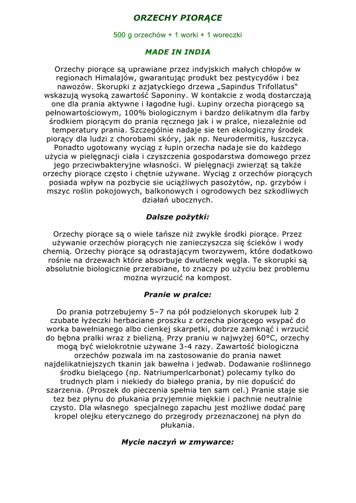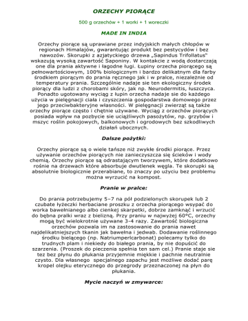 ORZECHY PIORĄCE 500 g orzechów + 1 worki + 1 woreczki MADE IN INDIA Orzechy piorące są uprawiane przez indyjskich małych chłopów w regionach Himalajów, gwarantując produkt bez pestycydów i bez nawozów. Skorupki z azjatyckiego drzewa „Sapindus Trifollatus“ wskazują wysoką zawartość Saponiny. W kontakcie z wodą dostarczają one dla prania aktywne i łagodne ługi. Łupiny orzecha piorącego są pełnowartościowym, 100% biologicznym i bardzo delikatnym dla farby środkiem piorącym do prania ręcznego jak i w pralce, niezależnie od temperatury prania. Szczególnie nadaje sie ten ekologiczny środek piorący dla ludzi z chorobami skóry, jak np. Neurodermitis, łuszczyca. Ponadto ugotowany wyciąg z łupin orzecha nadaje sie do każdego użycia w pielęgnacji ciała i czyszczenia gospodarstwa domowego przez jego przeciwbakteryjne własności. W pielęgnacji zwierząt są także orzechy piorące często i chętnie używane. Wyciąg z orzechów piorących posiada wpływ na pozbycie sie uciążliwych pasożytów, np. grzybów i mszyc roślin pokojowych, balkonowych i ogrodowych bez szkodliwych działań ubocznych. Dalsze pożytki: Orzechy piorące są o wiele tańsze niż zwykłe środki piorące. Przez używanie orzechów piorących nie zanieczyszcza się ścieków i wody chemią. Orzechy piorące są odrastającym tworzywem, które dodatkowo rośnie na drzewach które absorbuje dwutlenek węgla. Te skorupki są absolutnie biologicznie przerabiane, to znaczy po użyciu bez problemu można wyrzucić na kompost. Pranie w pralce: Do prania potrzebujemy 5–7 na pół podzielonych skorupek lub 2 czubate łyżeczki herbaciane proszku z orzecha piorącego wsypać do worka bawełnianego albo cienkej skarpetki, dobrze zamknąć i wrzucić do bębna pralki wraz z bielizną. Przy praniu w najwyżej 60°C, orzechy mogą być wielokrotnie używane 3-4 razy. Zawartość biologiczna orzechów pozwala im na zastosowanie do prania nawet najdelikatniejszych tkanin jak bawełna i jedwab. Dodawanie roślinnego środku bielącego (np. Natriumperlcarbonat) polecamy tylko do trudnych plam i niekiedy do białego prania, by nie dopuścić do szarzenia. (Proszek do pieczenia spełnia ten sam cel.) Pranie staje sie tez bez płynu do płukania przyjemnie miękkie i pachnie neutralnie czysto. Dla własnego specjalnego zapachu jest możliwe dodać parę kropel olejku eterycznego do przegrody przeznaczonej na płyn do płukania. Mycie naczyń w zmywarce: 5 orzechów piorących dodać do przegródki na sztućce, w normalnym programie myć. Płyn do płukania jest zazwyczaj niepotrzebny. Jako środek do czyszczenia w gospodarstwie domowym, do mycia włosów, do pielęgnowania zwierząt i do zwalczania szkodników. Żeby przygotować wyciąg gotujemy 8–10 skorupek albo 12– 15g proszku 5 do 10 minut w ¾ litrze wody. (Stężenie może być zmienione w zależności od potrzeby). Ten ług trzeba przelać przez chustkę bawełnianą do butelki ze spryskiwaczem: gotowy jest płynny środek czyszczący. W razie potrzeby ewentualnie dodać kilka kropli oleju cytrynowego. Ten uniwersalny środek czyszczący nadaje sie na wszystkie prace w gospodarstwie domowym, w kuchni, łazience i toalecie, do mycia okien i auta. Szampon (dla każdego rodzaju włosów): Ten wyciąg może być tez używany do mycia włosów. Przez szampon z orzechów piorących jest możliwe pozbycie się łupieżu na zawsze (też Psoriasis) i daje włosom jedwabny połysk i witalność. Po umyciu dają się włosy łatwo uczesać i nie przetłuszczają się tak szybko. Wysoko skoncentrowany wyciąg z orzechów piorących jest pielęgnującym płynnym mydłem do mycia ciała, który cenią i faworyzują osoby, które chorują na Neurodermitis albo z powodu innych alergii nie mogą używać środków konwencjonalnych produktów czyszczących-chemicznych. Żeby osiągnąć mocną konsystencję wyciągu można dodać mąkę Quarg. Wyciąg z orzechów piorących jest bardzo skutecznym i tanim środkiem czyszczącym dla zwierząt domowych. (Hindusi myją tym swoje kosztowne słonie.) Parę wskazówek do przedłużenia trwałości: na 500 ml wyciągu dodać około 25 kropli eterycznego olejku z drzewa herbacianego. Ten olej odkaża, jest bakteriobójczy i daje wyciągowi świeży zapach. Szkodników roślin można sie pozbyć, spryskując rośliny wyciągiem z orzecha piorącego. Tym właśnie sposobem możemy zniszczyć wszystkie pasożyty jak np. mszyce i inne na różach i innych kwiatach oraz w ogródku warzywnym. Saponina zawarta w skorupach orzechów jest właśnie w tym przypadku maksymalnie wykorzystana. W ten właśnie sposób nie jesteśmy zmuszeni używać chemicznych pestycydów w ochronie roślin. Rośliny które tak są chronione przed szkodnikami, nie są obciążane chemią. Skorupką z orzecha piorącego można czyścić biżuterie srebrną i złotą. Do czyszczenia potrzeba 2 – 3 skorupki namoczyć w 100 – 150 ml gorącej wody. Następnie należy namoczone skorupki pocierać w ręce do powstaną lekkiej piany. Nakładając pianę na biżuterie i pocierając ściereczką z mikrofazy, czyścimy biżuterie. Czyszczenie biżuterii można także wzmocnić używając szczoteczki do zębów namoczonej w roztworze. Po czyszczeniu należy biżuterie opłukać. Tradycjonalne użycie: Hinduskie kobiety używają skorupki orzecha piorącego do czyszczenia i pielęgnowania włosów. Bardzo dobry środek do pielegnacji jest połączenie orzecha – proszku z ziołami ayurverdy, spełnia to wtedy role mydła do całego ciała. Do dzisiaj są sztućce i przedmioty domowe myte ługiem mydlanym z orzechów piorących. Dodatkowo każdy złotnik używa to mydło do polerowania swojej biżuterii. Orzechy piorące w nowoczesności: Bez problemu można używać orzechy piorące w pralce. Worek z materiału uniemożliwia skorupce z orzecha piorącego zaplątania się w pralce. W porównaniu z innymi środkami czyszczącymi, nie zawierają orzechy p