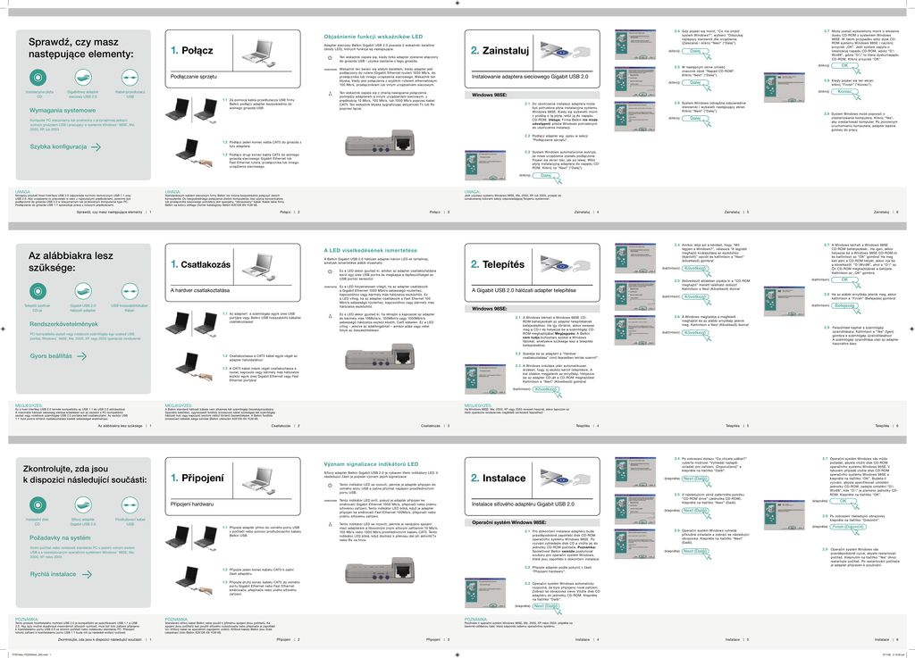 2.4 Gdy pojawi się monit, “Co ma zrobić Objaśnienie funkcji wskaźników LED Sprawdź, czy masz następujące elementy: Adapter sieciowy Belkin Gigabit USB 2.0 posiada 3 wskaźniki świetlne (diody LED), których funkcje są następujące: 1. Połącz ���������� Podłączanie sprzętu Instalacyjna płyta CD Gigabitowy adapter sieciowy USB 2.0 Kabel-przedłużacz USB 2. Zainstaluj Ten wskaźnik zapala się, kiedy tylko adapter zostanie włączony ���������� do gniazda USB i uzyska zasilanie z tego gniazda. 1.1 Za pomocą kabla-przedłużacza USB firmy Belkin podłącz adapter bezpośrednio do wolnego gniazda USB. Wymagania systemowe (kliknij) dysku CD-ROM z systemem Windows 98SE. W takim przypadku włóż dysk CDROM systemu Windows 98SE i naciśnij przycisk „OK”. Jeśli system zapyta o lokalizację napędu CD-ROM, wpisz “D:\ Win98”, gdzie “D:\” to litera dysku/napędu CD-ROM. Kliknij przycisk “OK”. Dalej (kliknij) 2.5 W następnym oknie umieść Wskaźnik ten świeci się stałym światłem, kiedy adapter jest podłączony do rutera (Gigabit Ethernet router) 1000 Mb/s, do przełącznika lub innego urządzenia sieciowego. Wskaźnik ten błyska, kiedy jest połączenie z szybkim ruterem ethernetowym 100 Mb/s, przełącznikiem lub innym urządzeniem sieciowym. znacznik obok “Napęd CD-ROM”. Kliknij “Next” (“Dalej”). Instalowanie adaptera sieciowego Gigabit USB 2.0 (kliknij) Ten wskaźnik zapala się z chwilą nawiązania połączenia pomiędzy adapterem a innym urządzeniem sieciowym, z prędkością 10 Mb/s, 100 Mb/s, lub 1000 Mb/s poprzez kabel CAT5. Ten wskaźnik błyska sygnalizując aktywność Tx lub Rx poprzez łącze. ���������� 2.7 Może zostać wyświetlony monit o włożenie system Windows?”, wybierz “Odszukaj najlepszy sterownik dla urządzenia. (Zalecane) i kliknij “Next” (“Dalej”). Gigabitowy adapter sieciowy USB 2.0 firmy Belkin Dalej 2.8 Kiedy pojawi się ten ekran, kliknij “Finish” (“Koniec”). (kliknij) Windows 98SE: Koniec 2.6 System Windows odnajdzie odpowiednie 2.1 Do ukończenia instalacji adaptera może być potrzebna płyta instalacyjna systemu Windows 98SE. Kiedy się wyświetli monit z prośbą o tę płytę, włóż ją do napędu CD-ROM. Uwaga: Firma Belkin nie może udostępnić plików Windows potrzebnych do ukończenia instalacji. Komputer PC stacjonarny lub przenośny z przynajmniej jednym wolnym gniazdem USB i pracujący w systemie Windows® 98SE, Me, 2000, XP, lub 2003 OK sterowniki i wyświetli następujący ekran. Kliknij “Next” (“Dalej”). Gigabitowy adapter sieciowy USB 2.0 firmy Belkin D:\Drivers\Win98SE-ME\F5D5055 (kliknij) 2.9 System Windows może poprosić o Dalej zrestartowanie komputera. Kliknij “Yes”, aby zrestartować komputer. Po ponownym uruchomieniu komputera, adapter będzie gotowy do pracy. 2.2 Podłącz adapter wg. opisu w sekcji “Podłączanie sprzętu”. 1.2 Podłącz jeden koniec kabla CAT5 do gniazda z Szybka konfiguracja tyłu adaptera. 2.3 System Windows automatycznie wykryje, 1.3 Podłącz drugi koniec kabla CAT5 do wolnego że nowe urządzenie zostało podłączone. Pojawi się ekran taki, jak po lewej. Włóż płytę instalacyjną adaptera do napędu CDROM. Kliknij na “Next” (“Dalej”). gniazda sieciowego Gigabit Ethernet lub Fast Ethernet rutera, przełącznika lub innego urządzenia sieciowego. (kliknij) UWAGA: UWAGA: Niniejszy produkt Host Interface USB 2.0 odpowiada normom technicznym USB 1.1 oraz USB 2.0. Aby urządzenie to pracowało w sieci z najwyższymi prędkościami, powinno być podłączone do gniazda USB 2.0 w stacjonarnym lub przenośnym komputerze typu PC. Podłączenie do gniazda USB 1.1 spowoduje pracę z niższymi prędkościami. Sprawdź, czy masz następujące elementy UWAGA: Standardowym kablem sieciowym firmy Belkin nie można bezpośrednio połączyć dwóch komputerów. Do bezpośredniego połączenia dwóch komputerów, bez użycia koncentratora lub przełącznika sieciowego potrzebny jest specjalny, “skrosowany” kabel. Kable takie firmy Belkin są koloru żółtego (numer katalogowy Belkin A3X126-XX-YLW-M). 1 Połącz Dalej Jeśli używasz systemu Windows 98SE, Me, 2000, XP, lub 2003, przejdź do oznakowanej kolorami sekcji odpowiadającej Twojemu systemowi. 2 Połącz 3 Zainstaluj 4 Zainstaluj 5 Zainstaluj 2.4 Amikor látja azt a kérdést, hogy “Mit Az alábbiakra lesz szüksége: A Belkin Gigabit USB 2.0 hálózati adapter három LED-et tartalmaz, amelyek ismertetése alább olvasható: 1. Csatlakozás akkor gyullad ki, amikor az adapter csatlakoztatásra kerül egy üres USB portra és megkapja a tápfeszültséget az USB porton keresztül. ���������� A hardver csatlakoztatása Telepítő szoftver CD-je Gigabit USB 2.0 hálózati adapter USB hosszabbítókábel Kábel 1.1 Az adaptert a számítógép egyik üres USB portjára vagy Belkin USB hosszabbító kábellel csatlakoztassa! Rendszerkövetelmények (kattintson) Ez a LED folyamatosan világít, ha az adapter csatlakozik a Gigabit Ethernet 1000 Mbit/s sebességű routerhez, kapcsolóhoz vagy bármely más hálózatos eszközhöz. Ez a LED villog, ha az adapter csatlakozik a Fast Ehernet 100 Mbit/s sebességű routerhez, kapcsolóhoz vagy bármely más hálózatos eszközhöz. (kattintson) Következő kattintson a “Finish” (Befejezés) gombra! meghajtót és az alábbi ernyőkép jelenik meg. Kattintson a Next (Következő) ikonra! Belkin Gigabit USB 2.0 hálózati adapter D:\Drivers\Win98SE-ME\F5D5055 (kattintson) újraindítására. Kattintson a “Yes” (Igen) gombra a számítógép újraindításához! A számítógép újraindítása után az adapter használtra kész Következő csatlakoztatása” című fejezetben leírtak szerint!”. 2.3 A Windows indulása után automatikusan érzékeli, hogy új eszköz került telepítésre. A bal oldalon megjelenik az ernyőkép. Helyezze