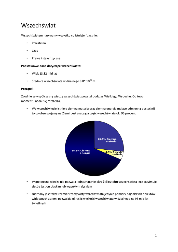 Wszechświat Wszechświatem nazywamy wszystko co istnieje fizycznie: • Przestrzeń • Czas • Prawa i stałe fizyczne Podstawowe dane dotyczące wszechświata: • Wiek 13,82 mld lat • Średnica wszechświata widzialnego 8.8* 1026 m Początek Zgodnie ze współczesną wiedzą wszechświat powstał podczas Wielkiego Wybuchu. Od tego momentu nadal się rozszerza. • We wszechświecie istnieje ciemna materia oraz ciemna energia mające odmienną postać niż to co obserwujemy na Ziemi. Jest znacząca część wszechświata ok. 95 procent. • Współczesna wiedza nie pozwala jednoznacznie określić kształtu wszechświata lecz przyjmuje się ,że jest on płaskim lub wypukłym dyskiem • Nieznany jest także rozmiar rzeczywisty wszechświata jedynie pomiary najdalszych obiektów widocznych z ziemi pozwalają określić wielkość wszechświata widzialnego na 93 mld lat świetlnych 1 1 Obserwacja kosmosu Podczas bezchmurnej nocy możemy oglądać setki a nawet tysiące gwiazd. W miastach gdzie światło latarni ulicznych rozprasza mrok niektóre ze słabszych gwiazd przestają byś widoczne do tego zanieczyszczenia powietrza które dodatkowo rozpraszają światło lamp rozjaśniając niebo co znacząco utrudnia obserwację nieba. Dlatego teleskopy badawcze instaluje się zdaja od terenów zamieszkałych powiększając tym samym liczbę obiektów do obserwacji. Jednym z czynników, które utrudniają obserwację jest atmosfera ziemska. Tylko w kilku przedziałach długości fal można prowadzić obserwacje wszechświata. Należą do nich min. Okno bliskiej podczerwieni ( 800-1300 nm), zakresu światła widzialnego (300-800 nm), oraz okno radiowe (1mm20m ). Oglądając niebo każdej nocy można mieć wrażenie, że gwiazdy zmieniają swoje położenie jednak jest to mylne założenie ponieważ gwiazdy poruszają sie tak wolno, że nie starczyłoby życia ludzkiego by wychwycić jakąś różnicę w realnym położeniu gwiazdy. Ludzie od wieków wpatrując się w niebo utożsamiali gwiazdy z bóstwami bądź herosami. Takie obrazy nazwano gwiazdozbiorami. Współcześnie tą nazwą określa się 88 części nieba, którym nadano nazwy od greckich liter alfabetu. 2 Słońce Gwiazda centralna Układu Słonecznego, wokół której krąży Ziemia, inne planety tego układu, planety karłowate oraz małe ciała Układu Słonecznego. Słońce składa się z gorącej plazmy utrzymywanej przez grawitację i kształtowanej przez pole magnetyczne. Jest prawie idealnie kuliste, ma średnicę około 1 392 684 km, około 109 razy większą niż Ziemia, a jego masa 1,989 ×1030 kg, około 333 tysięcy razy większa niż masa Ziemi. Słońce uformowało się około 4,567 mld lat temu na skutek kolapsu grawitacyjnego obszaru w dużym obłoku molekularnym. Większość materii zgromadziła się w centrum, a reszta utworzyła orbitujący wokół niego, spłaszczony dysk, z którego ukształtowała się pozostała część Układu Słonecznego. Własności gwiazd najlepiej można zobrazować na przykładzie Słońca. Jedną z nich jest ilość wysyłanej energii. Stała słoneczna to ilość energii docierającej w jednostce czasu do jednostkowej powierzchni znajdującj się od słońca w odległości 1 AU i ustawionej prostopadle do padającego promieniowania Oznaczamy ją S. Natomiast 1 AU to jednostka astronomiczna, czyli średnia odległość Ziemi od Słońca wynosząca 149,6 mln km. Wartość stałej wynosi 1,37 kW/m2. Powierzchnia sfery o promieniu 1AU s=2,8*1023m2 Moc promieniowana Słońca wynosi 3,8*1026W 2 Moc promieniowania przypadająca na 1m2 jest porównywana do mocy bojlera lub kuchenki gazowej. Tym samym potrzeby energetyczne gospodarstwa domowego zaspokoiłoby urządzenie przetwarzające energię słoneczną, które mogłoby mieć zaledwie kilka mertów kwadratowych. 3 Widmo promieniowania, Temperatura, Skład chemiczny Słońca. Mierząc moc promieniowania uwzględnia się całość energii emitowanej przez słońce jednak składa się ona z fal o różnej długości co sprawia, że energia jest różna dla tych fal. Zależność między długością fali a energią promieniowania nazywamy widmem promieniowania. Ciała doskonale czarne lub o wystarczającej gęstości wysyłają fale o wszystkich częstotliwościachwidmo ciągłe. Fale te są pochłaniane lub odbijane przez pierwiastki chemiczne (pochłaniana długość jest charakterystyczna dla każdego pierwiastka)-widma linowe. Widma liniowe pomagają określić skład chemiczny badanego obiektu oraz jego temperaturę. Słońce i gwiazdy zbudowane są ze świecącego gazu. Analizując jego światło można określić jego temperaturę oraz skład chemiczny. Temperatura słońca wynosi 6000K. W warstwie promieniującej, czyli fotosferze występują wszystkie pierwiastki chemiczne występujące na Ziemi oraz proste związki chemiczne takie jak CH OH NH CN, które mogą przetrwać w temperaturze 6000K. Większość masy słońca stanowi wodór. Hel zajmuje 25 procent, a reszta pierwiastków zaledwie 0.01 masy Słońca. 3 4 Masa słońca Masa słońca odpowiedzialna jest za ruch orbitalny ziemi oraz za długość promienia orbity. Ziemia obiega słońce po torze zbliżonym do okręgu więc siła grawitacji jest równa sile odśrodkowej. Czyli G*M*m/r2=mv2/rM=v2*r/G M- masa słońca m- masa Ziemi v-prędkość Ziemi na orbicie r- promień orbity Ziemi Prędkość ziemi obliczyć można ze wzoru V=2pi*r/t T= 365 dni 6 godz. Po podstawieniu wartości uzyskujemy wynik 2*1030kg 5 Pochodzenie energii słonecznej Energia słoneczna pochodzi z przemiany wodoru w hel. W reakcji czterech protonów zostaje uwolniona energia różnicy mas. Chociaż nie jest to dużo mnożąc to przez prędkość światła do kwadratu uzyskujemy wartość energii równej spaleniu 10 000 ton benzyny. E=mc2 E=5*10-3*(3*108)2=5*1014 Spalanie wodoru wystarcza do podtrzymywania świecenia większości gwiazd. 4 6 Czas życia słońca Reakcje termojądrowe co sekundę zm