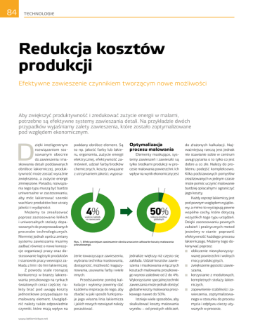 84 TECHNOLOGIE Redukcja kosztów produkcji Efektywne zawieszenie czynnikiem tworzącym nowe możliwości Aby zwiększyć produktywność i zredukować zużycie energii w malarni, potrzebne są efektywne systemy zawieszania detali. Na przykładzie dwóch przypadków wyjaśniamy zalety zawieszenia, które zostało zoptymalizowane pod względem ekonomicznym. D zięki inteligentnym rozwiązaniom stosowanym obecnie do zawieszenia i maskowania detali poddawanych obróbce lakierniczej, produktywność może zostać wyraźnie zwiększona, a zużycie energii zmniejszone. Ponadto, rozwiązania tego typu muszą być bardzo uniwersalne w zastosowaniu, aby móc lakierować szeroki wachlarz produktów bez utraty jakości i wydajności. Możemy to zrealizować poprzez zastosowanie lekkich i uniwersalnych stelaży dopasowanych do przeprowadzanych procesów technologicznych. Niemniej jednak oprócz zmiany systemu zawieszania musimy zadbać również o nowe koncepcje organizacji pracy oraz dostosowanie logistyki produktów i stanowisk pracy wewnątrz zakładu z linii i do linii lakierniczej. Z powodu stale rosnącej konkurencji w branży lakierowania proszkowego na rynkach światowych coraz częściej należy brać pod uwagę koszty jednostkowe przypadające na malowany element. Uwzględnić należy także odpowiednie czynniki, które mają wpływ na www.lakiernictwo.net poddany obróbce element. Są to np. jakość farby lub lakieru, ergonomia, zużycie energii elektrycznej, efektywność zamówień, udział farby/środków chemicznych, koszty związane z utrzymaniem jakości, wyposa- 4% większe nakłady na zawieszanie Optymalizacja procesu malowania Elementy maskujące, systemy zawieszeń i zawieszki są tylko środkami produkcji w procesie malowania powierzchni. Ich wpływ na wynik ekonomiczny jest 50% redukcja kosztów globalnych Rys. 1. Efektywniejsze zawieszenie obniża znacznie całkowite koszty malowania proszkowego. żenie towarzyszące zawieszeniu, wybrana technika maskowania, dostępność, możliwość magazynowania, usuwania farby i wiele innych. Przedstawione poniżej kalkulacje i wykresy powinny dać każdemu inspirację do tego, aby zbadać w jaki sposób funkcjonuje jego własna linia lakiernicza i jakich nowych rozwiązań należy poszukiwać. jednakże większy niż często się zakłada. Udział kosztów zawieszenia i maskowania w łącznych kosztach malowania proszkowego wynosi zaledwie od 2 do 4%. Wykorzystanie specjalnej techniki zawieszania może jednak obniżyć globalne koszty malowania proszkowego nawet do 50%. Istnieje wiele sposobów, aby skalkulować koszty malowania wyrobu – od prostych obliczeń, do złożonych kalkulacji. Najważniejszą rzeczą jest jednak nie stawianie sobie w centrum uwagi pytania o to tylko co jest dobre a co złe. Należy do problemu podejść kompleksowo. Kilka podstawowych pomysłów zrealizowanych w jednym czasie może pomóc uczynić malowanie bardziej opłacalnym i ograniczyć jego koszty. Każdy osprzęt lakierniczy jest pod pewnym względem wyjątkowy, a mimo to występują pewne wspólne cechy, które dotyczą wszystkich tego typu urządzeń. Dzięki zastosowaniu pewnych założeń i praktycznych metod jesteśmy w stanie poprawić efektywność każdego procesu lakierniczego. Możemy tego dokonywać poprzez: obliczenie niewykorzystywanej powierzchni i wolnych mocy produkcyjnych, zwiększenie gęstości zawieszania, korzystanie z modułowych, kompletnych stelaży lakierniczych, zapewnienie stabilności zawieszenia, zoptymalizowanego w stosunku do procesu mycia i odpływu cieczy używanych w procesie, 85 TECHNOLOGIE WYTYCZNE DOTYCZĄCE ZAWIESZEK STANDARDOWYCH Rodzaj zawieszenia Haki Ilość przenośników 1 Prędkość przenośnika w m/min. (rzeczywista) 2 Wielkość obrabianej części (szer. x wys.) 25x80 Ilość obrabianych części na 1m przenośnika 28 Partia 88 000 Wydajność ilość/godz. 3000 Czas na partię godz. 29 Ilość zmian 3 Wydajność 80% Godziny pracy urządzeń rocznie 5250 Ilość pracowników na zmianie 5 Parametry kosztowe Koszty stałe Energia Koszty zmienne Pracownicy Farba proszkowa Koszt punktu zawieszenia Koszt całkowity 0,074 €/szt. Koszty obliczone w € 36 €/godz. 56 kWh 10 €/godz. 97 €/godz. 0,002 €/szt. 0,005 €/szt. 1056 1643 293 2845 200 440 6477 16% 25% 5% 44% 3% 7% 100% WYTYCZNE DOTYCZĄCE MODUŁÓW BHL Rodzaj zawieszenia Stelaże lakiernicze + BHL Ilość przenośników 1 Prędkość przenośnika w m/min. (rzeczywista) 2 Wielkość obrabianej części (szer. x wys.) 25x80 Ilość obrabianych części na 1m przenośnika 370 Oddzielne kurtyna J Partia 88 000 Wydajność ilość/godz. 35 000 Czas na partię godz. 20 Ilość zmian 3 Wydajność 80% Godziny pracy rocznie 5250 Ilość pracowników na zmianie 5 Parametry kosztowe Koszty stałe Energia Koszty zmienne Pracownicy Farba proszkowa Koszt punktu zawieszenia Oszczędność Koszt całkowity 0,048 €/szt. Koszty obliczone w € 36 €/godz. 56 kWh 10 €/godz. 97 €/godz. 0,004 €/szt. 0,011 €/szt. 731 141 25 1968 352 968 4184 Parametry kosztowe 11% 2% 0,4% 30% 5% 15% 35% 100% Tabela 1. Zestawienie porównawcze pojedynczych zawieszek i modułów systemu BHL. unikanie problemów powstających w lakierniach na wąskich zakrętach i wzniesieniach, ograniczenie prędkości transportowania, dobre planowanie przepływu materiału w celu uzyskania płynności produkcji, wstępne zawieszanie drobnych detali poza linią, zbadanie możliwości równoczesnego zawieszania i maskowania w jednym punkcie. Dzięki praktycznemu wdrożeniu tych pomysłów można WYTYCZNE DOTYCZĄCE ZAWIESZEK STANDARDOWYCH Rodzaj zawieszenia Haki Ilość przenośników 1 Prędkość przenośnika w m/min. (rzeczywista) 2,2 Wielkość obrabianej części (szer. x wys.) 25x80 Ilość obrabianych części na 1m przenośnika 28 Partia 88 000 Wydajność ilość/godz. 3000 Czas na partię godz. 29 Ilość zmian 3 Wydajność 80% Godziny pracy urządzeń rocznie 5250 Ilość prac