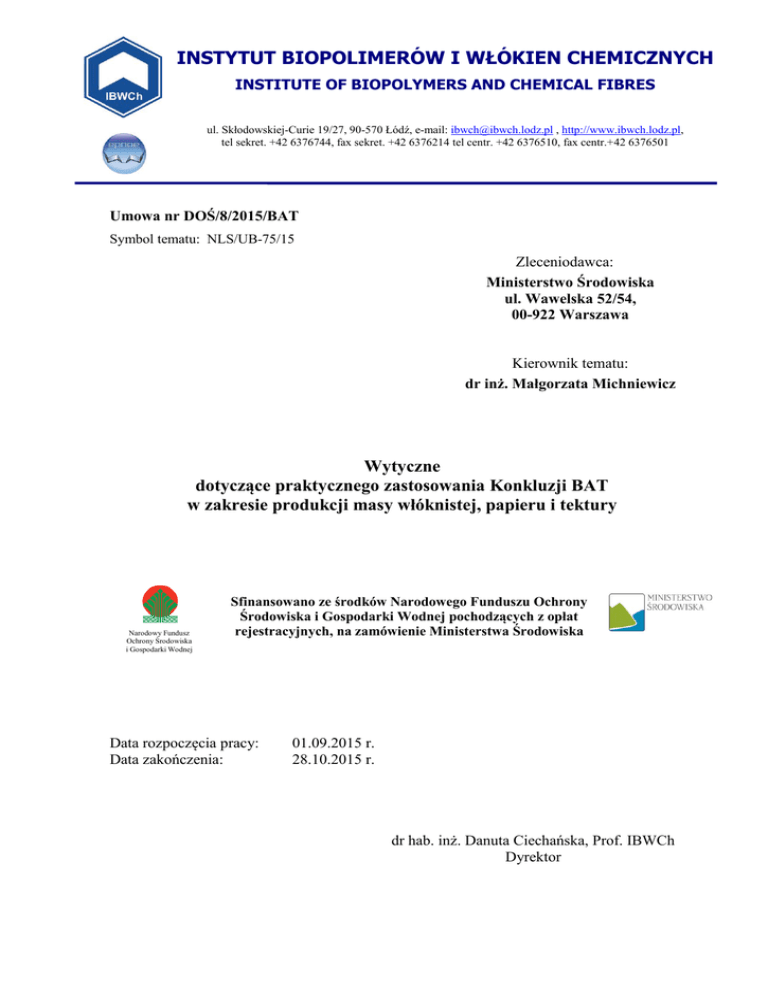 INSTYTUT BIOPOLIMERÓW I WŁÓKIEN CHEMICZNYCH INSTITUTE OF BIOPOLYMERS AND CHEMICAL FIBRES ul. Skłodowskiej-Curie 19/27, 90-570 Łódź, e-mail: [email protected] , http://www.ibwch.lodz.pl, tel sekret. +42 6376744, fax sekret. +42 6376214 tel centr. +42 6376510, fax centr.+42 6376501 Umowa nr DOŚ/8/2015/BAT Symbol tematu: NLS/UB-75/15 Zleceniodawca: Ministerstwo Środowiska ul. Wawelska 52/54, 00-922 Warszawa Kierownik tematu: dr inż. Małgorzata Michniewicz Wytyczne dotyczące praktycznego zastosowania Konkluzji BAT w zakresie produkcji masy włóknistej, papieru i tektury Narodowy Fundusz Ochrony Środowiska i Gospodarki Wodnej Sfinansowano ze środków Narodowego Funduszu Ochrony Środowiska i Gospodarki Wodnej pochodzących z opłat rejestracyjnych, na zamówienie Ministerstwa Środowiska Data rozpoczęcia pracy: Data zakończenia: 01.09.2015 r. 28.10.2015 r. dr hab. inż. Danuta Ciechańska, Prof. IBWCh Dyrektor Autorzy pracy: dr inż. Małgorzata Michniewicz mgr inż. Michał Janiga Spis treści 1. 2. 3. 3.1. 3.2. 3.2.1. 3.2.2. 3.2.3. 3.2.4. 3.3. 3.3.1. 3.3.2. 3.4. 3.5. 3.6. 3.7. 4. 4.1. 4.2. 4.3. 5. 5.1. 5.1.1. 5.1.2. 5.2. 5.2.1. 5.2.2. 5.3. 5.3.1. 5.3.2. 5.4. 6. 6.1. 6.2. 7. Wstęp . . . . . . . . . . . . . . . . . . . . . . . . . . . . . . . . . . . . . . . . . . . . . . . . . . . . . . . . . . . . . . . . Informacje ogólne . . . . . . . . . . . . . . . . . . . . . . . . . . . . . . . . . . . . . . . . . . . . . . . . . . . . . . Rekomendowane techniki uznawane za BAT w odniesieniu do produkcji mas włóknistych i papieru oraz powiązane z BAT poziomy emisji zanieczyszczeń . . . . . . . Techniki ogólne związane z zarządzaniem środowiskiem i materiałami . . . . . . . . . . . . Techniki służące zapobieganiu i ograniczaniu emisji do powietrza . . . . . . . . . . . . . . . . Emisje pyłów . . . . . . . . . . . . . . . . . . . . . . . . . . . . . . . . . . . . . . . . . . . . . . . . . . . . . . . . . . Emisje tlenków azotu . . . . . . . . . . . . . . . . . . . . . . . . . . . . . . . . . . . . . . . . . . . . . . . . . . . . Emisje związków siarki (SO2 i TRS) . . . . . . . . . . . . . . . . . . . . . . . . . . . . . . . . . . . . . . . . Emisje zapachów . . . . . . . . . . . . . . . . . . . . . . . . . . . . . . . . . . . . . . . . . . . . . . . . . . . . . . . Techniki służące zapobieganiu i ograniczaniu zużycia wody świeżej i ochrony środowiska wodnego . . . . . . . . . . . . . . . . . . . . . . . . . . . . . . . . . . . . . . . . . . . . . . . . . . . . Techniki zintegrowane z procesem . . . . . . . . . . . . . . . . . . . . . . . . . . . . . . . . . . . . . . . . . Techniki oczyszczania ścieków . . . . . . . . . . . . . . . . . . . . . . . . . . . . . . . . . . . . . . . . . . . . Techniki dotyczące zapobiegania wytwarzaniu odpadów i gospodarowania odpadami Techniki ograniczania emisji hałasu . . . . . . . . . . . . . . . . . . . . . . . . . . . . . . . . . . . . . . . . Techniki ograniczania zużycia energii . . . . . . . . . . . . . . . . . . . . . . . . . . . . . . . . . . . . . . Wycofanie z eksploatacji . . . . . . . . . . . . . . . . . . . . . . . . . . . . . . . . . . . . . . . . . . . . . . . . . Wytwórnie zintegrowane . . . . . . . . . . . . . . . . . . . . . . . . . . . . . . . . . . . . . . . . . . . . . . . . . Definicja i charakterystyka . . . . . . . . . . . . . . . . . . . . . . . . . . . . . . . . . . . . . . . . . . . . . . . Sposób obliczania zintegrowanych wskaźników BAT-AEL dla emisji do wody . . . . . . Przykład obliczeń dla parametru ChZT . . . . . . . . . . . . . . . . . . . . . . . . . . . . . . . . . . . . . . Weryfikacja spełniania wymagań konkluzji BAT w kontekście parametrów emisji stosowanych w pozwoleniach ekologicznych w Polsce . . . . . . . . . . . . . . . . . . . . . . . . . Wskaźniki emisji zastosowane w konkluzjach BAT . . . . . . . . . . . . . . . . . . . . . . . . . . . . Emisje do powietrza . . . . . . . . . . . . . . . . . . . . . . . . . . . . . . . . . . . . . . . . . . . . . . . . . . . . . Emisje do wody . . . . . . . . . . . . . . . . . . . . . . . . . . . . . . . . . . . . . . . . . . . . . . . . . . . . . . . . Parametry emisji stosowane w polskich pozwoleniach zintegrowanych dla zakładów branży papierniczej . . . . . . . . . . . . . . . . . . . . . . . . . . . . . . . . . . . . . . . . . . . . . . . . . . . . . Emisje do powietrza . . . . . . . . . . . . . . . . . . . . . . . . . . . . . . . . . . . . . . . . . . . . . . . . . . . . . Emisje do wody . . . . . . . . . . . . . . . . . . . . . . . . . . . . . . . . . . . . . . . . . . . . . . . . . . . . . . . . Sposób przeliczania wskaźników emisji . . . . . . . . . . . . . . . . . . . . . . . . . . . . . . . . . . . . . Emisje do powietrza . . . . . . . . . . . . . . . . . . . . . . . . . . . . . . . . . . . . . . . . . . . . . . . . . . . . . Emisje do wody . . . . . . . . . . . . . . . . . . . . . . . . . . . . . . . . . . . . . . . . . . . . . . . . . . . . . . . . Weryfikacja zgodności emisji do wody z wymaganiami BAT . . . . . . . . . . . . . . . . . . . . Monitoring emisji – wymagania konkluzji BAT dla przemysłu celulozowopapierniczego . . . . . . . . . . . . . . . . . . . . . . . . . . . . . . . . . . . . . . . . . . . . . . . . . . . . . . . . . . Emisje do powietrza z głównych źródeł technologicznych . . . . . . . . . . . . . . . . . . . . . . . Emisje do odbiornika wodnego . . . . . . . . . . . . . . . . . . . . . . . . . . . . . . . . . . . . . . . . . . . . Wskazówki odnoszące się do ustalania warunków korzystania ze środowiska w pozwoleniach zintegrowanych . . . . . . . . . . . . . . . . . . . . . . . . . . . . . . . . . . . . . . . . . . . Strona 2 2 4 4 6 6 7 10 12 14 14 22 25 27 28 29 29 29 31 33 35 35 35 36 36 36 36 37 37 38 39 39 39 40 1 1. Wstęp Konkluzje BAT dotyczące produkcji mas włóknistych, papieru i tektury zostały opublikowane we wszystkich językach Unii Europejskiej w Dzienniku Urzędowym 