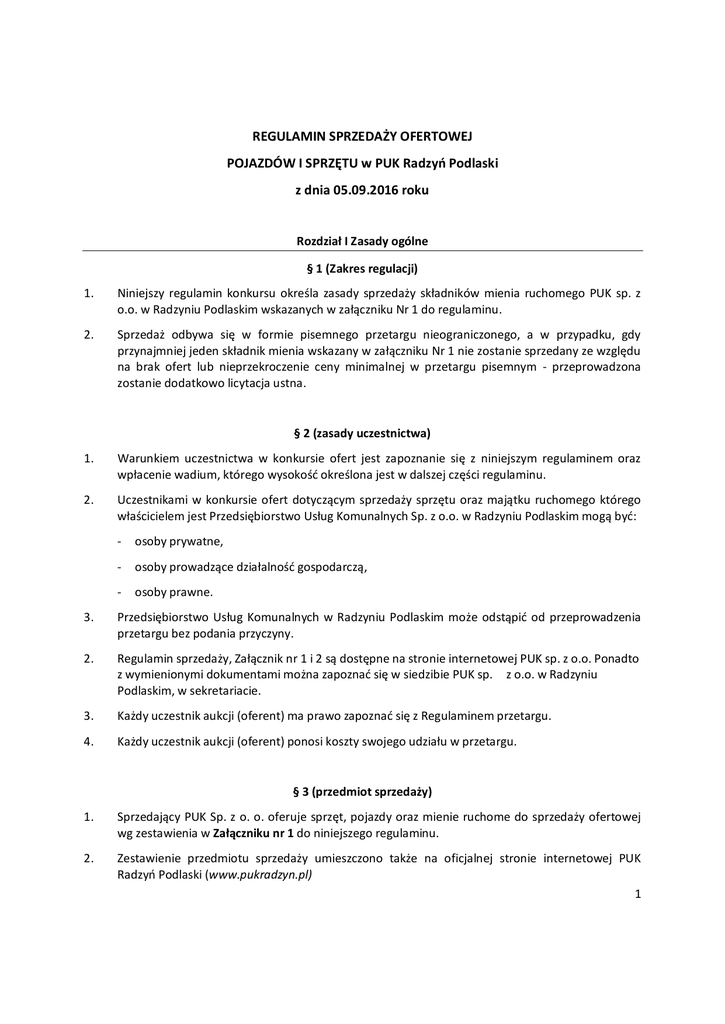 REGULAMIN SPRZEDAŻY OFERTOWEJ POJAZDÓW I SPRZĘTU w PUK Radzyń Podlaski z dnia 05.09.2016 roku Rozdział I Zasady ogólne § 1 (Zakres regulacji) 1. Niniejszy regulamin konkursu określa zasady sprzedaży składników mienia ruchomego PUK sp. z o.o. w Radzyniu Podlaskim wskazanych w załączniku Nr 1 do regulaminu. 2. Sprzedaż odbywa się w formie pisemnego przetargu nieograniczonego, a w przypadku, gdy przynajmniej jeden składnik mienia wskazany w załączniku Nr 1 nie zostanie sprzedany ze względu na brak ofert lub nieprzekroczenie ceny minimalnej w przetargu pisemnym - przeprowadzona zostanie dodatkowo licytacja ustna. § 2 (zasady uczestnictwa) 1. Warunkiem uczestnictwa w konkursie ofert jest zapoznanie się z niniejszym regulaminem oraz wpłacenie wadium, którego wysokość określona jest w dalszej części regulaminu. 2. Uczestnikami w konkursie ofert dotyczącym sprzedaży sprzętu oraz majątku ruchomego którego właścicielem jest Przedsiębiorstwo Usług Komunalnych Sp. z o.o. w Radzyniu Podlaskim mogą być: - osoby prywatne, - osoby prowadzące działalność gospodarczą, - osoby prawne. 3. Przedsiębiorstwo Usług Komunalnych w Radzyniu Podlaskim może odstąpić od przeprowadzenia przetargu bez podania przyczyny. 2. Regulamin sprzedaży, Załącznik nr 1 i 2 są dostępne na stronie internetowej PUK sp. z o.o. Ponadto z wymienionymi dokumentami można zapoznać się w siedzibie PUK sp. z o.o. w Radzyniu Podlaskim, w sekretariacie. 3. Każdy uczestnik aukcji (oferent) ma prawo zapoznać się z Regulaminem przetargu. 4. Każdy uczestnik aukcji (oferent) ponosi koszty swojego udziału w przetargu. § 3 (przedmiot sprzedaży) 1. Sprzedający PUK Sp. z o. o. oferuje sprzęt, pojazdy oraz mienie ruchome do sprzedaży ofertowej wg zestawienia w Załączniku nr 1 do niniejszego regulaminu. 2. Zestawienie przedmiotu sprzedaży umieszczono także na oficjalnej stronie internetowej PUK Radzyń Podlaski (www.pukradzyn.pl) 1 3. W zestawieniu podano informacje dotyczącymi nazwy, roku produkcji, przeznaczenia oraz wysokości wadium, a także ceny minimalnej. 4. Przedmioty z Załączniku nr 1 można obejrzeć pod adresem: ul. Zarzutki 7-9 (kocka 25) w Radzyniu Podlaskim na Bazie Transportowej PUK, po wcześniejszym ustaleniu terminu oględzin z pracownikiem Dyspozytorni w dni robocze w godzinach 09.00 - 15.00. Kontakt telefoniczny: stacjonarny 83 3526103, komórkowy 600356996 Rozdział II Przetarg pisemny § 4 (oferta) 1. Oferenci mogą składać oferty na dowolną ilość przedmiotów wskazanych w załączniku Nr 1. 2. Ofertę składa się pod rygorem jej odrzucenia w formie pisemnej (opatrzonej własnoręcznym podpisem) osobiście, poprzez operatora pocztowego lub kurierem (nie dopuszcza się formy faksu lub poczty elektronicznej). 3. Oferta musi być podpisana przez osobę uprawnioną do reprezentowania kupującego. 4. W ofercie podaję się cenę brutto. 5. Ofertę składa się wg formularza ofertowego stanowiącego Załącznik Nr 2 do niniejszego regulaminu. 6. Odrzuceniu podlega oferta, która: - nie ma formy pisemnej; - podpisana została przez osobę nieupoważnioną do reprezentowania kupującego; - została złożona po terminie; - jest nieważna na podstawie odrębnych przepisów; - jest niezgodna z niniejszym regulaminem. 7. Oferent może wycofać lub zmienić ofertę nie później niż na 3 dni przed terminem otwarcia ofert. § 5 (wadium) 1. Do każdej oferty kupujący załącza dowód uiszczenia wadium w kwocie zamieszczonej w Załączniku nr 1 do każdego sprzedawanego przedmiotu. 2. Wadia wnosi się w formie pieniężnej (nie dopuszcza się wadiów w innych formach w tym w gwarancjach ubezpieczeniowych lub bankowych). 3. Wadium wnosi się przelewem na rachunek bankowy (poniżej) lub poprzez wpłatę w kasie PUK. Bank Spółdzielczy w Radzyniu Podl., konto nr: 26 80460002 2001 0000 0215 0001 Bank PKO BP S.A., konto nr: 08 1020 3206 0000 8102 0038 4396 2 4. Wadium uważa się za wniesione, jeżeli zostało wpłacone przed upływem wyznaczonego terminu składania ofert lub przed terminem rozpoczęcia licytacji, zaksięgowane na koncie PUK lub jest w kasie PUK. 5. Niewniesienie wadium w wyznaczonym terminie będzie skutkowało odrzuceniem oferty. 6. Zwrot wpłaconego wadium dla oferentów, którzy nie wygrali przetargu nastąpi w ciągu 7 dni od dnia rozstrzygnięcia przetargu, na wskazane konto bankowe oferenta lub wypłacone zostanie w gotówce w kasie PUK Sp. z o.o., ul. Lubelska 5, 21-300 Radzyń Podlaski (parter) - nie dotyczy zwycięzców konkursu ofert lub licytacji. 7. Wadium wykonawcy wygrywającego przetarg zostanie mu zaliczone na poczet ceny. 8. Oferent (kupujący), który zaproponował najwyższą ofertę kupna, utraci wpłacone wadium, jeżeli nie zdecyduje się na sfinalizowanie transakcji, a sprzedający może zaproponować sprzedaż przedmiotu innemu uczestnikowi konkursu ofert lub licytacji, który zaproponował kolejną najwyższą cenę. § 6 (terminy) 1. Miejsce składania i otwarcia ofert: Przedsiębiorstwo Usług Komunalnych Sp. z o.o. w Radzyniu Podlaskim ul. Lubelska 5, 21-300 Radzyń Podlaski 2. Termin składania ofert: 26 września 2016 roku / godz. 12.00 3. Termin otwarcia ofert: 26 września 2016 roku / godz. 12.15 4. Miejsce ogłoszenia wyników konkursu ofert: 30 września 2016 roku / godz. 12.00 na stronie oficjalnej stronie PUK sp. z o.o. lub do wglądu w sekretariacie w siedziby PUK sp. z o.o. (ul. Lubelska 5, Radzyń Podlaski). § 7 (ocena ofert i wybór oferty najkorzystniejszej) 1. Komisja weryfikująca złożone oferty, składająca się z przedstawicieli sprzedającego (komisja trzy osobowa), przedstawi kierownictwu PUK ofertę z najniższą ceną, jeżeli w/w oferta przekroczy wartość minimalną. 2. Wynik przetargu oraz dane kupującego, umieszczone zostaną na stronie internetowej PUK. Wyniki konkursu ofert będą dostępne również w sekretariacie (pok. 100) w siedzibie organizatora sprzedaży (PUK sp. z o.o., ul. Lubelska