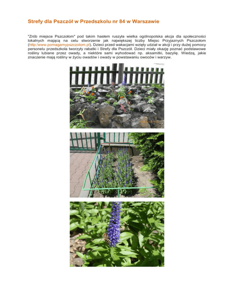 Strefy dla Pszczół w Przedszkolu nr 84 w Warszawie "Zrób miejsce Pszczołom" pod takim hasłem ruszyła wielka ogólnopolska akcja dla społeczności lokalnych mającą na celu stworzenie jak największej liczby Miejsc Przyjaznych Pszczołom (http:/www.pomagamypszczolom.pl). Dzieci przed wakacjami wzięły udział w akcji i przy dużej pomocy personelu przedszkola tworzyły rabatki i Strefy dla Pszczół. Dzieci miały okazję poznać podstawowe rośliny lubiane przez owady, a niektóre sami wyhodować np. aksamitki, bazylię. Wiedzą, jakie znaczenie mają rośliny w życiu owadów i owady w powstawaniu owoców i warzyw. Hodowla roślin w kąciku przyrody Kolejna roślina, która powinna znaleźć się w ogrodzie przyjaznym owadom. Bylina kwitnie jesienią, jest łatwa w uprawie i bardzo lubiana przez owady. Niespodzianka wśród kocimiętek Szukając Miejsc Przyjaznych Pszczołom, zrobiłam zdjęcie nieznanym mi owadom. Wyglądają jak para, ale co to za owady? Rozchodnik - roślina dla owadów Roślina bardzo łatwa w uprawie, odporna na suszę, choroby i mróz. Gdy zakwitnie, oznacza to koniec lata, ale na kwietnikach, w doniczkach wśród kwitnących kwiatów, prezentuje się ładnie przez całe lato. Warto ją mieć w ogrodzie, ponieważ jest bardzo lubiana przez wiele owadów. Tekst i zdjęcia: EWA REJNUS – Nauczyciel Przedszkola nr 84 „Promyk” Inicjatorka uczestnictwa w Projekcie „Zrób miejsce przyjazne pszczołom” http://ogrodkidlaowadow.blogspot.com/