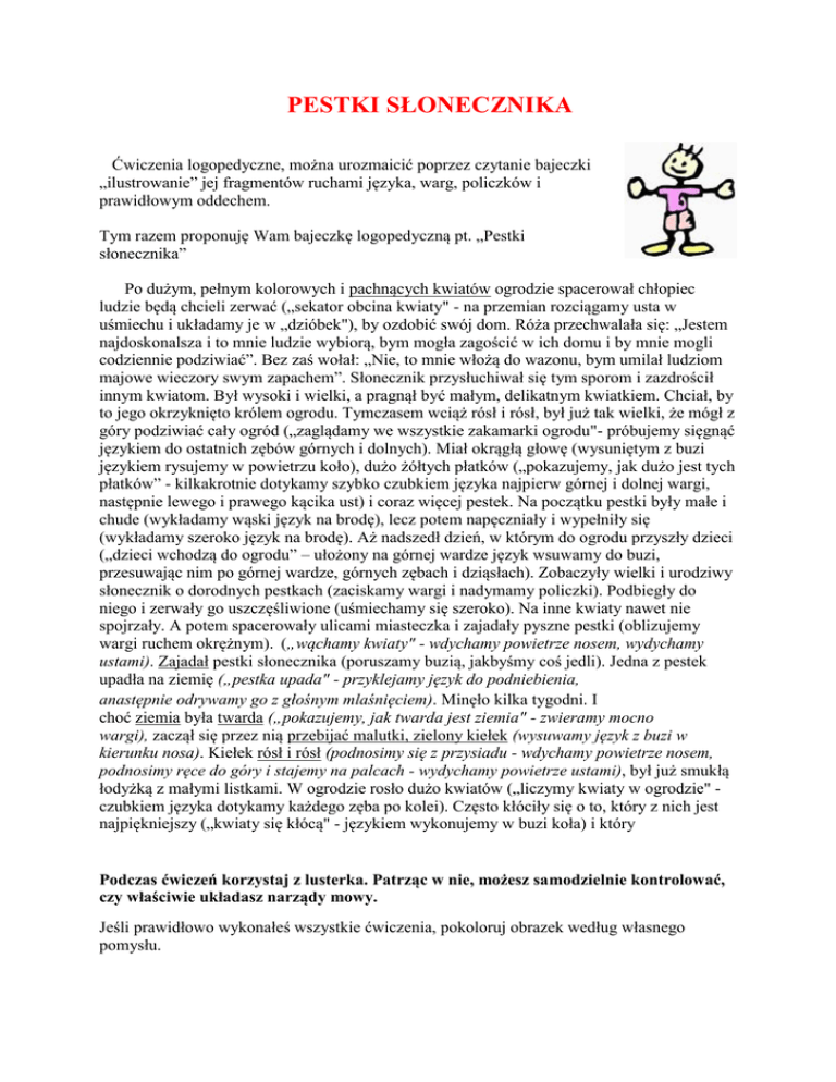 PESTKI SŁONECZNIKA Ćwiczenia logopedyczne, można urozmaicić poprzez czytanie bajeczki „ilustrowanie” jej fragmentów ruchami języka, warg, policzków i prawidłowym oddechem. Tym razem proponuję Wam bajeczkę logopedyczną pt. „Pestki słonecznika” Po dużym, pełnym kolorowych i pachnących kwiatów ogrodzie spacerował chłopiec ludzie będą chcieli zerwać („sekator obcina kwiaty" - na przemian rozciągamy usta w uśmiechu i układamy je w „dzióbek"), by ozdobić swój dom. Róża przechwalała się: „Jestem najdoskonalsza i to mnie ludzie wybiorą, bym mogła zagościć w ich domu i by mnie mogli codziennie podziwiać”. Bez zaś wołał: „Nie, to mnie włożą do wazonu, bym umilał ludziom majowe wieczory swym zapachem”. Słonecznik przysłuchiwał się tym sporom i zazdrościł innym kwiatom. Był wysoki i wielki, a pragnął być małym, delikatnym kwiatkiem. Chciał, by to jego okrzyknięto królem ogrodu. Tymczasem wciąż rósł i rósł, był już tak wielki, że mógł z góry podziwiać cały ogród („zaglądamy we wszystkie zakamarki ogrodu"- próbujemy sięgnąć językiem do ostatnich zębów górnych i dolnych). Miał okrągłą głowę (wysuniętym z buzi językiem rysujemy w powietrzu koło), dużo żółtych płatków („pokazujemy, jak dużo jest tych płatków” - kilkakrotnie dotykamy szybko czubkiem języka najpierw górnej i dolnej wargi, następnie lewego i prawego kącika ust) i coraz więcej pestek. Na początku pestki były małe i chude (wykładamy wąski język na brodę), lecz potem napęczniały i wypełniły się (wykładamy szeroko język na brodę). Aż nadszedł dzień, w którym do ogrodu przyszły dzieci („dzieci wchodzą do ogrodu” – ułożony na górnej wardze język wsuwamy do buzi, przesuwając nim po górnej wardze, górnych zębach i dziąsłach). Zobaczyły wielki i urodziwy słonecznik o dorodnych pestkach (zaciskamy wargi i nadymamy policzki). Podbiegły do niego i zerwały go uszczęśliwione (uśmiechamy się szeroko). Na inne kwiaty nawet nie spojrzały. A potem spacerowały ulicami miasteczka i zajadały pyszne pestki (oblizujemy wargi ruchem okrężnym). („wąchamy kwiaty" - wdychamy powietrze nosem, wydychamy ustami). Zajadał pestki słonecznika (poruszamy buzią, jakbyśmy coś jedli). Jedna z pestek upadła na ziemię („pestka upada" - przyklejamy język do podniebienia, anastępnie odrywamy go z głośnym mlaśnięciem). Minęło kilka tygodni. I choć ziemia była twarda („pokazujemy, jak twarda jest ziemia" - zwieramy mocno wargi), zaczął się przez nią przebijać malutki, zielony kiełek (wysuwamy język z buzi w kierunku nosa). Kiełek rósł i rósł (podnosimy się z przysiadu - wdychamy powietrze nosem, podnosimy ręce do góry i stajemy na palcach - wydychamy powietrze ustami), był już smukłą łodyżką z małymi listkami. W ogrodzie rosło dużo kwiatów („liczymy kwiaty w ogrodzie" czubkiem języka dotykamy każdego zęba po kolei). Często kłóciły się o to, który z nich jest najpiękniejszy („kwiaty się kłócą" - językiem wykonujemy w buzi koła) i który Podczas ćwiczeń korzystaj z lusterka. Patrząc w nie, możesz samodzielnie kontrolować, czy właściwie układasz narządy mowy. Jeśli prawidłowo wykonałeś wszystkie ćwiczenia, pokoloruj obrazek według własnego pomysłu.