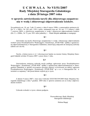 U C H W A Ł A Nr VI/51/2007 Rady Miejskiej Starogardu Gdańskiego z dnia 28 lutego 2007 roku w sprawie zatwierdzenia taryfy dla zbiorowego zaopatrzenia w wodę i zbiorowego odprowadzenie ścieków. Na podstawie art. 18, ust. 2 pkt 15 ustawy z dnia 8 marca 1990r. o samorządzie gminnym (tj. Dz. U. z 2001r., Nr 142, poz. 1591 z późn. zmianami) oraz art. 24, ust. 1 i 3 ustawy z dnia 7 czerwca 2001r. o zbiorowym zaopatrzeniu w wodę i zbiorowym odprowadzaniu ścieków (Dz. U. z 2006r., Nr 72, poz. 858 -tekst jednolity ) – Rada Miejska uchwala co następuje: §1 Zatwierdza się taryfę zbiorowego zaopatrzenia w wodę i zbiorowego odprowadzania ścieków przez Przedsiębiorstwo Wodociągów i Kanalizacji „STAR-WiK” spółka z ograniczoną odpowiedzialnością w Starogardzie Gdańskim, stanowiącą załącznik do niniejszej uchwały (tabele od A do H). §2 Taryfa, o której mowa w § 1 obowiązywać będzie na terenie Gminy Miejskiej Starogard Gdański od dnia 10 marca 2007 r. przez okres 1 roku. §3 Zatwierdzona niniejszą uchwałą taryfa podlega ogłoszeniu przez Przedsiębiorstwo Wodociągów i Kanalizacji „STAR-WiK” spółka z ograniczoną odpowiedzialnością w Starogardzie Gdańskim w sposób zwyczajowo przyjęty poprzez wywieszenie na tablicy ogłoszeń Przedsiębiorstwa Wodociągów i Kanalizacji „STAR-WiK” sp. z o.o. w Starogardzie Gd. w terminie co najmniej 7 dni przed dniem wejścia jej w życie. §4 Z dniem 9 marca 2007 r. traci moc Uchwała XXXVIII/359/2005 Rady Miejskiej Starogardu Gdańskiego z dnia 7 grudnia 2005 roku w sprawie ustalenia cen za wodę i odprowadzenie ścieków. §5 Uchwała wchodzi w życie z dniem podjęcia. Przewodniczący Rady Miejskiej Starogardu Gdańskiego Helena Bugaj U ZASAD N I E N I E DO WNIOSKU O ZATWIERDZENIE TARYF DLA ZBIOROWEGO ZAOPATRZENIA W WODĘ I ZBIOROWEGO ODPROWADZANIA ŚCIEKÓW Przedsiębiorstwo Wodociągów i Kanalizacji „Star-Wik” spółka z o.o. prowadzi działalność w zakresie zbiorowego zaopatrzenia w wodę oraz odprowadzania ścieków, w odniesieniu do której obowiązuje jedna taryfowa grupa odbiorców. Cena jest jednakowa i ma zastosowanie do wszystkich odbiorców Spółki. POZIOM CEN ZA DOSTAWĘ WODY I ODPROWADZANIE ŚCIEKÓW Nowa taryfa ceny za wodę w wysokości 2,15 zł/m3 jest o 0,10 zł wyższa od dotychczas obowiązującej, co stanowi wzrost o 4,88 %. Cena za 1m3 odprowadzonych ścieków wg nowej taryfy na poziomie 2,97 zł w porównaniu z rokiem 2006 wzrosła o 0,15 zł tj. o 5,32%. Proponowany wzrost cen w wyższej niż w latach poprzednich skali to efekt pozostawienia cen na niezmienionym poziomie w roku 2002 i 2003 oraz stosunkowo niskim przyroście cen w latach 2004-2006, nie równoważącym ogólnego corocznego wzrostu kosztów działalności gospodarczej spółki. Modernizacja sieci wodociągowej i kanalizacyjnej, która ma charakter ciągły powoduje wzrost wartości tych obiektów, co z kolei skutkuje wzrostem kosztów amortyzacji, podatków i opłat, ubezpieczeń majątku a w efekcie końcowym powoduje wzrost koszów i cen produkcji wody i odprowadzania ścieków. W ten sam sposób na koszty i ceny ma wpływ wzrost cen paliw, energii elektrycznej i gazu. PORÓWNANIE TARYF W WYBRANYCH MIASTACH WOJEWÓDZTWA POMORSKIEGO. Porównanie stawek za 1m3 w cenach netto obowiązujących w 2006 i 2007 r. dokonano na przykładzie następujących miast: Kościerzyny, Kartuz, Gniewa, Gdańska, Gdyni, Pruszcza, Malborka, Tczewa i Kwidzyna. W roku 2006 spośród wymienionych miast Starogard miał najniższą stawkę za wodę, bo 2,05 zł . Drugie miejsce w tej klasyfikacji zajął Tczew ze stawką 2,10 zł . W dalszej kolejności w przedziale od 2,15 do 2,28 zł znalazły się Malbork, Pruszcz i Kartuzy. Stawki od 2,31 do 2,38 zł stosowały w 2006 r. Gdynia, Kościerzyna, Kwidzyn, Gniew i Gdańsk. Różnica między najniższą a najwyższą stawką za wodę 2006 r. wyniosła 38 groszy. W odniesieniu do stawki za odprowadzanie ścieków Starogard z kwotą 2,82 zł znalazł się w środku tej grupy, albowiem niższe stawki odnotowano w Gniewie, Kwidzynie, Tczewie i Malborku ( od 2,07 do 2,74 zł ) a wyższe , w granicach od 3,00 do 3,60 zł stosowano w Gdańsku, Gdyni, Kartuzach i Kościerzynie. W przypadku stawki za ścieki zróżnicowanie między najwyższą a najniższą z nich stanowi już dużo wyższą kwotę, bo 1,53 zł . Taryfy w 2007 r. podobnie jak to miało miejsce w roku poprzednim są bardzo zróżnicowane. I tak przyjmując dla Starogardu cenę za wodę na rok bieżący w wysokości 2,15 zł/m3 to niższa stawka jest tylko w Tczewie – 2,12 zł. W pozostałych miastach cena jest wyższa i waha się w przedziale od 2,28 zł w Kartuzach do 2,55 zł/m3 w Gdyni. W niektórych przypadkach porównanie jest utrudnione, a wręcz niemożliwe ze względu na zastosowanie kilku taryf z podziałem na różnych odbiorców a także stosowanie opłat abonamentowych. Porównując cenę za odprowadzanie ścieków na poziomie 2,97 zł/m3 w Starogardzie, niższa kwota obowiązuje w Tczewie – 2,92 zł , ale dotyczy tylko gospodarstw i sfery niematerialnej, a dla sfery materialnej ustalono cenę na pozio- mie 4,80 zł. Biorąc pod uwagę ten aspekt należy uznać, niższą stawkę za ścieki w Starogardzie Gd. Natomiast w pozostałych badanych miastach ceny przewyższają kwotę 2,97 i kształtują w granicach od 3,14 w Gdańsku, 3,19 w Gdyni, 3,43 w Kartuzach, do 3,69 w Kościerzynie. Analiza porównawcza stawek wskazuje na to, że Starogard Gdański wśród wymienionych miast ma najniższą stawkę za wodę i jedną z najniższych stawek za odprowadzenie ścieków. CENY PWIK STAR-WIK NA TLE BRANŻY WODOCIĄGOWO-KANALIZACYJNEJ Dane opublikowane według stanu na dzień na 1 października 2006 r. przez Izbę Gospodarczą Wodociągi Polskie wskazują na to, że cena za wodę spółki „StarWik” w badanym okresie, czyli 2006 r. wynosiła 2,05 zł, co oznacza, że była o 0,38 zł poniżej średniej krajowej, która w