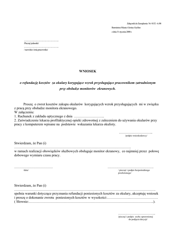 Załącznik do Zarządzenia Nr 0152 - 6./08 Burmistrza Miasta i Gminy Gryfino z dnia 31 stycznia 2008 r. ……………………………. /Pieczęć jednostki/ ……………………………. / nazwisko i imię pracownika/ WNIOSEK o refundację kosztów za okulary korygujące wzrok przysługujące pracownikom zatrudnionym przy obsłudze monitorów ekranowych. Proszę o zwrot kosztów zakupu okularów korygujących wzrok przysługujących mi w związku z pracą przy obsłudze monitora ekranowego. W załączeniu: 1. Rachunek z zakładu optycznego z dnia …………………….. 2. Zaświadczenie lekarza profilaktycznej opieki zdrowotnej z zaleceniem do używania okularów przy pracy z komputerem wpisane na podstawie wskazania lekarza okulisty. ……………………….. /podpis wnioskodawcy/ Stwierdzam, że Pan (i) ………………………………………………………………………………………. w ramach realizacji obowiązków służbowych obsługuje monitor ekranowy, co najmniej przez połowę dobowego wymiaru czasu pracy. ……………………………… /data/ ……………………………………. / pieczęć i podpis bezpośredniego przełożonego/ Stwierdzam, że Pan (i) …………………………………………………………………………………………………………. spełnia warunki dotyczące przyznania refundacji poniesionych kosztów za okulary, akceptuję wniosek i proszę o dokonanie zwrotu poniesionych kosztów w wysokości:………………..…………………… ( Słownie:……………………………………………………………………………………………..). …………………………….. /pieczęć i podpis osoby uprawnionej do podjęcia decyzji/