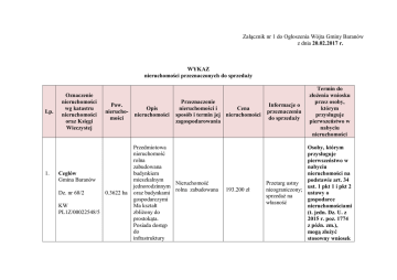 Załącznik nr 1 do Ogłoszenia Wójta Gminy Baranów z dnia 20.02.2017 r. WYKAZ nieruchomości przeznaczonych do sprzedaży Lp. 1. Oznaczenie nieruchomości wg katastru nieruchomości oraz Księgi Wieczystej Opis nieruchomości 0.3622 ha Przedmiotowa nieruchomość rolna zabudowana budynkiem mieszkalnym Nieruchomość jednorodzinnym rolna zabudowana oraz budynkami gospodarczymi Ma kształt zbliżony do prostokąta. Posiada dostęp do infrastruktury Cegłów Gmina Baranów Dz. nr 68/2 KW PL1Z/00022548/5 Przeznaczenie nieruchomości i Cena sposób i termin jej nieruchomości zagospodarowania Pow. nieruchomości 193.200 zł Informacje o przeznaczeniu do sprzedaży Termin do złożenia wniosku przez osoby, którym przysługuje pierwszeństwo w nabyciu nieruchomości Osoby, którym przysługuje pierwszeństwo w nabyciu nieruchomości na podstawie art. 34 Przetarg ustny ust. 1 pkt 1 i pkt 2 nieograniczony; ustawy o sprzedaż na gospodarce własność nieruchomościami (t. jedn. Dz. U. z 2015 r. poz. 1774 z późn. zm.), mogą złożyć stosowny wniosek technicznej (gaz, wodociąg) Położona jest bardzo blisko węzła autostrady A2 oraz w bliskim sąsiedztwie PKP Boża Wola Wykaz wywiesza się od dnia 20.02.2017 r. do dn. 13.03.2017 r. w terminie 6 tygodni od dnia wywieszenia wykazu tj. do dnia 03.04. 2017 r. Wójt Gminy Baranów Andrzej Kolek