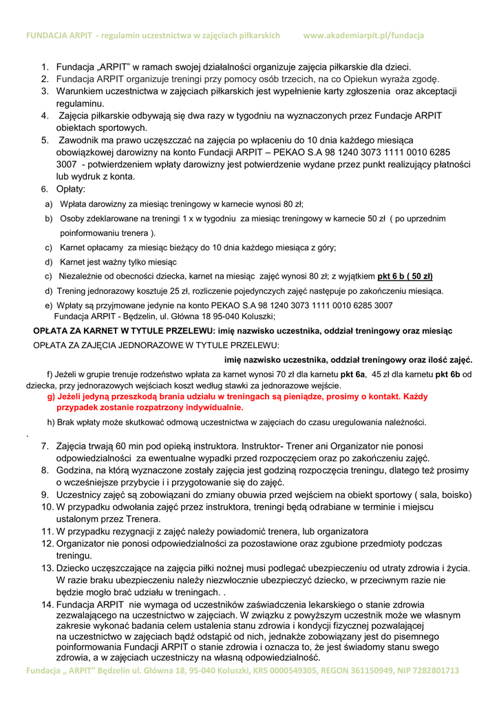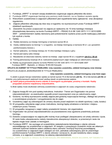 FUNDACJA ARPIT - regulamin uczestnictwa w zajęciach piłkarskich www.akademiarpit.pl/fundacja 1. Fundacja „ARPIT” w ramach swojej działalności organizuje zajęcia piłkarskie dla dzieci. 2. Fundacja ARPIT organizuje treningi przy pomocy osób trzecich, na co Opiekun wyraża zgodę. 3. Warunkiem uczestnictwa w zajęciach piłkarskich jest wypełnienie karty zgłoszenia oraz akceptacji regulaminu. 4. Zajęcia piłkarskie odbywają się dwa razy w tygodniu na wyznaczonych przez Fundacje ARPIT obiektach sportowych. 5. Zawodnik ma prawo uczęszczać na zajęcia po wpłaceniu do 10 dnia każdego miesiąca obowiązkowej darowizny na konto Fundacji ARPIT – PEKAO S.A 98 1240 3073 1111 0010 6285 3007 - potwierdzeniem wpłaty darowizny jest potwierdzenie wydane przez punkt realizujący płatności lub wydruk z konta. 6. Opłaty: a) Wpłata darowizny za miesiąc treningowy w karnecie wynosi 80 zł; b) Osoby zdeklarowane na treningi 1 x w tygodniu za miesiąc treningowy w karnecie 50 zł ( po uprzednim poinformowaniu trenera ). c) Karnet opłacamy za miesiąc bieżący do 10 dnia każdego miesiąca z góry; d) Karnet jest ważny tylko miesiąc c) Niezależnie od obecności dziecka, karnet na miesiąc zajęć wynosi 80 zł; z wyjątkiem pkt 6 b ( 50 zł) d) Trening jednorazowy kosztuje 25 zł, rozliczenie pojedynczych zajęć następuje po zakończeniu miesiąca. e) Wpłaty są przyjmowane jedynie na konto PEKAO S.A 98 1240 3073 1111 0010 6285 3007 Fundacja ARPIT - Będzelin, ul. Główna 18 95-040 Koluszki; OPŁATA ZA KARNET W TYTULE PRZELEWU: imię nazwisko uczestnika, oddział treningowy oraz miesiąc OPŁATA ZA ZAJĘCIA JEDNORAZOWE W TYTULE PRZELEWU: imię nazwisko uczestnika, oddział treningowy oraz ilość zajęć. f) Jeżeli w grupie trenuje rodzeństwo wpłata za karnet wynosi 70 zł dla karnetu pkt 6a, 45 zł dla karnetu pkt 6b od dziecka, przy jednorazowych wejściach koszt według stawki za jednorazowe wejście. g) Jeżeli jedyną przeszkodą brania udziału w treningach są pieniądze, prosimy o kontakt. Każdy przypadek zostanie rozpatrzony indywidualnie. h) Brak wpłaty może skutkować odmową uczestnictwa w zajęciach do czasu uregulowania należności. . 7. Zajęcia trwają 60 min pod opieką instruktora. Instruktor- Trener ani Organizator nie ponosi odpowiedzialności za ewentualne wypadki przed rozpoczęciem oraz po zakończeniu zajęć. 8. Godzina, na którą wyznaczone zostały zajęcia jest godziną rozpoczęcia treningu, dlatego też prosimy o wcześniejsze przybycie i i przygotowanie się do zajęć. 9. Uczestnicy zajęć są zobowiązani do zmiany obuwia przed wejściem na obiekt sportowy ( sala, boisko) 10. W przypadku odwołania zajęć przez instruktora, treningi będą odrabiane w terminie i miejscu ustalonym przez Trenera. 11. W przypadku rezygnacji z zajęć należy powiadomić trenera, lub organizatora 12. Organizator nie ponosi odpowiedzialności za pozostawione oraz zgubione przedmioty podczas treningu. 13. Dziecko uczęszczające na zajęcia piłki nożnej musi podlegać ubezpieczeniu od utraty zdrowia i życia. W razie braku ubezpieczeniu należy niezwłocznie ubezpieczyć dziecko, w przeciwnym razie nie będzie mogło brać udziału w treningach. . 14. Fundacja ARPIT nie wymaga od uczestników zaświadczenia lekarskiego o stanie zdrowia zezwalającego na uczestnictwo w zajęciach. W związku z powyższym uczestnik może we własnym zakresie wykonać badania celem ustalenia stanu zdrowia i kondycji fizycznej pozwalającej na uczestnictwo w zajęciach bądź odstąpić od nich, jednakże zobowiązany jest do pisemnego poinformowania Fundacji ARPIT o stanie zdrowia i oznacza to, że jest świadomy stanu swego zdrowia, a w zajęciach uczestniczy na własną odpowiedzialność. Fundacja „ ARPIT” Będzelin ul. Główna 18, 95-040 Koluszki, KRS 0000549305, REGON 361150949, NIP 7282801713 FUNDACJA ARPIT - regulamin uczestnictwa w zajęciach piłkarskich www.akademiarpit.pl/fundacja ZGŁOSZENIE DZIECKA DO FUNDACJI ARPIT Formularz oraz regulamin na stronie www.akademiarpit.pl/fundacja ODDZIAŁ: Imię i nazwisko dziecka: Data urodzenia: Miejsce zamieszkania: Telefon: Email: Imiona i nazwiska rodziców/opiekunów: Oświadczenie o ubezpieczeniu dziecka: Dziecko ubezpieczone w ………………………………………… Potwierdzam podpisem: Zapoznałam/em się z regulaminem Fundacji ARPIT i akceptuje go. Zobowiązuję się do dostarczenia badań Potwierdzam podpisem: lekarskich / Jestem świadomy stanu zdrowia mojego dziecka. Moje dziecko w zajęciach uczestniczy na moją własną odpowiedzialność. Zgoda na wykorzystanie wizerunku dziecka TAK / NIE Oświadczam, że: - wyrażam zgodę na przetwarzanie danych osobowych przez Fundacje ARPIT w celu przekazywania informacji za pomocą poczty elektronicznej, telefonu, wiadomości SMS, MMS, przesyłek pocztowych, zgodnie z Ustawą o świadczeniu usług drogą elektroniczną z dnia 26 sierpnia 2002 r. (Dz. U. nr 144 poz. 1204) oraz Ustawą o ochronie danych osobowych z dnia 29 sierpnia 1997 r. (Dz. U. nr 133 poz. 883). - wyrażam zgodę na przesyłanie drogą elektroniczną na wskazany w karcie adres e-mail Newslettera Fundacji ARPIT oraz innych publikacji, informacji i ofert handlowych zawierających reklamy, zgodnie z Ustawą o świadczeniu usług drogą elektroniczną z dnia 26 sierpnia 2002 r. (Dz. U. nr 144 poz. 1204) oraz Ustawą o ochronie danych osobowych z dnia 29 sierpnia 1997 r. (Dz. U. nr 133 poz. 883). - oświadczam, że znam swoje prawo do wglądu do swoich danych oraz prawo ich poprawiania. Fundacja „ ARPIT” Będzelin ul. Główna 18, 95-040 Koluszki, KRS 0000549305, REGON 361150949, NIP 7282801713