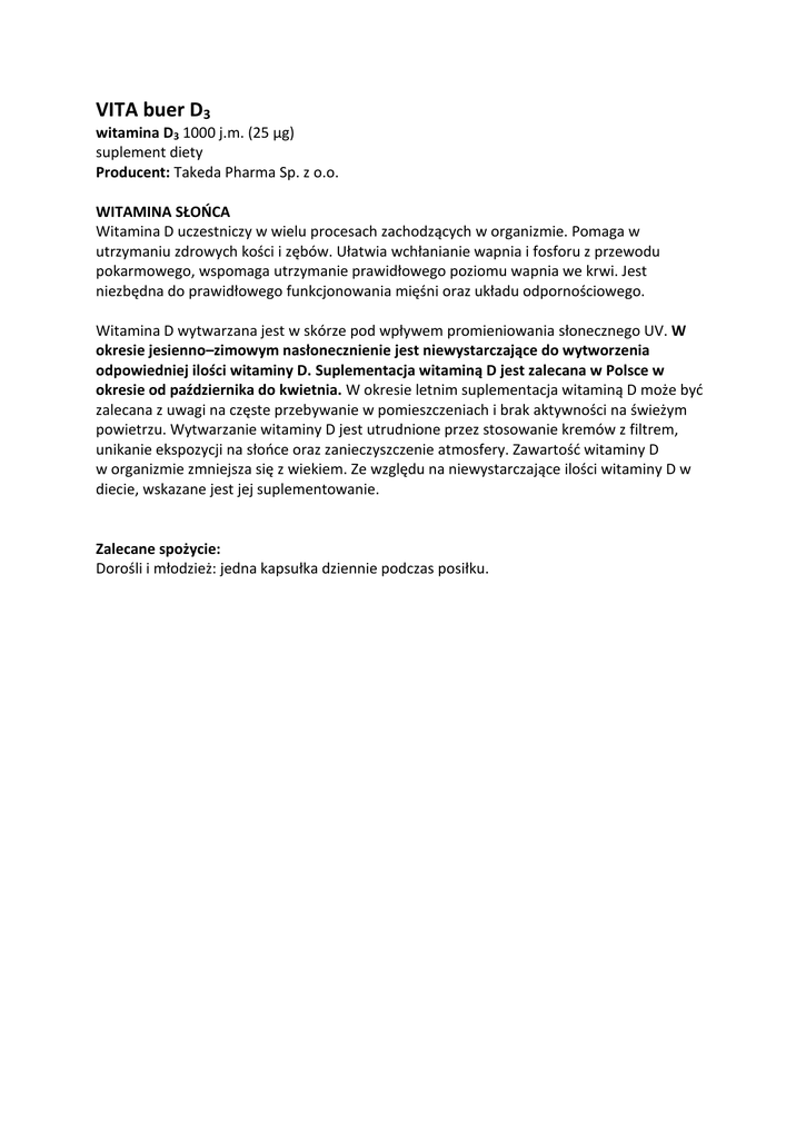 VITA buer D3 witamina D3 1000 j.m. (25 μg) suplement diety Producent: Takeda Pharma Sp. z o.o. WITAMINA SŁOŃCA Witamina D uczestniczy w wielu procesach zachodzących w organizmie. Pomaga w utrzymaniu zdrowych kości i zębów. Ułatwia wchłanianie wapnia i fosforu z przewodu pokarmowego, wspomaga utrzymanie prawidłowego poziomu wapnia we krwi. Jest niezbędna do prawidłowego funkcjonowania mięśni oraz układu odpornościowego. Witamina D wytwarzana jest w skórze pod wpływem promieniowania słonecznego UV. W okresie jesienno–zimowym nasłonecznienie jest niewystarczające do wytworzenia odpowiedniej ilości witaminy D. Suplementacja witaminą D jest zalecana w Polsce w okresie od października do kwietnia. W okresie letnim suplementacja witaminą D może być zalecana z uwagi na częste przebywanie w pomieszczeniach i brak aktywności na świeżym powietrzu. Wytwarzanie witaminy D jest utrudnione przez stosowanie kremów z filtrem, unikanie ekspozycji na słońce oraz zanieczyszczenie atmosfery. Zawartość witaminy D w organizmie zmniejsza się z wiekiem. Ze względu na niewystarczające ilości witaminy D w diecie, wskazane jest jej suplementowanie. Zalecane spożycie: Dorośli i młodzież: jedna kapsułka dziennie podczas posiłku.