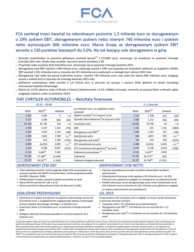 FCA zamknął trzeci kwartał na rekordowym poziomie 1,5 miliarda euro ze skorygowanym o 29% zyskiem EBIT, skorygowanym zyskiem netto równym 740 milionów euro i zyskiem netto wynoszącym 606 milionów euro. Marża Grupy ze skorygowanym zyskiem EBIT wzrosła o 130 punktów bazowych do 5,6%. Na rok bieżący cele skorygowano w górę. (1) Sprzedaż samochodów na poziomie globalnym wyniosła łącznie 1.123.000 sztuk, utrzymując się zasadniczo na poziomie trzeciego kwartału 2015 roku. Marka Jeep uzyskała łączny(1) wzrost sprzedaży o 3% . Przychody netto wyniosły 26,8 miliardów euro, utrzymując się na poziomie trzeciego kwartału 2015. Skorygowany zysk EBIT wyniósł 1.500 miliona euro, wykazując wzrost o 29% oraz poprawę we wszystkich sektorach za wyjątkiem LATAM; EBIT wyniósł 1.341 milionów euro w stosunku do 225 milionów euro uzyskanych w analogicznym okresie 2015 roku. Skorygowany zysk netto był ponad trzykrotnie wyższy i wyniósł 740 milionów euro; zysk netto był równy 606 milionów euro, osiągając wzrost o miliard euro w stosunku do trzeciego kwartału 2015 roku. Zadłużenie przemysłowe netto wzrosło o 1,0 miliard euro w stosunku do sytuacji z czerwca 2016, głównie na skutek normalnej sezonowości kapitału obrotowego. Rośnie do 12,5% udział w rynku (+30 pb) w Stanach Zjednoczonych i 6,1% (+40pb) w Europie; umocniła się pozycja lidera w Brazylii, gdzie osiągnięto udział w rynku na poziomie 18,6% FIAT CHRYSLER AUTOMOBILES – Rezultaty finansowe 01.01 – 30.09 3- ci kwartał 3.487 3.481 6 —% (w milionach euro, za wyjątkiem innych wskazań) Ogółem sprzedaż(1)(w tysiącach sztuk) 3.327 3.396 (2)% Sprzedaż skonsolidowana(1)(w tysiącach sztuk) 81.299 81.181 (69) 118 3.708 2.147 1.561 +73% 4.507 3.264 1.243 +38% (103) 613 1.508 (7) 1.364 +223% (0,075) 0,965 (7) 2016 1.405 1.977 0,890 1,256 (2) 2015 0,399 Zmiana 0,857 6.514 5.049(5) 1.465 25.292 27.786(5) (2.494) 23.197 (5) (1.360) 24.557 —% n.z. n.z. +215% 2016 (2) 2015 Zmiana 1.123 1.138 (15) (1)% 1.066 1.112 (4)% 26.836 26.798 (46) 38 EBIT 1.341 225 1.116 +496% Skorygowany zysk EBIT(3) 1.500 1.163 337 +29% 606 (387) 210 993 n.z.(7) 530 +252% (0,255) 0,643 n.z.(7) 0,140 0,334 +239% Przychody netto Zysk/(strata) netto Skorygowany zysk netto (3) 740 0,388 EPS rozwodniony (w euro) (3) EPS rozwodniony skorygowany (w euro) 0,474 Zadłużenie przemysłowe (3) 6.514 5.474(4) Zadłużenie 25.292 25.374(4) (82) Całkowita dostępna płynność 23.197 24.748(4) (1.551) —% 1.040 SKORYGOWANY ZYSK EBIT SKORYGOWANY ZYSK NETTO • Trzeci rekordowy kwartał został osiągnięty dzięki stale utrzymującym się mocnym wynikom dla NAFTA i Komponentów, z istotną poprawą wyników dla APAC, Maserati i EMEA • LATAM prawie na równi, pomimo trudnych warunków na rynku • Marża NAFTA wzrosła do 7,6% z 6,7% • Marża powróciła to dwucyfrowej liczby dla Maserati (11,8%) • Poprawa spowodowana przede wszystkim doskonałymi wynikami operacyjnymi. • Zobowiązania finansowe netto spadają o 93 milionów euro - do 528 milionów euro, głównie ze względu na zmniejszenie się zadłużenia brutto • Podatki odnoszące się do skorygowanego zysku netto zredukowały się do 232 milionów euro w stosunku do 332 milionów euro, głównie ze względu na większe wykorzystanie ulg podatkowych ZADŁUŻENIE PRZEMYSŁOWE CEL 2016 • Generowanie środków pieniężnych zarządzania operacyjnego równe jest 0,8 miliarda euro, z uwzględnieniem negatywnego wpływu sezonowego wzrostu kapitału obrotowego równego 1,2 miliarda euro • Inwestycje równe 2,0 miliardom euro, na poziomie trzeciego kwartału 2015 • Dostępna płynność finansowa pozostała na mocnym poziomie 23,2 miliarda euro Grupa podnosi cele na bieżący rok ze względu na mocne wyniki operacyjne za pierwsze dziewięć miesięcy: • Przychody netto> 112 miliardów euro (potwierdzone) • Skorygowany zysk EBIT(6)> 5,8 miliarda euro (w stosunku do > 5,5 miliardów euro) • Skorygowany zysk netto(6)> 2,3 miliarda euro (w stosunku do> 2,0 miliardów euro) _________________________________________________________________________________________________________________________________________________________________________ • Zadłużenie przemysłowe < 5,0 miliardi di euro (confermato) (1) Sprzedaż ogółem obejmuje również sprzedaż dokonaną przez nieskonsolidowane spółki joint venture Grupy, natomiast skonsolidowana sprzedaż globalna obejmuje tylko tą dokonaną przez spółki skonsolidowane Grupy; (2) Rezultaty Grupy zostały ponownie określone, aby wyłączyć Ferrari, zgodnie z prezentacją Ferrari- Discontinued Operation za rok obrachunkowy zamknięty na dzień 31 grudnia 2015; patrz strona 8,aby zapoznać się z uzgodnieniami pomiędzy aktualnymi rezultatami, a rezultatami opublikowanymi wcześniej; (3) patrz strona 7, aby zapoznać się z uzgodnieniami pomiędzy skorygowanym zyskiem EBIT, a zyskiem EBIT, skorygowanym zyskiem netto i zyskiem netto, rozwodnionym skorygowanym zyskiem EPS a EPS rozwodnionym i strona 8, aby zapoznać się z uzgodnieniami pomiędzy zadłużeniem przemysłowym, a zadłużeniem; (4) Na 30 czerwca 2016; (5) Na 31 grudnia 2015; (6) Takie dodatkowe pomiary podawane są jako “nieGAAP”; nie są podawane cele do porównania dla pozycji w budżecie IFRS, ponieważ przychody i zobowiązania wynikające ze skorygowanego zysku EBITi ze skorygowanego zysku netto, w oparciu o zastosowane przez Grupę kryteria są z definicji nieprzewidywalne i niepewne; (7) dana nie ma znaczącego wpływu. Rezultaty według sektora działalności Przychody netto i skorygowany zysk EBIT według sektora działalności Przychody netto Skorygowany zysk EBIT 3 ̊kwartał 3 ̊kwartał 2016 2015 16.810 17.704 1.491 1.515 861 842 5.070 4.611 873 516 2.390 (wmilionach euro) 2016 2015 NAFTA 1.281 1.186 LATAM (16) 28 APAC 21 (83) EMEA 104 20 Maserati 103 12 2.348 Komponenty 112 98 (659) (738) Pozostałe działalności, nieprzydzielone pozycje
