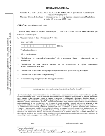 KARTA ZGŁOSZENIA udziału w „I HISTORYCZNYM RAJDZIE ROWEROWYM po Gminie Młodzieszyn” organizowanym przez Gminny Ośrodek Kultury w Młodzieszynie we współpracy z Jarosławem Duplickim w dniu 10 września 2016 roku Pełnoletni uczestnik rajdu wypełnia tylko część A karty zgłoszenia. Uczestnik niepełnoletni dostarcza kartę zgłoszenia wypełnioną w części A, B i C. CZĘŚĆ A – wypełnia uczestnik rajdu Zgłaszam swój udział w Rajdzie Rowerowym „I HISTORYCZNY RAJD ROWEROWY po Gminie Młodzieszyn” 1. Organizowanym w dniu 10 września 2016 roku Imię i nazwisko ____________________________________________________________ PESEL Telefon kontaktowy: ________________________ Adres zamieszkania: ______________________________________________________ 2. Oświadczam, że zapoznałem/zapoznałam*/ się z regulamin Rajdu i zobowiązuję się go przestrzegać. 3. Oświadczam, że stan zdrowia pozwala mi na uczestnictwo w rajdzie rowerowym w dniu 10 września 2016 roku. 4. Oświadczam, że posiadam niezbędną wiedzę i umiejętności poruszania się po drogach. 5. Oświadczam, że posiadam kartę rowerową.**/ 6. W razie nieszczęśliwego wypadku należy powiadomić: ________________________________________________________________________ imię i nazwisko osoby, stopień pokrewieństwa, telefon kontaktowy 1) wykonanie zdjęć z moim wizerunkiem oraz na wielokrotne i nieograniczone w czasie rozpowszechnianie tych lub uzyskanych ode mnie zdjęć z moim wizerunkiem przez Gminny Ośrodek Kultury w Młodzieszynie. Wizerunek, o którym tu mowa zawsze wykorzystywany będzie w celach związanych z działalnością Gminnego Ośrodka Kultury w Młodzieszynie lub podmiotów z nią współpracujących. Zgoda na rozpowszechnianie obejmuje także inne wykorzystanie, utrwalenie, obróbkę, przetwarzanie, przekaz i powielanie wykonanych zdjęć z moim wizerunkiem na wszystkich znanych polach eksploatacji, w tym określonych w art. 50 ustawy o prawie autorskim i prawach pokrewnych, wyłącznie w celu związanym z działalnością Gminnego Ośrodka Kultury w Młodzieszynie lub podmiotów z nią współpracujących. 2) przetwarzanie moich danych osobowych obejmujących: imię i nazwisko, nr telefonu podanego jako kontaktowy w związku z uczestnictwem w rajdzie. Jednocześnie oświadczam, że zostałem/am poinformowany/a, że administratorem ww. danych oraz wizerunku jest Gminny Ośrodek Kultury w Młodzieszynie oraz że mam prawo wglądu w swoje dane i możliwość ich poprawiania. Ponadto zostałem/am poinformowany/a, że podanie danych ma charakter dobrowolny, ale niezbędny do udziału w ww. przedsięwzięciu. Oświadczam, że jestem osobą pełnoletnią i nieograniczoną w zdolności do czynności prawnych a zgodę powyższą udzielam w pełni świadomie. ____________________ ____________________________ data podpis uczestnika rajdu _______________________________________________________________________________ */ niepotrzebne skreślić pełnoletni uczestnik rajdu przekreśla pkt 5 w części A ***/ w przypadku, gdy opiekunem podczas rajdu będzie rodzic pkt 4 w części B należy przekreślić **/ CZĘŚĆ B – wypełnia rodzic lub opiekun prawny niepełnoletniego uczestnika rajdu Ja, niżej podpisany/podpisana*/ ______________________________________________ oświadczam, że zapoznałem/zapoznałam*/ się z regulaminem Rajdu Rowerowego „I HISTORYCZNY RAJD ROWEROWY po Gminie Młodzieszyn” udział mojego syna/córki */ i wyrażam zgodę na __________________________________________ w rajdzie w dniu 10 września 2016 roku. Pełnoletni uczestnik rajdu wypełnia tylko część A karty zgłoszenia. Uczestnik niepełnoletni dostarcza kartę zgłoszenia wypełnioną w części A, B i C. 1. Oświadczam, że stan zdrowia mojego syna/mojej córki*/ pozwala na uczestnictwo w rajdzie w dniu 10 września 2016 roku. 2. Oświadczam, że wyznaczam na opiekuna mojego syna/mojej córki*/ w trakcie trwania rajdu w dniu 10 września 2016 roku Pana/Panią*/______________________________.***/ 3. Potwierdzam zgodność ze stanem faktycznym oświadczeń złożonych przez mojego syna/moją córkę*/ w CZĘŚCI A karty zgłoszenia. ____________________ ___________________________ data podpis rodzica/opiekuna prawnego CZĘŚĆ C – wypełnia opiekun niepełnoletniego uczestnika rajdu Ja, niżej podpisany/podpisana*/ ______________________________________________ oświadczam, że: 1) zapoznałem/zapoznałam*/ się z regulaminem Rajdu Rowerowego „I HISTORYCZNY RAJD ROWEROWY po Gminie Młodzieszyn” 2) będę jego uczestnikiem, 3) w czasie trwania rajdu w dniu 10 września 2016 roku sprawować będę całkowitą opiekę nad nieletnim _____________________________________. ____________________ data _____________________________ podpis opiekuna niepełnoletniego uczestnika rajdu CZĘŚĆ D – wypełnia organizator 1) Dopuszczam/nie dopuszczam*/ zgłoszonego uczestnika do udziału Rajdu Rowerowego „I HISTORYCZNY RAJD ROWEROWY po Gminie Młodzieszyn”, w dniu 10 września 2016 roku. ____________________ ____________________________ data podpis kierownika rajdu _______________________________________________________________________________ */ niepotrzebne skreślić pełnoletni uczestnik rajdu przekreśla pkt 5 w części A ***/ w przypadku, gdy opiekunem podczas rajdu będzie rodzic pkt 4 w części B należy przekreślić **/
