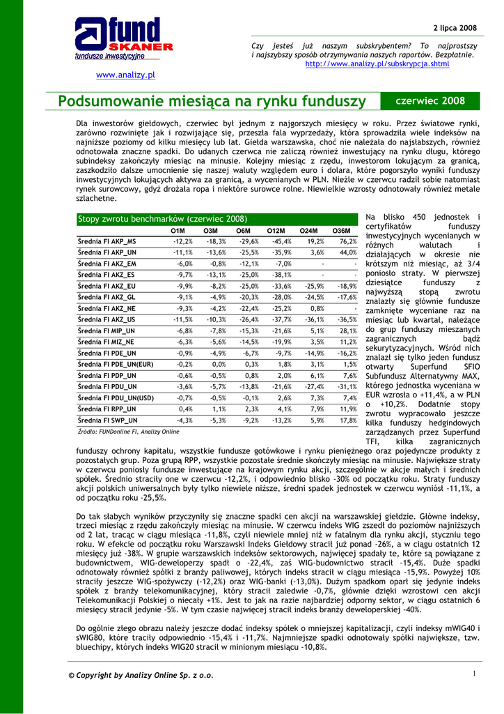 2 lipca 2008 Czy jesteś już naszym subskrybentem? To najprostszy i najszybszy sposób otrzymywania naszych raportów. Bezpłatnie. http://www.analizy.pl/subskrypcja.shtml www.analizy.pl Podsumowanie miesiąca na rynku funduszy czerwiec 2008 Dla inwestorów giełdowych, czerwiec był jednym z najgorszych miesięcy w roku. Przez światowe rynki, zarówno rozwinięte jak i rozwijające się, przeszła fala wyprzedaży, która sprowadziła wiele indeksów na najniższe poziomy od kilku miesięcy lub lat. Giełda warszawska, choć nie należała do najsłabszych, również odnotowała znaczne spadki. Do udanych czerwca nie zaliczą również inwestujący na rynku długu, którego subindeksy zakończyły miesiąc na minusie. Kolejny miesiąc z rzędu, inwestorom lokującym za granicą, zaszkodziło dalsze umocnienie się naszej waluty względem euro i dolara, które pogorszyło wyniki funduszy inwestycyjnych lokujących aktywa za granicą, a wycenianych w PLN. Nieźle w czerwcu radził sobie natomiast rynek surowcowy, gdyż drożała ropa i niektóre surowce rolne. Niewielkie wzrosty odnotowały również metale szlachetne. Na blisko 450 jednostek i certyfikatów funduszy O1M O3M O6M O12M O24M O36M inwestycyjnych wycenianych w Średnia FI AKP_MS -12,2% -18,3% -29,6% -45,4% 19,2% 76,2% różnych walutach i Średnia FI AKP_UN -11,1% -13,6% -25,5% -35,9% 3,6% 44,0% działających w okresie nie Średnia FI AKZ_EM -6,0% -0,8% -12,1% -7,0% - krótszym niż miesiąc, aż 3/4 Średnia FI AKZ_ES -9,7% -13,1% -25,0% -38,1% - poniosło straty. W pierwszej funduszy z Średnia FI AKZ_EU -9,9% -8,2% -25,0% -33,6% -25,9% -18,9% dziesiątce najwyższą stopą zwrotu Średnia FI AKZ_GL -9,1% -4,9% -20,3% -28,0% -24,5% -17,6% znalazły się głównie fundusze Średnia FI AKZ_NE -9,3% -4,2% -22,4% -25,2% 0,8% - zamknięte wyceniane raz na Średnia FI AKZ_US -11,5% -10,3% -26,4% -37,7% -36,1% -36,5% miesiąc lub kwartał, należące Średnia FI MIP_UN -6,8% -7,8% -15,3% -21,6% 5,1% 28,1% do grup funduszy mieszanych bądź Średnia FI MIZ_NE -6,3% -5,6% -14,5% -19,9% 3,5% 11,2% zagranicznych sekurytyzacyjnych. Wśród nich Średnia FI PDE_UN -0,9% -4,9% -6,7% -9,7% -14,9% -16,2% znalazł się tylko jeden fundusz Średnia FI PDE_UN(EUR) -0,2% 0,0% 0,3% 1,8% 3,1% 1,5% otwarty Superfund SFIO Średnia FI PDP_UN -0,6% -0,5% 0,8% 2,0% 6,1% 7,6% Subfundusz Alternatywny MAX, Średnia FI PDU_UN -3,6% -5,7% -13,8% -21,6% -27,4% -31,1% którego jednostka wyceniana w Średnia FI PDU_UN(USD) -0,7% -0,5% -0,1% 2,6% 7,3% 7,4% EUR wzrosła o +11,4%, a w PLN o +10,2%. Dodatnie stopy Średnia FI RPP_UN 0,4% 1,1% 2,3% 4,1% 7,9% 11,9% zwrotu wypracowało jeszcze Średnia FI SWP_UN -4,3% -5,3% -9,2% -13,2% 5,9% 17,8% kilka funduszy hedgindowych Źródło: FUNDonline FI, Analizy Online zarządzanych przez Superfund TFI, kilka zagranicznych funduszy ochrony kapitału, wszystkie fundusze gotówkowe i rynku pieniężnego oraz pojedyncze produkty z pozostałych grup. Poza grupą RPP, wszystkie pozostałe średnie skończyły miesiąc na minusie. Największe straty w czerwcu poniosły fundusze inwestujące na krajowym rynku akcji, szczególnie w akcje małych i średnich spółek. Średnio straciły one w czerwcu -12,2%, i odpowiednio blisko -30% od początku roku. Straty funduszy akcji polskich uniwersalnych były tylko niewiele niższe, średni spadek jednostek w czerwcu wyniósł -11,1%, a od początku roku -25,5%. Stopy zwrotu benchmarków (czerwiec 2008) Do tak słabych wyników przyczyniły się znaczne spadki cen akcji na warszawskiej giełdzie. Główne indeksy, trzeci miesiąc z rzędu zakończyły miesiąc na minusie. W czerwcu indeks WIG zszedł do poziomów najniższych od 2 lat, tracąc w ciągu miesiąca -11,8%, czyli niewiele mniej niż w fatalnym dla rynku akcji, styczniu tego roku. W efekcie od początku roku Warszawski Indeks Giełdowy stracił już ponad -26%, a w ciągu ostatnich 12 miesięcy już -38%. W grupie warszawskich indeksów sektorowych, najwięcej spadały te, które są powiązane z budownictwem, WIG-deweloperzy spadł o -22,4%, zaś WIG-budownictwo stracił -15,4%. Duże spadki odnotowały również spółki z branży paliwowej, których indeks stracił w ciągu miesiąca -15,9%. Powyżej 10% straciły jeszcze WIG-spożywczy (-12,2%) oraz WIG-banki (-13,0%). Dużym spadkom oparł się jedynie indeks spółek z branży telekomunikacyjnej, który stracił zaledwie -0,7%, głównie dzięki wzrostowi cen akcji Telekomunikacji Polskiej o niecały +1%. Jest to jak na razie najbardziej odporny sektor, w ciągu ostatnich 6 miesięcy stracił jedynie -5%. W tym czasie najwięcej stracił indeks branży deweloperskiej -40%. Do ogólnie złego obrazu należy jeszcze dodać indeksy spółek o mniejszej kapitalizacji, czyli indeksy mWIG40 i sWIG80, które traciły odpowiednio -15,4% i -11,7%. Najmniejsze spadki odnotowały spółki największe, tzw. bluechipy, których indeks WIG20 stracił w minionym miesiącu -10,8%. © Copyright by Analizy Online Sp. z o.o. 1 2 lipca 2008 Czy jesteś już naszym subskrybentem? To najprostszy i najszybszy sposób otrzymywania naszych raportów. Bezpłatnie. http://www.analizy.pl/subskrypcja.shtml www.analizy.pl W grupie funduszy inwestujących na warszawskiej giełdzie, nie było w czerwcu funduszu, który -20,0% -15,0% -10,0% -5,0% 0,0% 5,0% zakończyłby miesiąc na plusie. W tym niezwykle trudnym okresie najlepiej poradził sobie fundusz z Commercial Union FIO Sub CU grupy AKP_XX - Commercial Union FIO subfundusz -5,0% Nowych Spółek CU Nowych Spółek, którego jednostka straciła na wartości -5,0%. W grupie funduszy akcji polskich Średnia FI AKP_UN -11,1% uniwersalnych najlepszy wynik wypracował SKARBIEC FIO Subfundusz Akcji SKARBIEC-AKCJA (6,3%), a w grupie funduszy inwestujących w małe i -12,2% Średnia FI AKP_MS średnie spółki - Commercial Union FIO subfundusz CU Małych Spółek -7,9%. W sumie tylko 7 DWS Polska FIO Akcji Spółek -17,1% funduszom akcji polskich uda