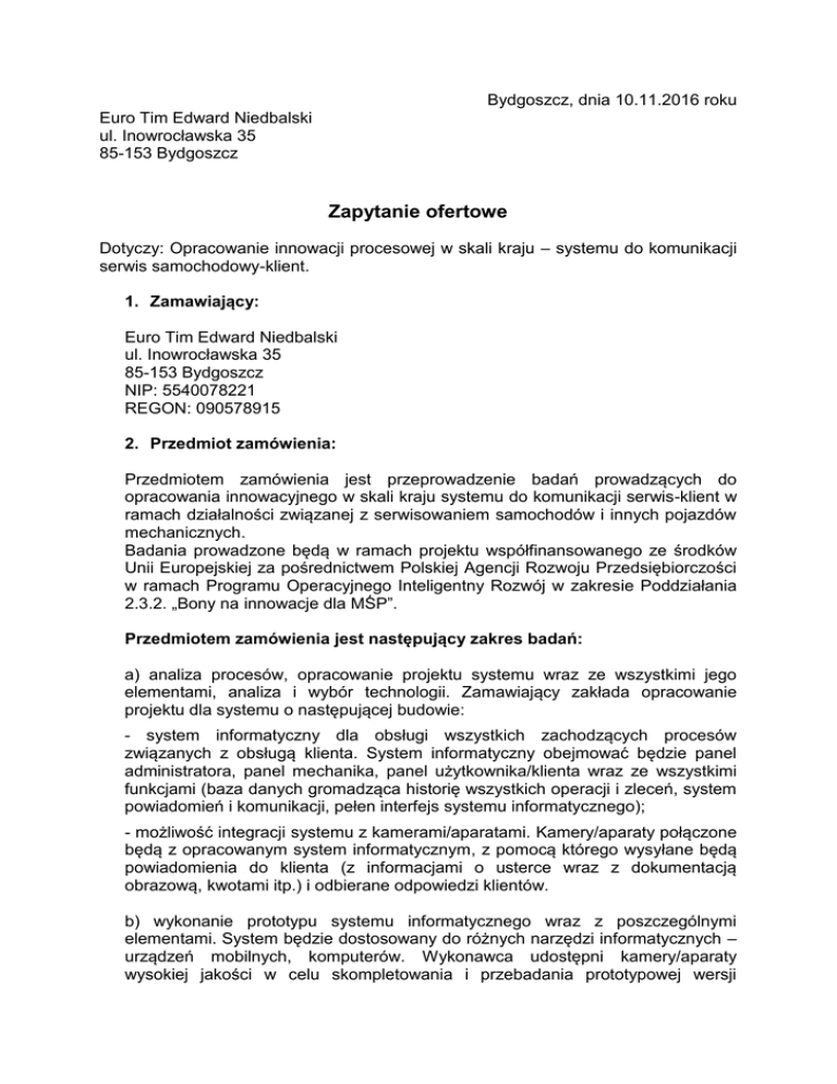 Bydgoszcz, dnia 10.11.2016 roku Euro Tim Edward Niedbalski ul. Inowrocławska 35 85-153 Bydgoszcz Zapytanie ofertowe Dotyczy: Opracowanie innowacji procesowej w skali kraju – systemu do komunikacji serwis samochodowy-klient. 1. Zamawiający: Euro Tim Edward Niedbalski ul. Inowrocławska 35 85-153 Bydgoszcz NIP: 5540078221 REGON: 090578915 2. Przedmiot zamówienia: Przedmiotem zamówienia jest przeprowadzenie badań prowadzących do opracowania innowacyjnego w skali kraju systemu do komunikacji serwis-klient w ramach działalności związanej z serwisowaniem samochodów i innych pojazdów mechanicznych. Badania prowadzone będą w ramach projektu współfinansowanego ze środków Unii Europejskiej za pośrednictwem Polskiej Agencji Rozwoju Przedsiębiorczości w ramach Programu Operacyjnego Inteligentny Rozwój w zakresie Poddziałania 2.3.2. „Bony na innowacje dla MŚP”. Przedmiotem zamówienia jest następujący zakres badań: a) analiza procesów, opracowanie projektu systemu wraz ze wszystkimi jego elementami, analiza i wybór technologii. Zamawiający zakłada opracowanie projektu dla systemu o następującej budowie: - system informatyczny dla obsługi wszystkich zachodzących procesów związanych z obsługą klienta. System informatyczny obejmować będzie panel administratora, panel mechanika, panel użytkownika/klienta wraz ze wszystkimi funkcjami (baza danych gromadząca historię wszystkich operacji i zleceń, system powiadomień i komunikacji, pełen interfejs systemu informatycznego); - możliwość integracji systemu z kamerami/aparatami. Kamery/aparaty połączone będą z opracowanym system informatycznym, z pomocą którego wysyłane będą powiadomienia do klienta (z informacjami o usterce wraz z dokumentacją obrazową, kwotami itp.) i odbierane odpowiedzi klientów. b) wykonanie prototypu systemu informatycznego wraz z poszczególnymi elementami. System będzie dostosowany do różnych narzędzi informatycznych – urządzeń mobilnych, komputerów. Wykonawca udostępni kamery/aparaty wysokiej jakości w celu skompletowania i przebadania prototypowej wersji systemu oraz weryfikacji. Opracowany system posiadać będzie wszystkie docelowe funkcjonalności związane z komunikacją pomiędzy poszczególnymi stronami (klienci-użytkownicy-administratorzy), czy rejestrowaniem przebiegu prac remontowych zleconych firmie. Powstanie wstępna wersja interfejsu przeznaczona do weryfikacji w warunkach zamkniętych, tj. wyłącznie w obrębie firmy oraz jednostki naukowej, c) przeprowadzenie testów w warunkach zbliżonych do rzeczywistych systemu, służących weryfikacji wszystkich funkcjonalności systemu, obiegu informacji, poprawności magazynowania i udostępniania danych, przesyłania dokumentacji obrazowej z kamer/aparatów do systemu. Testy służyć będą zidentyfikowaniu wszystkich możliwych błędów w oprogramowaniu, komunikacji pomiędzy poszczególnymi elementami systemu i określeniu ostatecznych form poszczególnych funkcjonalności (np. forma przesyłania informacji, optymalna forma komunikacji, gromadzenia danych itp.). Testy planowane są na okres trzech miesięcy (prowadzenie testów, wprowadzanie poprawek do systemu), d) stworzenie wersji demonstracyjnej kompletnego systemu, wraz z docelowym interfejsem (wyglądem i funkcjonalnością dostosowany do założeń, łącznie z grafikami, komunikatami, możliwościami rejestracji itp.) oraz wdrożenie w określonej części działalności firmy – wersja demonstracyjna powinna objąć jedno stanowisko serwisowe. e) opracowanie założeń, instrukcji, wytycznych dotyczących skutecznego wdrożenia pełnego systemu do działalności firmy; f) przeprowadzenie testów w warunkach operacyjnych (wraz z identyfikacją wad i wprowadzaniem poprawek oraz modyfikacji) przez okres 4 miesięcy. 3. Zamawiający nie dopuszcza składania ofert częściowych. 4. Do udziału w postępowaniu ofertowym dopuszczone są następujące podmioty (ograniczenie związane z zasadami naboru w ramach Poddziałania 2.3.2 PO IR): jednostki naukowe w rozumieniu art. 2 pkt 9 ustawy z dnia 30 kwietnia 2010 r. o zasadach finansowania nauki: 1) podstawowe jednostki organizacyjne uczelni w rozumieniu statutów tych uczelni; 2) jednostki naukowe Polskiej Akademii Nauk w rozumieniu ustawy z dnia 30 kwietnia 2010 r. o Polskiej Akademii Nauk (Dz.U. z 2016 r. , poz. 572) 3) instytuty badawcze w rozumieniu ustawy z dnia 30 kwietnia 2010 r. o instytutach badawczych (Dz. U. z 2016 r. poz. 371); 4) międzynarodowe instytuty naukowe utworzone na podstawie odrębnych przepisów, działające na terytorium Rzeczypospolitej Polskiej; 5) Polska Akademia Umiejętności; inne jednostki organizacyjne niewymienione w pkt 1-5, będące organizacjami prowadzącymi badania i upowszechniającymi wiedzę w rozumieniu art. 2 pkt 83 rozporządzenia Komisji (UE) nr 651/2014; posiadające siedzibę na terytorium Rzeczypospolitej Polskiej oraz przyznaną kategorię naukową A+, A albo B, o której mowa w art. 42 ust. 3 ustawy o zasadach finansowania nauki. 6) 5. Sposób przygotowania oferty Oferta musi zawierać: Pieczątkę firmową oferenta Datę sporządzenia oferty Adres lub siedzibę oferenta, nr telefonu, nr NIP Osobę do kontaktu w sprawie oferty Cenę netto za wykonanie całego wskazanego zakresu badań; Cenę netto za wykonanie poszczególnych zadań wskazanych w zakresie; Wycenę materiałów i urządzeń, które zostaną zakupione przez Wykonawcę dla potrzeb realizacji zadania (jeżeli dotyczy); Oświadczenie o braku powiązań osobowych lub kapitałowych z Zamawiającym; Czytelny podpis oferenta. 6. Sposób, miejsce i termin składania ofert a. ofertę należy przesłać: pocztą elektroniczną na adres: [email protected]; b. Ostateczny termin składania ofert upływa 21.11.2016 roku, do godz. 16.00. c. Ocena ofert zostanie przeprowadzona w siedzibie Zamawiającego do dnia 23.11.2016 roku d. Oferent może przed upływem terminu składania ofert wycofać lub