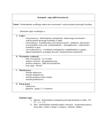 Konspekt zajęć piłki koszykowej . Temat : Doskonalenie szybkiego ataku oraz stworzenie i wykorzystanie przewagi liczebnej Założenia zajęć wynikające z : A. Celów : - cel poznawczy : doskonalenie umiejętności taktycznego stwarzania i wykorzystania przewagi liczebnej w ataku - cel kształcący : kształtowanie cech motorycznych : szybkości, skoczności, wytrzymałości oraz cech wolicjonalnych : nieustępliwości , waleczności , twardości w grze - cel wychowawczy : wyrobienie umiejętności współdziałania w grupie , odpowiedzialności za podjęte decyzje i bezpieczeństwo partnerów B. Warunków realizacji : - ilość ćwiczących : 12-16 osób - miejsce ćwiczeń : sala gimnastyczna - pomoce naukowe : piłki do koszykówki - czas zajęć : 90 min C. Metod pracy : - metoda zabawowa - metoda naśladowcza - metoda przekazywania wiedzy - metoda problemowa D. Form pracy : - całościowa - grupowa : grupy 2 i 3 osobowe Zadania zajęć : a. główne : doskonalenie rozegrania przewagi liczebnej w ataku 2:0 , 2:1 , 3:1 , 3:2 . b. inne : doskonalenie techniki podań i chwytów , kozłowania prawą i lewą ręką , rzutów z biegu i z miejsca , zbiórek z tablicy . Część zajęć Tok – układ działań Część -czynności organizacyjnowstępna porządkowe 15 min. -przygotowani obiektu i sprzętu -rozgrzewka -podział na pary Część główna 65 min. Tok działań - zadania Organizacja uwagi -sprawdzenie obiektu -sprawdzenie przygotowania młodzieży do zajęć -podanie zadań -rozmowa pod kierunkiem prowadzącego - z piłkami -ćwiczenia rozciągające wprowadzające do zabaw z piłkami -zabawa : kozłowanie piłki prawą i lewą ręką z wybijaniem jej przeciwnikowi poza teren zabawy -kozłowanie dwoma piłkami -rzuty w parach po 5 serii -korygowanie błędów i kontrola wykonania -doskonalenie umiejętności taktycznych i technicznych -podział na pary -doskonalenie orientacji przestrzennej -podania i chwyty w parach -nauka ataku szybkiego siłami 2 zawodników -atak szybki 2:0 bez kozłowania, raz z jednej raz z drugiej strony boiska ( rys. 1) -po 4 serie -3 serie po 20 podań -system ćwiczeń wahadłowy -atak szybki 2:1 po kozłowaniu -zawodnik, który ( rys. 2) będzie atakował w następnej kolejce staje się obrońcą -atak szybki z wykorzystaniem 3 zawodnika nie biorącego udziału w ataku : 1. stojącego na środku boiska ( rys. 3 ) 2. stojącego na skrzydle (rys.4) -jeżeli to konieczne udział prowadzącego -kontrola wykonania -zakończenie ataków dwójkowych -rzuty w seriach po 5 rzutów i 5 -przynajmniej 6 – zbiórek ze zmianą pozycji po 7 serii kozłowaniu i bez. -podział grupy na trójki -c.d. doskonalenia orientacji przestrzennej -podania w trójkach a. podania ze zmianą miejsca -po 20 podań (rys.5a) b. podania : -po 20 razy 1. do jednego zawodnika 2 -poprawa błędów piłkami ( rys.5 ) 2. po obwodzie 2 piłkami ( rys. 6 ) -nauka rozegrania ataku szybkiego siłami 3 zawodników -atak szybki 3:0 ze zmianami miejsc do końca akcji bez kozłowania ( rys. 7 ) -system ćwiczeń wahadłowy -podający idzie( biegnie) na miejsce kolegi , któremu podał piłkę , za jego plecami -atak szybki 3:0 z pojedynczą zmianą miejsc z kozłowaniem (rys.8) -zmiana tylko między środkowym ataku , a jednym ze skrzydłowych -atak 3:1 z pojedynczą zmianą miejsc ( rys. 9 ) -jeden z zawodników,który będzie atakował za moment, staje się obrońcą -atak 3:2 z pojedynczą zmianą miejsc ( rys. 10) -dwóch staje się obrońcami -doskonalenie zbiórki piłki z -zbiórka piłki z tablicy poprzez tablicy ćwiczenie zwane ‘’ deską ‘’ , czyli złapanie piłki w powietrzu i odbicie jej o tablice -ćwiczenia uspokajające -gra kontrolna -w dwóch rzędach po odbiciu bieg w prawą lub lewą stronę zawsze do linii bocznej -rzuty osobiste w seriach , po 3 - 10 serii rzuty -podział na dwie drużyny -sędziowanie przez prowadzącego Część -ćwiczenia oddechowe końcowa 10 min. -omówienie zajęć -ćwiczenia korekcyjne według własnych potrzeb zawodników -rzuty osobiste lub z miejsca -pożegnanie Omówienie : Atak szybki jest tylko jednym z wielu elementów gry i nauczania go , czy próba wprowadzania nie jest przypadkowa i powinna opierać się na gruntownych przygotowaniach uznanych powszechnie za podstawowe w koszykówce . Do nich zaliczamy : - widzenie obwodowe , - reakcje proste i złożone ( min. elementy stresogenne ), - zastawienie przeciwnika i zebranie piłki z tablicy, - umiejętność wyjścia do podania , - atut pierwszego podania , - zasady poruszania się po boisku ( pasy ruchu i strefy ) , - umiejętność rozegrania akcji 2:1 , 3:1 , 3:2 , - umiejętność oddania rzutu w pełnym biegu , - zmiana miejsc pod koszem – podanie do wbiegającego , - wycofanie piłki na obwód , - nauka wyprowadzania szybkiego ataku od rzutu osobistego przeciwnika , Literatura . 1. Tadeusz Huciński , Vademecum koszykówki , Warszawa 1996.COS Resortowe Centrum Metodyczno-Szkoleniowe Kultury Fizycznej . 2. Stefan Alfonsi , Koszykówka , Warszawa 2001 , Muza S.A. 3. Czesław Sieniek , Metodyka nauczania taktyki w koszykówce , Starachowice 1998,Pracownia Wydawnicza Helvetica . 4. Andrzej Rumiński , Atak szybki w koszykówce – podstawy , Lider nr 4 z 1999 roku . Opracował : mgr Mirosław Zagórski