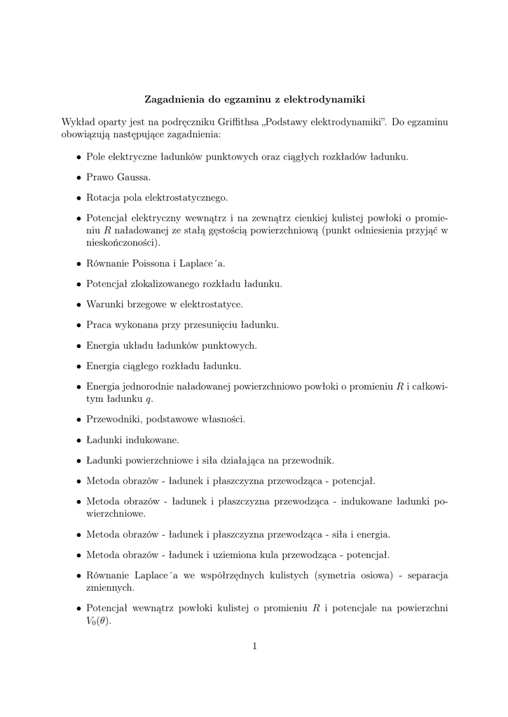 Zagadnienia do egzaminu z elektrodynamiki Wykład oparty jest na podręczniku Griffithsa „Podstawy elektrodynamiki”. Do egzaminu obowiązują następujące zagadnienia: • Pole elektryczne ładunków punktowych oraz ciągłych rozkładów ładunku. • Prawo Gaussa. • Rotacja pola elektrostatycznego. • Potencjał elektryczny wewnątrz i na zewnątrz cienkiej kulistej powłoki o promieniu R naładowanej ze stałą gęstością powierzchniową (punkt odniesienia przyjąć w nieskończoności). • Równanie Poissona i Laplace´a. • Potencjał zlokalizowanego rozkładu ładunku. • Warunki brzegowe w elektrostatyce. • Praca wykonana przy przesunięciu ładunku. • Energia układu ładunków punktowych. • Energia ciągłego rozkładu ładunku. • Energia jednorodnie naładowanej powierzchniowo powłoki o promieniu R i całkowitym ładunku q. • Przewodniki, podstawowe własności. • Ładunki indukowane. • Ładunki powierzchniowe i siła działająca na przewodnik. • Metoda obrazów - ładunek i płaszczyzna przewodząca - potencjał. • Metoda obrazów - ładunek i płaszczyzna przewodząca - indukowane ładunki powierzchniowe. • Metoda obrazów - ładunek i płaszczyzna przewodząca - siła i energia. • Metoda obrazów - ładunek i uziemiona kula przewodząca - potencjał. • Równanie Laplace´a we współrzędnych kulistych (symetria osiowa) - separacja zmiennych. • Potencjał wewnątrz powłoki kulistej o promieniu R i potencjale na powierzchni V0 (θ). 1 • Potencjał na zewnątrz powłoki kulistej o promieniu R i potencjale na powierzchni V0 (θ). • Potencjał od nienaładowanej kuli metalowej o promieniu R umieszczonej w zewnętrznym polu elektrycznym. • Potencjał wewnątrz i na zewnątrz kulistej powłoki o promieniu R naładowanej ładunkiem powierzchniowym σ0 (θ). • Rozwinięcie multipolowe - przybliżona postać potencjału na dużych odległościach. • Rozwinięcie multipolowe - człony monopolowy i dipolowy. • Rozwinięcie multipolowe - problem początku układu współrzędnych. • Rozwinięcie multipolowe - natężenie pola elektrycznego dipola. • Indukowany moment dipolowy atomów i cząsteczek. • Zmiana orientacji momentów dipolowych cząsteczek polarnych. • Pole ciała spolaryzowanego - ładunki związane. • Pole jednorodnie spolaryzowanej kuli o promieniu R. • Prawo Gaussa w obecności dielektryka. • Pole indukcji elektrycznej - warunki brzegowe. • Dielektryki liniowe - podatność elektryczna i przenikalność elektryczna. • Metalowa kula o promieniu a naładowana została ładunkiem Q. Kula otoczona jest powłoką z dielektryka o przenikalności elektrycznej ; promień powłoki wynosi b. Znaleźć różnicę potencjałów między środkiem kuli i punktem w nieskończoności. • Dielektryki liniowe - kula dielektryczna w zewnętrznym polu elektrycznym. • Dielektryki liniowe - energia w układach z dielektrykami. • Siła Lorentza - ruch cyklotronowy. • Siła Lorentza - ruch po cykloidzie. • Prady - gęstości prądów - równanie ciągłości. • Prawo Biota-Savarta. • Pole magnetyczne liniowego prądu stałego. • Pole magnetyczne kołowej pętli z prądem. 2 • Prądy prostoliniowe - prawo Amp‘ere´a. ~ • Prawo Biota-Savarta - dywergencja B. • Zastosowania prawa Amp‘ere´a - indukcja pola magnetycznego w odległości s od prostoliniowego przewodnika, w którym płynie prąd o natężeniu I. • Magnetyczny potencjał wektorowy. • Magnetostatyczne warunki brzegowe. • Multipolowe rozwiniecie potencjału wektorowego. • Siły i momenty sił działających na dipole magnetyczne. • Wpływ pola magnetycznego na orbity atomowe. • Pole namagnesowanego ciała - prądy związane. • Pole magnetyczne jednorodnie namagnesowanej kuli. • Fizyczna interpretacja prądów związanych. • Prawo Amp‘ere´a w materiałach magnetycznych. ~ • Warunki brzegowe dla pola H. • Prawo Ohma. • SEM przewodnika poruszającego się w polu magnetycznym • Prawo Faradaya. • Prawo Faradaya - indukowane pole elektryczne. • Indukcyjność. • Energia pola magnetycznego. • Jak Maxwell poprawił prawo Amp‘ere´a. • Równania Maxwella. • Równania Maxwella w materii. • Równania Maxwella w postaci całkowej - warunki brzegowe. • Twierdzenie Poyntinga. • Tensor napięć Maxwella. 3 • Pęd pola elektromagnetycznego - zasada zachowania pędu. • Fale w jednym wymiarze. • Polaryzacja fali. ~ i B. ~ • Fale elektromagnetyczne w próżni - równania falowe dla E • Fale elektromagnetyczne w próżni - fale monochromatyczne płaskie. • Energia i pęd fal elektromagnetycznych. • Fale elektromagnetyczne w ośrodku materialnym —- rozchodzenie się fal w ośrodkach liniowych. • Prawa odbicia i załamania dla fal elektromagnetycznych. • Kąt Brewstera i całkowite wewnętrzne odbicie. • Równania Fresnela dla polaryzacji równoległej do płaszczyzny padania. • Równania Fresnela dla polaryzacji prostopadłej do płaszczyzny padania. • Fale elektromagnetyczne w przewodnikach. • Odbicie na powierzchni przewodzącej. • Zależność przenikalności elektrycznej od częstości. • Potencjały i pola źródeł zmiennych w czasie — potencjały skalarny i wektorowy. • Cechowanie Coulomba i Lorentza. • Potencjały opóźnione. • Promieniowanie elektryczne dipolowe. 4