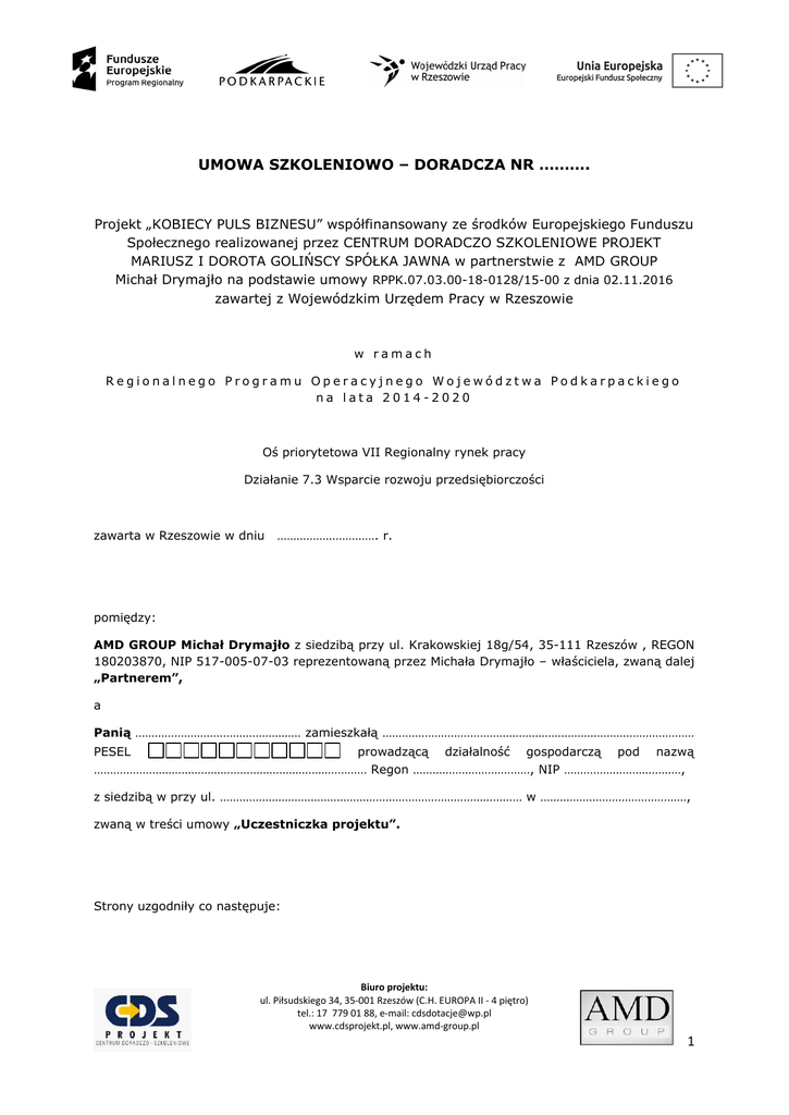 UMOWA SZKOLENIOWO – DORADCZA NR ………. Projekt „KOBIECY PULS BIZNESU” współfinansowany ze środków Europejskiego Funduszu Społecznego realizowanej przez CENTRUM DORADCZO SZKOLENIOWE PROJEKT MARIUSZ I DOROTA GOLIŃSCY SPÓŁKA JAWNA w partnerstwie z AMD GROUP Michał Drymajło na podstawie umowy RPPK.07.03.00-18-0128/15-00 z dnia 02.11.2016 zawartej z Wojewódzkim Urzędem Pracy w Rzeszowie w ramach Regionalnego Programu Operacyjnego Województwa Podkarpackiego na lata 2014-2020 Oś priorytetowa VII Regionalny rynek pracy Działanie 7.3 Wsparcie rozwoju przedsiębiorczości zawarta w Rzeszowie w dniu …………………………. r. pomiędzy: AMD GROUP Michał Drymajło z siedzibą przy ul. Krakowskiej 18g/54, 35-111 Rzeszów , REGON 180203870, NIP 517-005-07-03 reprezentowaną przez Michała Drymajło – właściciela, zwaną dalej „Partnerem”, a Panią …………………………………………… zamieszkałą …………………………………………………………………………………… PESEL prowadzącą działalność gospodarczą pod nazwą ………………………………………………………………………… Regon ………………………………, NIP ………………………………, z siedzibą w przy ul. ………………………………………………………………………………… w ………………………………………, zwaną w treści umowy „Uczestniczka projektu”. Strony uzgodniły co następuje: Biuro projektu: ul. Piłsudskiego 34, 35-001 Rzeszów (C.H. EUROPA II - 4 piętro) tel.: 17 779 01 88, e-mail: [email protected] www.cdsprojekt.pl, www.amd-group.pl 1 §1 Przedmiot umowy 1. Przedmiotem niniejszej Umowy jest udzielenie przez Partnera wsparcia w formie nieodpłatnych usług szkoleniowo – doradczych dotyczących zagadnień związanych z podejmowaniem i prowadzeniem działalności gospodarczej. 2. Wsparcie w formie nieodpłatnych usług szkoleniowo-doradczych odbywa się na podstawie i zgodnie z założeniami opisanego powyżej projektu „KOBIECY PULS BIZNESU”. 3. Wsparcie będące przedmiotem niniejszej Umowy udzielane jest w zakresie objętym diagnozą potrzeb szkoleniowych Uczestniczki Projektu. 4. Uczestniczka projektu otrzymuje wsparcie szkoleniowo-doradcze na zasadach i warunkach określonych w niniejszej Umowie. §2 Obowiązki uczestnika projektu 1. Uczestniczka projektu przyjmuje wsparcie szkoleniowo – doradcze i zobowiązuje się do pełnego zaangażowania i aktywnego uczestnictwa we wszystkich zajęciach indywidualnych i grupowych objętych umową. 2. Uczestniczka projektu oświadcza, że zapoznała się z założeniami Projektu oraz z Regulaminem rekrutacji i uczestnictwa projektu. 3. Uczestniczka projektu zobowiązuje się do podpisywania list obecności na zajęciach szkoleniowych, kart doradczych oraz list odbioru poczęstunku, list odbioru materiałów szkoleniowych, a także do wypełniania ankiet ewaluacyjnych oraz innych dokumentów i formularzy związanych z wymaganiami opisanego powyżej projektu, przedkładanych Uczestniczce projektu przez Partnera. §3 Okres udzielania wsparcia szkoleniowo – doradczego 1. Wsparcie szkoleniowo-doradcze udzielane jest w okresie rzeczowej realizacji Projektu, tj. od dnia podpisania niniejszej umowy do dnia ………………………………………. §4 Wsparcie szkoleniowo-doradcze – postanowienia szczegółowe 1. Wsparcie szkoleniowo – doradcze nie jest objęte regułami dotyczącymi udzielania pomocy publicznej. 2. Szkolenia oraz doradztwo mają na celu uzyskanie wiedzy i umiejętności potrzebnych Uczestniczce projektu do założenia i prowadzenia działalności gospodarczej. 3. Uczestniczka projektu zobowiązana jest do wzięcia udziału w następujących formach wsparcia: a) Diagnoza indywidualnych potrzeb szkoleniowo – doradczych w wymiarze 2 godz. Raport opracowany przez doradcę zawodowego określający poziom wiedzy i umiejętności Uczestniczek projektu, indywidualne potrzeby Uczestniczek projektu wskazujące obszary do rozwoju i adekwatny zakres wsparcia, b) Szkolenie: Jak założyć i prowadzić własną działalność gospodarczą w wymiarze 27 godz. Ramowy program: regulacje prawne zakładania i prowadzenia firmy, podejmowanie i prowadzenie działalności gospodarczej, źródła finansowania Biuro projektu: ul. Piłsudskiego 34, 35-001 Rzeszów (C.H. EUROPA II - 4 piętro) tel.: 17 779 01 88, e-mail: [email protected] www.cdsprojekt.pl, www.amd-group.pl 2 działalności gospodarczej, podstawy księgowości, podstawy marketingu, prawo pracy, prawo podatkowe, ubezpieczenia społeczne. c) Warsztaty pisania biznes planu w wymiarze 22 godz. Praca warsztatowa nad opracowaniem biznesplanu i jego poszczególne części: struktura biznesplanu, działania marketingowe jako element biznesplanu, plan działania firmy, aspekty finansowe biznesplanu, praktyczne aspekty związane z opracowaniem biznesplanu ( najczęściej popełniane błędy i analiza przykładowych biznesplanów – studium przypadku) d) Indywidulane doradztwo biznesowe wymiarze 6 godz. Wsparcie w zakresie indywidualnych kwestii opracowania biznesplanu oraz planowania, zarządzania i rozwijania firmy. 4. Liczba godzin usług szkoleniowych lub doradczych świadczona na rzecz Uczestniczki projektu potwierdzona jest podpisem Uczestniczki projektu złożonym w dniu skorzystania z usługi. 5. Podstawowym kryterium starania się o pomoc finansową oferowaną w projekcie będzie ukończenie szkolenia z zakładania oraz prowadzenia działalności gospodarczej i warsztatów z zakresu pisania biznesplanu z absencją nie przekraczającą 20 % oraz skorzystanie z doradztwa indywidualnego. Nieobecność na szkoleniach z absencją przekraczającą % lub nieskorzystanie z doradztwa będzie równoznaczna z rezygnacją z udziału w projekcie. 6. Daty przeprowadzenia szkoleń oraz doradztwa wskazuje Partner. §5 Zmiana Umowy 1. Wszelkie zmiany Umowy wyma
