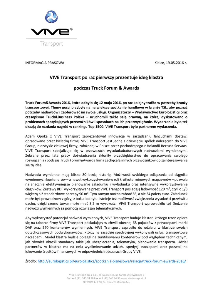 INFORMACJA PRASOWA Kielce, 19.05.2016 r. VIVE Transport po raz pierwszy prezentuje ideę klastra podczas Truck Forum & Awards Truck Forum&Awards 2016, które odbyło się 12 maja 2016, po raz kolejny trafiło w potrzeby branży transportowej. Tłumy gości przybyły na największe spotkanie handlowe w branży TSL, aby poznać potrzeby nadawców i zaoferować im swoje usługi. Organizatorzy – Wydawnictwo Eurologistics oraz czasopismo Truck&Business Polska – uruchomili także salę prawną, na której dyskutowano o problemach spotykających przewoźników i sposobach na ich przezwyciężanie. Wydarzenie było też okazją do rozdania nagród w rankingu Top 1500. VIVE Transport było partnerem wydarzenia. Adam Opoka z VIVE Transport zaprezentował innowacje w zarządzaniu łańcuchami dostaw, opracowane przez kielecką firmę. VIVE Transport jest jedną z dziewięciu spółek należących do VIVE Group, niezwykle ciekawej firmy, założonej w Polsce przez pochodzącego z Holandii Bertusa Servaas. VIVE Transport specjalizuje się w przewozach wysokokubaturowych nadwoziami wymiennymi. Zebrane przez lata pracy doświadczenia skłoniły przedsiębiorstwo do opracowania swojego rozwiązania i podczas Truck Forum&Awards firma zachęcała innych przewoźników do zainteresowania się tą ideą. Nadwozia wymienne mają blisko 80-letnią historię. Możliwość szybkiego odłączania od ciągnika wymiennych kontenerów – a nawet wykorzystywanie w roli krótkoterminowych magazynów – pozwala na znacznie efektywniejsze planowanie załadunku i wyładunku oraz intensywne wykorzystywanie ciągników. Zestawy BDF wykorzystywane przez VIVE Transport posiadają ładowność 120 m3, czyli o 1/3 większą niż standardowe naczepy 90 m3. Tym samym można zabrać 38, a nie 34 palety euro. Załadunek może być prowadzony z góry, z boku i od tyłu. Istnieje też możliwość zwiększenia wysokości prześwitu dachu, dzięki czemu towar może mieć 3,2 m wysokości. VIVE Transport wprowadziło też śledzenie nadwozi wymiennych za pomocą rozwiązań telematycznych. Aby wykorzystać potencjał nadwozi wymiennych, VIVE Transport buduje klaster, którego trzon opiera się na taborze firmy VIVE Transport posiadający w chwili obecnej 68 pojazdów z przyczepami marki DAF oraz 570 kontenerów wymiennych. VIVE Transport zaprosiło do udziału w klastrze swoich dotychczasowych podwykonawców, którzy na zasadzie spedycyjnej wykonywali usługi transportowe naczepami. Model klastra będzie polegał na zunifikowaniu kontenerów pod względem technicznym, jak również określi standardy takie jak ubezpieczenia, telematyka, planowanie transportu. Udział partnerów w klastrze ma na celu wyeliminowanie udziału spedycji naczepami oraz pozwoli na lokowanie środków finansowych w odpowiednich obszarach Grupy VIVE. Źródło: http://eurologistics.pl/eurologistics/spotkania-biznesowe/relacje/truck-forum-awards-2016/ VIVE Transport Sp. z o.o., 25-663 Kielce, ul. Karola Olszewskiego 6 Tel. +48 (41) 345 74 98 Fax +48 (41) 345 74 96 www.vivetransport.pl NIP: 959-174-48-71, REGON: 260103201 Kontakt dla mediów: Ewelina Rozpara, Manager ds. PR i Projektów Marketingowych tel. +48 (41) 347 63 50 wew. 269 kom. 723 184 218 [email protected] VIVE Transport Jedno z największych na polskim rynku prywatnych przedsiębiorstw transportowo-spedycyjnych, specjalizujące się w przewozach wysokokubaturowych nadwoziami wymiennymi. Do jego klientów należą wiodące polskie i zagraniczne przedsiębiorstwa z branży automotive, opakowań, AGD, meblarskiej, materiałów izolacyjnych i przetwórstwa drzewnego. VIVE Transport dysponuje 68 zestawami wysokokubaturowymi oraz 570 nadwoziami wymiennymi typu BDF. Posiadana przez firmę flota składa się z pojazdów marki DAF i IVECO, nie starszych niż 2 letnie. Wszystkie pojazdy i nadwozia wymienne monitorowane są w systemie GPS TRANSICS zintegrowanym z systemem ERP Speed i prowadzone w załogach dwuosobowych. Głównymi kierunkami działalności przewozowej spółki są: Niemcy, Szwajcaria, Dania, Holandia, Belgia, Francja i Czechy. Grupa VIVE Lider w dziedzinie recyklingu tekstyliów (zbiórki, import, sortowanie, eksport i sprzedaż detaliczna odzieży sortowanej oraz przerób niesprzedawalnego produktu na czyściwo przemysłowe i poszukiwanie innowacyjnych możliwości przetwarzania surowca). W skład grupy wchodzą: VIVE Textile Recycling, VIVE Transport, VIVE Profit Center, VIVE Properties, VIVE Biznes, VIVE Innovation, Dimatex, Eco-Collections, VIVE Properties, VIVE Creation, a także podmioty zależne: Klub Sportowy VIVE Tauron Kielce i Fundacja VIVE Serce Dzieciom. VIVE Transport Sp. z o.o., 25-663 Kielce, ul. Karola Olszewskiego 6 Tel. +48 (41) 345 74 98 Fax +48 (41) 345 74 96 www.vivetransport.pl NIP: 959-174-48-71, REGON: 260103201