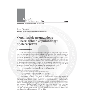 714 2006 Akademii Ekonomicznej w Krakowie Jerzy Hausner Katedra Gospodarki i Administracji Publicznej Organizacje pozarządowe – trzeci sektor współczesnego społeczeństwa 1. Wprowadzenie Cechą nowoczesnego zarządzania publicznego jest przejrzyste współdziałanie i partnerstwo sektora publicznego z sektorem prywatnym oraz organizacjami pozarządowymi. Kwestię tę dobrze obrazuje rys. 1. Przedstawiony na rysunku układ zależności pozwala uznać, że pozarządowe (non-governmental organizations – ngos) i nie nastawione na zysk (non-profit) organizacje (które ogólnie nazywać będziemy organizacjami społecznymi) stanowią trzeci sektor współczesnego społeczeństwa. O skali tego sektora najlepiej świadczy to, że przeciętnie w krajach OECD (w połowie lat 90.) operacyjne wydatki sektora organizacji społecznych sięgały 4,6% PKB. Znaczący jest też w nim poziom zatrudnienia [Koźlicka 2000, s. 15]: – 5% całkowitego zatrudnienia pozarolniczego, – 27% całkowitego zatrudnienia w sektorze publicznym, a z uwzględnieniem wolontariuszy: – 7% całkowitego zatrudnienia pozarolniczego, – 14% całkowitego zatrudnienia w sektorze usług, – 41% całkowitego zatrudnienia w sektorze publicznym. Z początkiem lat 90. w USA liczba osób świadczących dobrowolną i nieodpłatną pracę w organizacjach społecznych w wymiarze co najmniej 4 godz. tygodniowo wynosiła prawie 100 mln, czyli ok. 50% dorosłej ludności. Odpowiadało to liczbie ok. 3 mln etatów. Gdyby te organizacje miały zatrudnić taką liczbę pracowników, musiałyby wydatkować ponad 50 mld USD rocznie. Trzeci sektor obejmował wówczas w Stanach Zjednoczonych 51% wszystkich szpitali i 56% wszystkich łóżek szpitalnych, a także 49% szkół wyższych [Kowalak 1999, s. 38]. W Niemczech w tym samym okresie ok. 60% usług społecznych dostarczały organizacje trzeciego sektora [Angerhausen 1999, s. 121]. 6 Jerzy Hausner Państwo (hierarchia i kontrola) Organizacje pracodawców, związki zawodowe, stowarzyszenia zawodowe Organizacje społeczne Sektor prywatny (działalność dochodowa i konkurencyjna) Prywatne organizacje charytatywne Społeczeństwo obywatelskie (wskazanie interesów (voice) i działania zbiorowe) Rys. 1. Organizacje na styku państwa, rynków i społeczeństwa obywatelskiego Źródło: [The State..., 1997, s. 116]. W Polsce liczbę organizacji społecznych oszacowano w 1998 r. na 18,5–48 tys. Zatrudnienie w sektorze pozarządowym sięga 1–1,4% zatrudnienia ogólnego, a na jednego zatrudnionego przypada 10 wolontariuszy [Głogosz, Strzemińska 1999, s. 175]. Rozwój trzeciego sektora i organizacji go tworzących jest wspierany przez wszystkie liczące się orientacje doktrynalno-polityczne występujące w krajach demokratycznych (socjaldemokratyczną, liberalną, chadecką). Każda z nich znajduje w nim w jakimś stopniu możliwości rozwiązywania najtrudniejszych kwestii społecznych [Peters 1996]. Każda z nich też w jakiejś mierze opowiada się za przyjęciem za jedną z podstaw ładu społecznego zasady subsydiarności (pomocniczości państwa), co w przypadku przedmiotu tego artykułu oznacza: „stworzenie mechanizmu przekazywania organizacjom pozarządowym zadań publicznych, które te organizacje mogą skutecznie wykonywać bez pozbawiania władz publicznych przypisanej im odpowiedzialności” [Woźniak 1999, s. 258]. Nie oznacza to, że w podejściu do trzeciego sektora nie ma między tymi orientacjami zasadniczych różnic, a funkcjonowanie i rozwój organizacji społecznych przebiega bezproblemowo. Przedmiotem niniejszego artykułu jest właśnie omówienie tych różnic i problemów. Organizacje pozarządowe – trzeci sektor współczesnego społeczeństwa 7 2. Teoretyczne podstawy rozwoju i funkcjonowania organizacji społecznych i trzeciego sektora Teoretyczne podstawy działania organizacji pozarządowych przedstawiła S. Golinowska [1999], odnosząc je do trzech dyscyplin nauki – ekonomii, socjologii oraz nauk politycznych. Ujęcie ekonomiczne. Organizacje non-profit sytuują się między państwem a rynkiem i mają charakter instytucji uzupełniających, ale nie alternatywnych. Rynek i państwo są zawodne w pewnych obszarach i są to w zasadzie obszary wspólne. Po pierwsze, rynek nie zaspokaja najlepiej potrzeb słabszych konsumentów, a państwo – słabszych wyborców. Po drugie, rynek nie wytwarza dóbr publicznych, a państwo wytwarza je często niezgodnie z preferencjami i(lub) nieefektywnie. Te dwie tezy wyznaczają zakres działania organizacji non-profit. Ekonomiczna przewaga tych organizacji w wykonywaniu pewnych usług publicznych wynika ze specjalizacji w przypadkach nietypowych, niskich kosztów na skutek pracy wolontariuszy i samoograniczenia menedżerów w wysokości płacy oraz zasilania finansowego przez darczyńców. Ujęcie socjologiczne. Podstawą formowania się organizacji społecznych jest wolność i swobody obywatelskie, w tym prawo do zrzeszania się. Tym samym występowanie tych organizacji jest przejawem działania społeczeństwa obywatelskiego, które sytuuje się między jednostką nastawioną na cele indywidualne (prywatne) a państwem – ukierunkowanym na cele w skali makro. Kapitał społeczny – według R. Putnama [1993] – jest efektem współdziałania jednostek w ramach organizacji społecznych. Subsydiarność zaś polega na budowaniu stosunków społecznych „od dołu ku górze”, od jednostki do państwa. Ujęcie pod kątem nauk politycznych. Organizacje pozarządowe jako trzon społeczeństwa obywatelskiego są zarówno zapleczem, jak i weryfikatorem oraz społecznym kontrolerem działalności partii politycznych i szerzej – aktywności politycznej. Określenie teoretycznych podstaw funkcjonowania trzeciego sektora nieuchronnie wiąże się z przyjęciem jakiejś koncepcji (wizji) społeczeństwa. Dwie konkurujące ze sobą współcześnie wizje społeczeństwa – rynkową oraz demokratycznego państwa opieku