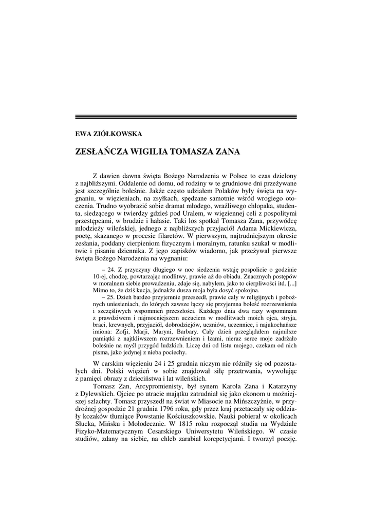 EWA ZIÓŁKOWSKA ZESŁAŃCZA WIGILIA TOMASZA ZANA Z dawien dawna święta Bożego Narodzenia w Polsce to czas dzielony z najbliższymi. Oddalenie od domu, od rodziny w te grudniowe dni przeżywane jest szczególnie boleśnie. Jakże często udziałem Polaków były święta na wygnaniu, w więzieniach, na zsyłkach, spędzane samotnie wśród wrogiego otoczenia. Trudno wyobrazić sobie dramat młodego, wrażliwego chłopaka, studenta, siedzącego w twierdzy gdzieś pod Uralem, w więziennej celi z pospolitymi przestępcami, w brudzie i hałasie. Taki los spotkał Tomasza Zana, przywódcę młodzieży wileńskiej, jednego z najbliższych przyjaciół Adama Mickiewicza, poetę, skazanego w procesie filaretów. W pierwszym, najtrudniejszym okresie zesłania, poddany cierpieniom fizycznym i moralnym, ratunku szukał w modlitwie i pisaniu dziennika. Z jego zapisków wiadomo, jak przeżywał pierwsze święta Bożego Narodzenia na wygnaniu: – 24. Z przyczyny długiego w noc siedzenia wstaję pospolicie o godzinie 10-ej, chodzę, powtarzając modlitwy, prawie aż do obiadu. Znacznych postępów w moralnem siebie prowadzeniu, zdaje się, nabyłem, jako to cierpliwości itd. [...] Mimo to, że dziś kucja, jednakże dusza moja była dosyć spokojna. – 25. Dzień bardzo przyjemnie przeszedł, prawie cały w religijnych i pobożnych uniesieniach, do których zawsze łączy się przyjemna boleść rozrzewnienia i szczęśliwych wspomnień przeszłości. Każdego dnia dwa razy wspominam z prawdziwem i najmocniejszem uczuciem w modlitwach moich ojca, stryja, braci, krewnych, przyjaciół, dobrodziejów, uczniów, uczennice, i najukochańsze imiona: Zofji, Marji, Maryni, Barbary. Cały dzień przeglądałem najmilsze pamiątki z najtkliwszem rozrzewnieniem i łzami, nieraz serce moje zadrżało boleśnie na myśl przygód ludzkich. Liczę dni od listu mojego, czekam od nich pisma, jako jedynej z nieba pociechy. W carskim więzieniu 24 i 25 grudnia niczym nie różniły się od pozostałych dni. Polski więzień w sobie znajdował siłę przetrwania, wywołując z pamięci obrazy z dzieciństwa i lat wileńskich. Tomasz Zan, Arcypromienisty, był synem Karola Zana i Katarzyny z Dylewskich. Ojciec po utracie majątku zatrudniał się jako ekonom u możniejszej szlachty. Tomasz przyszedł na świat w Miasocie na Mińszczyźnie, w przydrożnej gospodzie 21 grudnia 1796 roku, gdy przez kraj przetaczały się oddziały kozaków tłumiące Powstanie Kościuszkowskie. Nauki pobierał w okolicach Słucka, Mińsku i Mołodecznie. W 1815 roku rozpoczął studia na Wydziale Fizyko-Matematycznym Cesarskiego Uniwersytetu Wileńskiego. W czasie studiów, zdany na siebie, na chleb zarabiał korepetycjami. I tworzył poezję. 4 EWA ZIÓŁKOWSKA To on napisał pierwsze ballady: Twardowski i Świteź jezioro. Spod jego pióra wyszła krotochwila Gryczane pierożki, wiersze okolicznościowe, poematy oraz, szczególnie wówczas modne, jamby i triolety. Wielką niespełnioną miłością Zana była Maryla Wereszczakówna, co nieomal zniweczyło jego przyjaźń z Adamem. Tomasz Zan mocno zaangażował się w sprawy stowarzyszeń studenckich. Był współzałożycielem, powołanego w 1817 roku, Towarzystwa Filomatów stawiającego sobie za cel „ćwiczenia naukowe, udzielanie wzajemnej w naukach pomocy”. Wiosną 1820 roku utworzył Zgromadzenie Przyjaciół Pożytecznej Zabawy, czyli Towarzystwo Promienistych. Stanął również na czele, liczącego ponad dwustu członków, ściśle już tajnego Towarzystwa Filaretów. Ponadto był organizatorem związku Filadelfistów Błękitnych, należał do wileńskiej gminy Towarzystwa Patriotycznego i Towarzystwa Szubrawców. Zan był młodzieńcem o niezwykle wrażliwej naturze, koledzy nawet zarzucali mu nadmierną uczuciowość. Dobrocią, otwartością i niezłomnością charakteru zyskał sobie z czasem sympatię i wielki autorytet wśród młodzieży wileńskiej, stając się jej charyzmatycznym przywódcą. On pierwszy serca swego słodkiemi przymioty Przyciągnął nas za sobą, a szedł drogą cnoty. Bawiąc się z nim – wspólnyśmy żywot polubili Wśród igraszek – wielkieśmy rzeczy umyślili. – pisał o Zanie Jan Czeczot Owe „wielkie rzeczy” okazały się być niebezpieczne dla carskiego aparatu władzy. Do Wilna zjechał senator Nowosilcow, aby osobiście zająć się śledztwem. Zan aresztowany nocą z 23 na 24 października 1823 roku, jako jedyny osadzony został w więzieniu na Łukiszkach, pozostałych ponad stu oskarżonych trzymano w celach klasztornych. W śledztwie, aby ratować przyjaciół, cały ciężar winy wziął na siebie. W III części „Dziadów” Tomasz mówi: Ja stałem na waszego towarzystwa czele, Mam obowiązek cierpieć za was, przyjaciele... Wydano na niego najwyższy wyrok, skazany został na rok więzienia i bezterminowe zesłanie w głąb Rosji. Karę odbywał w twierdzy Kizył, po zwolnieniu mieszkał w Orenburgu, gdzie był guwernerem, próbował zajmować się tłumaczeniami, twórczością literacką, korespondował z rodziną i przyjaciółmi. Uczestniczył też w pracach orenburskiej Komisji Granicznej, dzięki czemu mógł brać udział w licznych ekspedycjach naukowych, prowadzić badania geologiczne Uralu i zbierać minerały. Przyczynił się do utworzenia w Orenburgu muzeum geologiczno-przyrodniczego. Po trzynastoletniej zsyłce i uzyskaniu prawa wyjazdu w 1837 roku, udał się nad Newę. Jego biografowie odnotowują, że „ciężka choroba i trudności finansowe spowodowały, że do kraju wrócił dopiero w roku 1841”. Wspomnienia rodzinne przechowały bardziej optymistyczną wersję wydarzeń: „We wrześniu 1837 roku Promienisty poprosił o dymisję z państwowej posady w muzeum orenburskim i wyruszył w drogę do Ojczyzny. Zimę postanowił przeczekać w Petersburgu, a ponieważ skończyły się pieniądze, podjął intratną posadę bibliotekarza w instytucie inżynierów górniczych, gdzie pracował pra