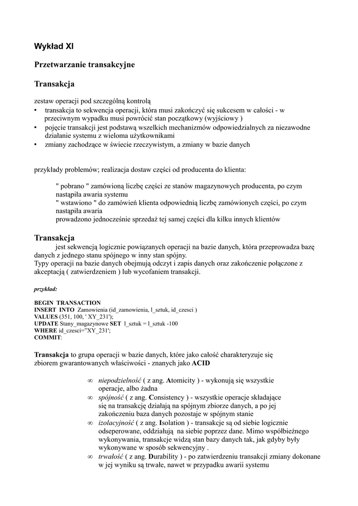 Wykład XI Przetwarzanie transakcyjne Transakcja Transakcja