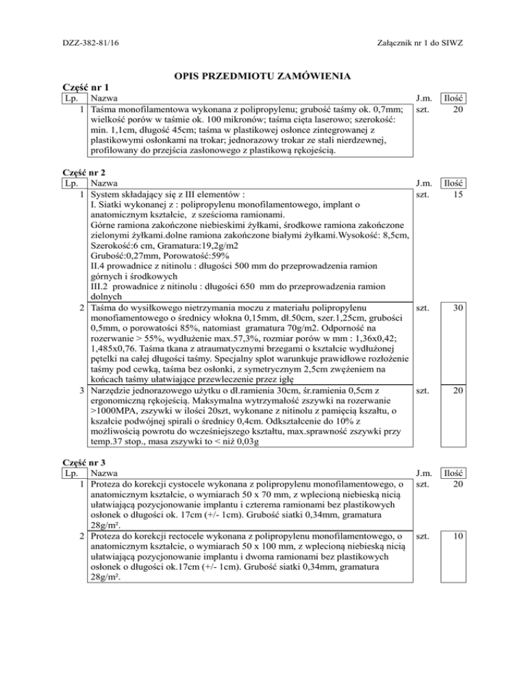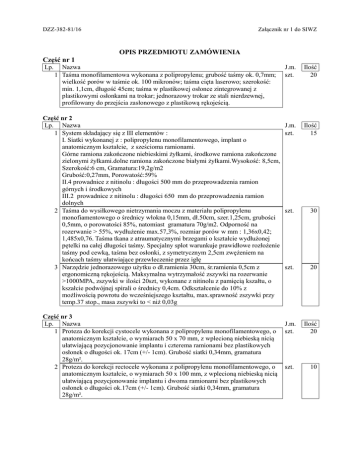 Załącznik nr 1 do SIWZ DZZ-382-81/16 OPIS PRZEDMIOTU ZAMÓWIENIA Część nr 1 Lp. Nazwa 1 Taśma monofilamentowa wykonana z polipropylenu; grubość taśmy ok. 0,7mm; wielkość porów w taśmie ok. 100 mikronów; taśma cięta laserowo; szerokość: min. 1,1cm, długość 45cm; taśma w plastikowej osłonce zintegrowanej z plastikowymi osłonkami na trokar; jednorazowy trokar ze stali nierdzewnej, profilowany do przejścia zasłonowego z plastikową rękojeścią. Część nr 2 Lp. Nazwa 1 System składający się z III elementów : I. Siatki wykonanej z : polipropylenu monofilamentowego, implant o anatomicznym kształcie, z sześcioma ramionami. Górne ramiona zakończone niebieskimi żyłkami, środkowe ramiona zakończone zielonymi żyłkami.dolne ramiona zakończone białymi żyłkami.Wysokość: 8,5cm, Szerokość:6 cm, Gramatura:19,2g/m2 Grubość:0,27mm, Porowatość:59% II.4 prowadnice z nitinolu : długości 500 mm do przeprowadzenia ramion górnych i środkowych III.2 prowadnice z nitinolu : długości 650 mm do przeprowadzenia ramion dolnych 2 Taśma do wysiłkowego nietrzymania moczu z materiału polipropylenu monofiamentowego o średnicy włokna 0,15mm, dł.50cm, szer.1,25cm, grubości 0,5mm, o porowatości 85%, natomiast gramatura 70g/m2. Odporność na rozerwanie > 55%, wydłużenie max.57,3%, rozmiar porów w mm : 1,36x0,42; 1,485x0,76. Taśma tkana z atraumatycznymi brzegami o kształcie wydłużonej pętelki na całej długości taśmy. Specjalny splot warunkuje prawidłowe rozłożenie taśmy pod cewką, taśma bez osłonki, z symetrycznym 2,5cm zwężeniem na końcach taśmy ułatwiające przewleczenie przez igłę 3 Narzędzie jednorazowego użytku o dł.ramienia 30cm, śr.ramienia 0,5cm z ergonomiczną rękojeścią. Maksymalna wytrzymałość zszywki na rozerwanie >1000MPA, zszywki w ilości 20szt, wykonane z nitinolu z pamięcią kszałtu, o kszałcie podwójnej spirali o średnicy 0,4cm. Odkształcenie do 10% z możliwością powrotu do wcześniejszego kształtu, max.sprawność zszywki przy temp.37 stop., masa zszywki to < niż 0,03g Część nr 3 Lp. Nazwa 1 Proteza do korekcji cystocele wykonana z polipropylenu monofilamentowego, o anatomicznym kształcie, o wymiarach 50 x 70 mm, z wplecioną niebieską nicią ułatwiającą pozycjonowanie implantu i czterema ramionami bez plastikowych osłonek o długości ok. 17cm (+/- 1cm). Grubość siatki 0,34mm, gramatura 28g/m². 2 Proteza do korekcji rectocele wykonana z polipropylenu monofilamentowego, o anatomicznym kształcie, o wymiarach 50 x 100 mm, z wplecioną niebieską nicią ułatwiającą pozycjonowanie implantu i dwoma ramionami bez plastikowych osłonek o długości ok.17cm (+/- 1cm). Grubość siatki 0,34mm, gramatura 28g/m². J.m. szt. Ilość 20 J.m. szt. Ilość 15 szt. 30 szt. 20 J.m. szt. szt. Ilość 20 10 DZZ-382-81/16 Załącznik nr 1 do SIWZ Część nr 4 Lp. Nazwa 1 Siatka - System do przezpochwowej naprawy przedniego defektu dna miednicy składający się z : siatki polipropylenowej monofilamentowej o anatomicznym kształcie i utkaniu heksagonalnym, - o gramaturze siatki 21g/m2, - porowatość siatki 93%. Siatka z możliwością fiksacji kompartmentu cenralnego do więzadeł krzyżowokolcowych oraz środkowego do łuku ścięgnistego lub powięzi zasłonowych. System umożliwia implantację siatki z jednego nacięcia pochwy, siatka w komplecie z 6 szwami niewchłanialnymi do wielorazowego narzędzia do fiksacji, rozmiar siatki duży 2 Siatka- System do przezpochwowej naprawy tylnego defektu dna miednicy składający się z: -siatki polipropylenowej monofilamentowej o anatomicznym kształcie i utkaniu heksagonalnym - gramatura siatki 21g/m2 - porowatość siatki 93% - siatka z możliwością fiksacji kompartmentu centralnego do więzadeł krzyżowo kolcowych oraz środkowego do łuku ścięgnistego lub powięzi zasłonowych - system umożliwiający implantację siatki z jednego nacięcia pochwy - siatka w komplecie z 4 szwami niewchłanialnymi do wielorazowego narzędzia do fiksacji - rozmiar siatki standard 3 Ładunki do wielorazowego narzędzia do fiksacji siatki, niewchłanialne, kolor zielony. 4 Taśma uniwersalna do leczenia wysiłkowego nietrzymania moczu u kobiet z dostępu przezzasłonowego jak i nadłonowego, taśma wykonana z polipropylenu monofilamentowego, środek taśmy wycięty w kształcie wydłużonego ośmioboku zabezpieczającego przed erozją cewki. długość taśmy 450mm w osłonce ułatwiająca implantację . aśma przystosowana do użycia z prowadnicami wielorazowymi do dostępu przezzasłonowego jak i nadłonowego Część nr 5 Lp. Nazwa 1 Taśma do chirurgicznego leczenia wysiłkowego nietrzymania moczu, wykonana z przędzy monofilamentowej polipropylenowej o śr.0,16mm, porowatość taśmy 70%. Masa powierzchniowa 65gm2, dł.taśmy bez uchwytów45cm, z uchwytami 95 cm, szer. 11mm, grubość 0,65mm. Uchwyty mocujące wykonane z przędzy jednowókienkowej polipropylenowej o dł. 25cm, Taśma do obu metod oper.TOT i TVT. Taśma w plastikowej osłonce. Część nr 6 Lp. Nazwa 1 Siatka przepuklinowa monofilamentowa, polipropylenowa, z niebieskimi pasami pozycjonującymi ,o wadze 36g/m2 , grubości 0,39 mm, wielkości porów 1,0 mm o kształcie prostokątnym, o wymiarach 7,5 x 15 cm. 2 Siatka przepuklinowa monofilamentowa, polipropylenowa, z niebieskimi pasami pozycjonującymi o wadze 36g/m2 , grubości 0,39 mm, wielkości porów 1,0 mm o kształcie prostokątnym, o wymiarach 10 x 15 cm. 3 Siatka przepuklinowa monofilamentowa, polipropylenowa,z niebieskimi pasami pozycjonującymi o wadze 36g/m2 , grubości 0,39 mm, wielkości porów 1,0 mm J.m. szt. Ilość 30 szt. 15 szt. 15 szt. 5 J.m. szt. Ilość 25 J.m. szt. Ilość 20 szt. 100 szt. 20 DZZ-382-81/16 4 5 6 7 Załącznik nr 1 do SIWZ o kształcie prostokątnym, o wymiarach 6 x 14 cm. Jednowarstwowa, transparentna, nieadhezyjna siatka chirurgiczna do zaopatrywania przepuklin metodą laparoskopową lub klasyczną do impl